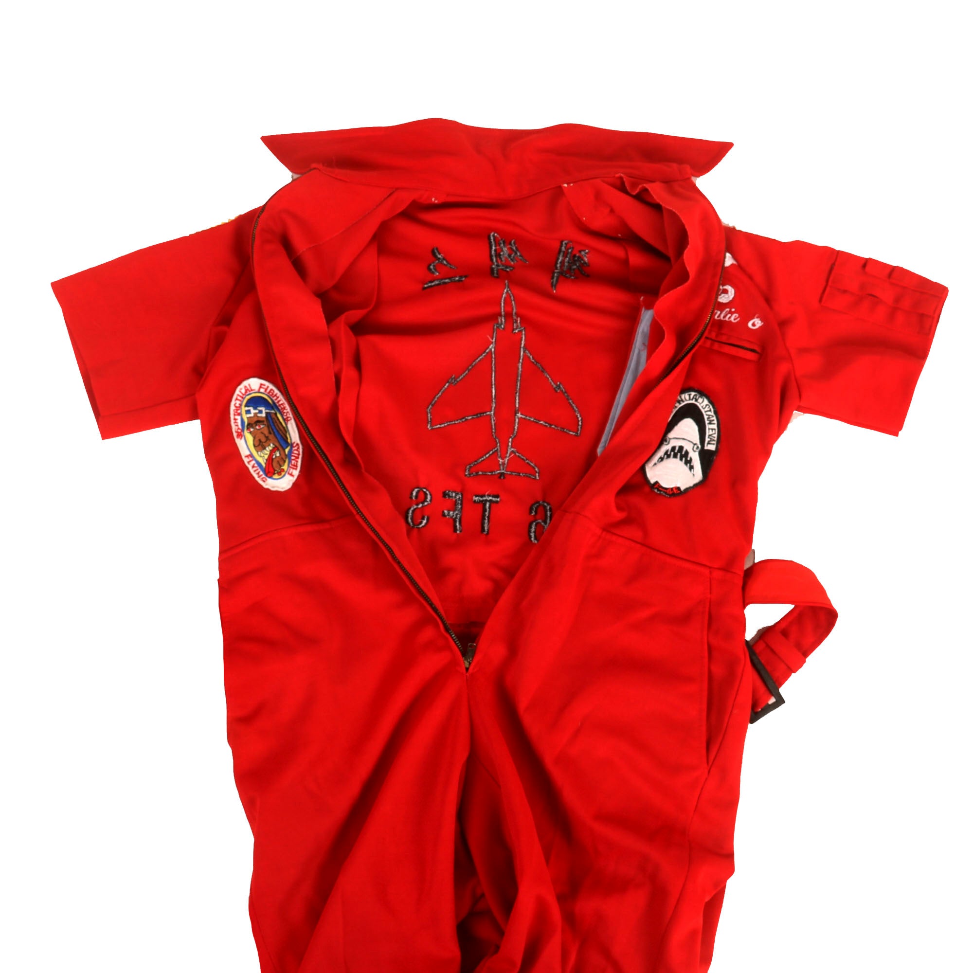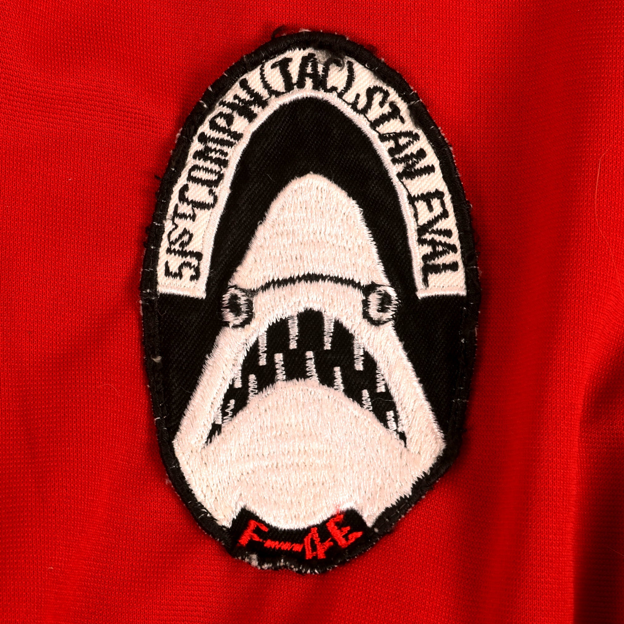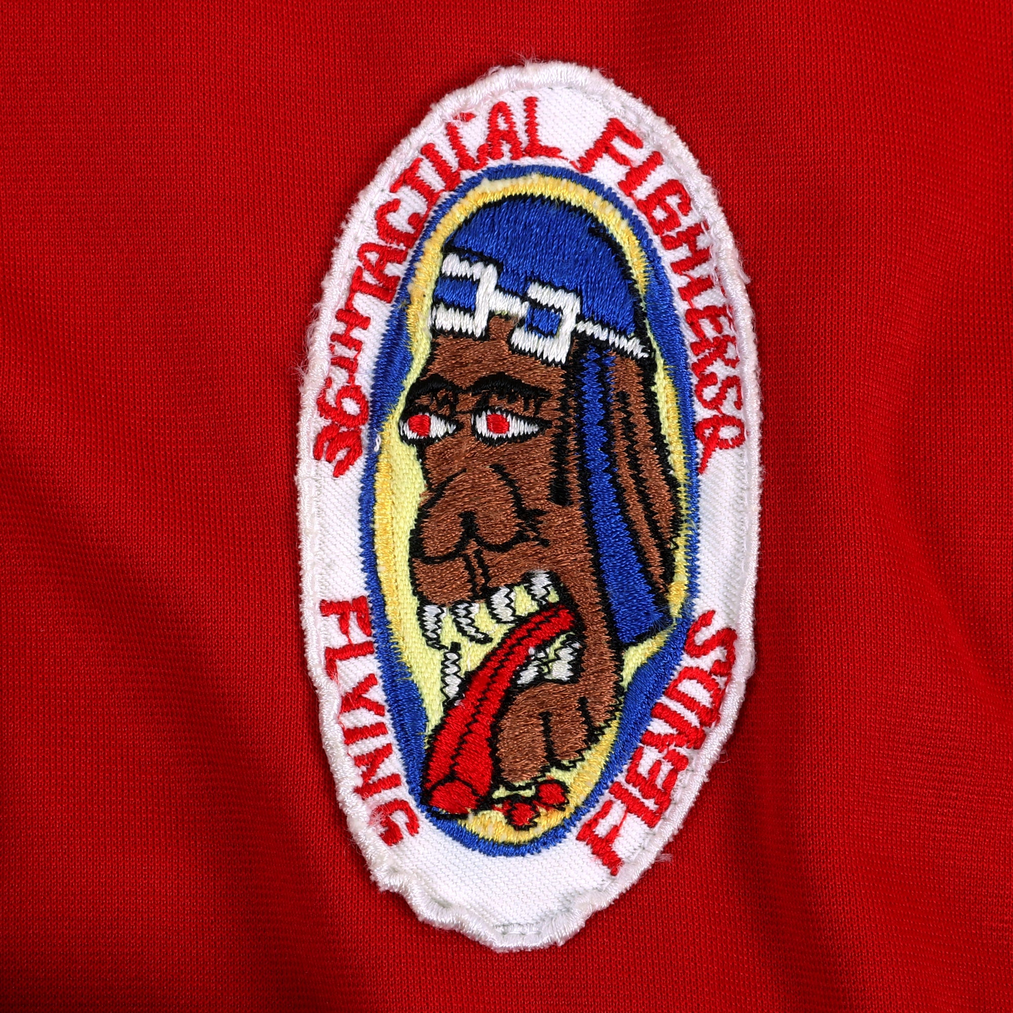 This is without a doubt the best party suit we have ever offered. The suit is entirely red with flags for the U.S.A. and South Korea on the shoulders, with an F4 Fighter Jet patch on the right breast and the pilot’s wings, paratrooper wings, and name “Charlie O“ on the left breast. Below the right breast is the patch for the 36th Tactical Fighter Squadron featuring a “Flying Fiend” who appears to be tweaking. Below the left breast is the patch for the 51st Composite Wing, Tactical, Standardization/Evaluation F-4E, which features a shark swimming upwards akin to the “Jaws” movie poster.