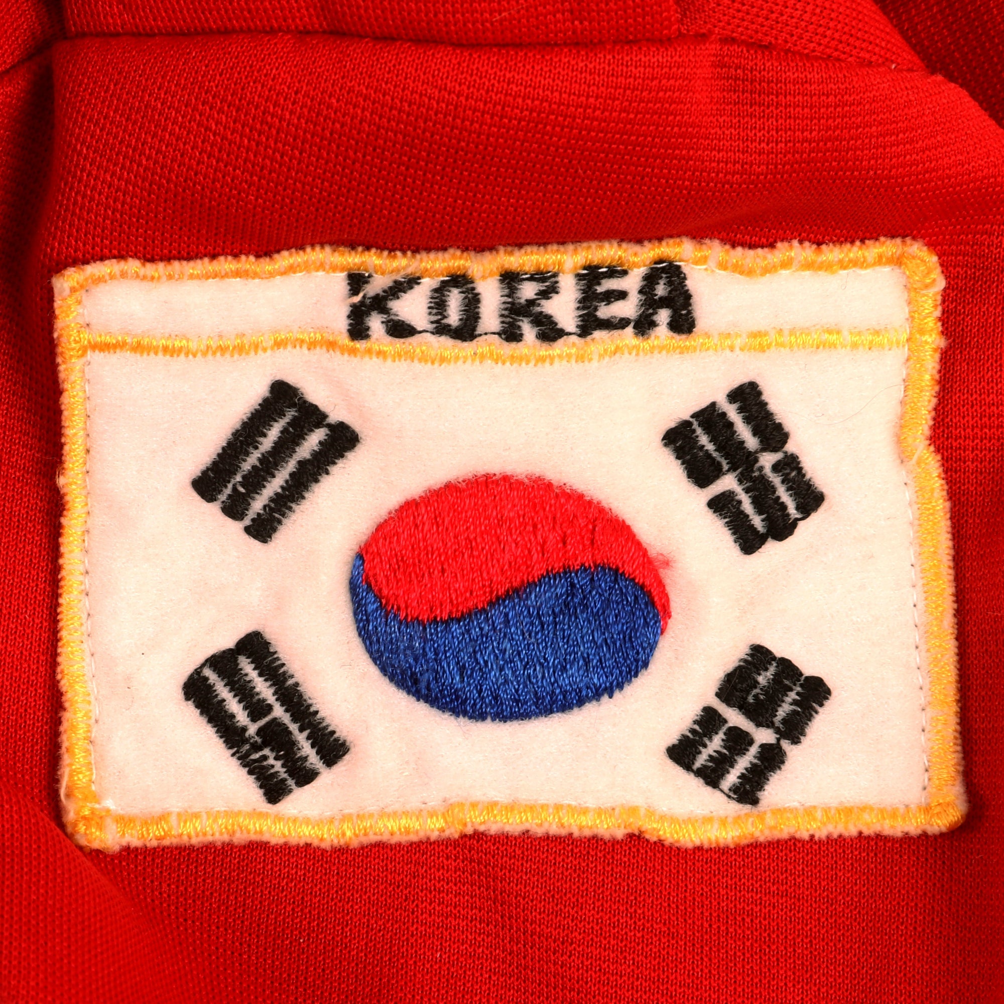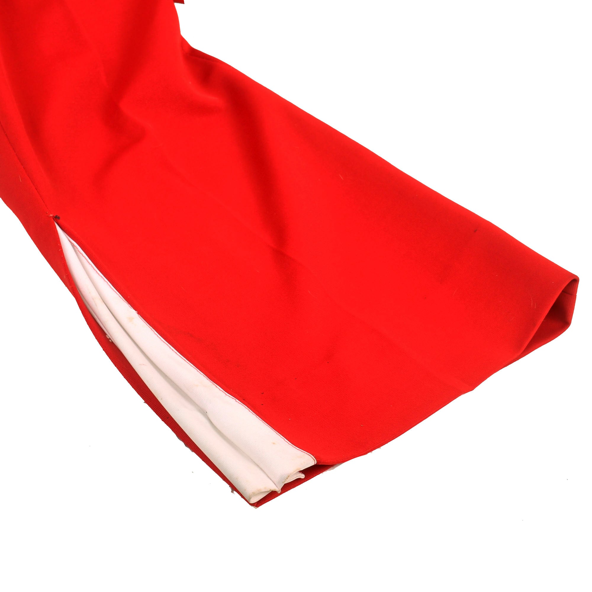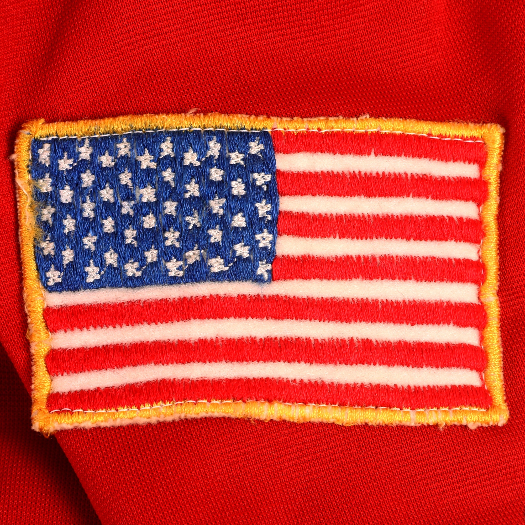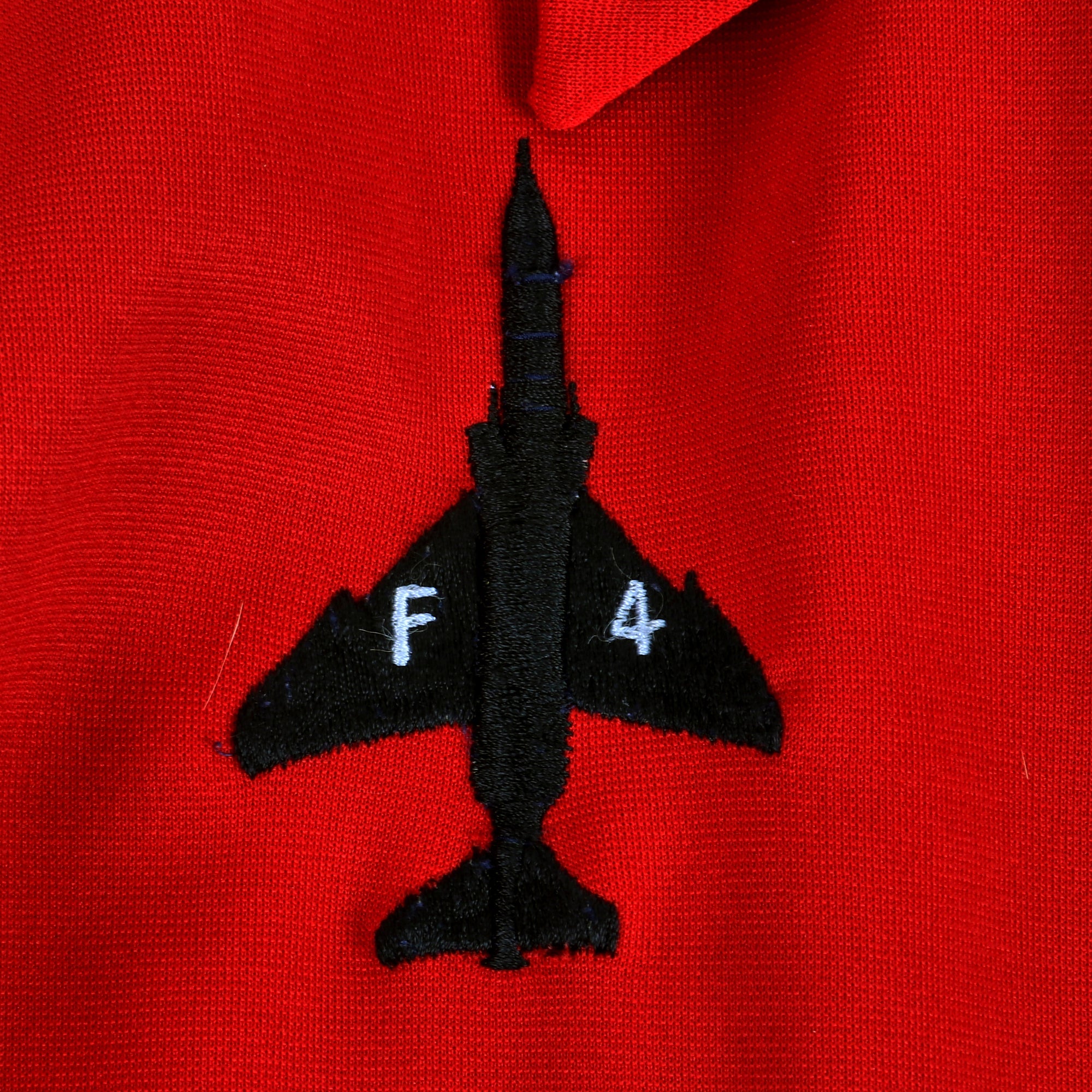 This is without a doubt the best party suit we have ever offered. The suit is entirely red with flags for the U.S.A. and South Korea on the shoulders, with an F4 Fighter Jet patch on the right breast and the pilot’s wings, paratrooper wings, and name “Charlie O“ on the left breast. Below the right breast is the patch for the 36th Tactical Fighter Squadron featuring a “Flying Fiend” who appears to be tweaking. Below the left breast is the patch for the 51st Composite Wing, Tactical, Standardization/Evaluation F-4E, which features a shark swimming upwards akin to the “Jaws” movie poster.