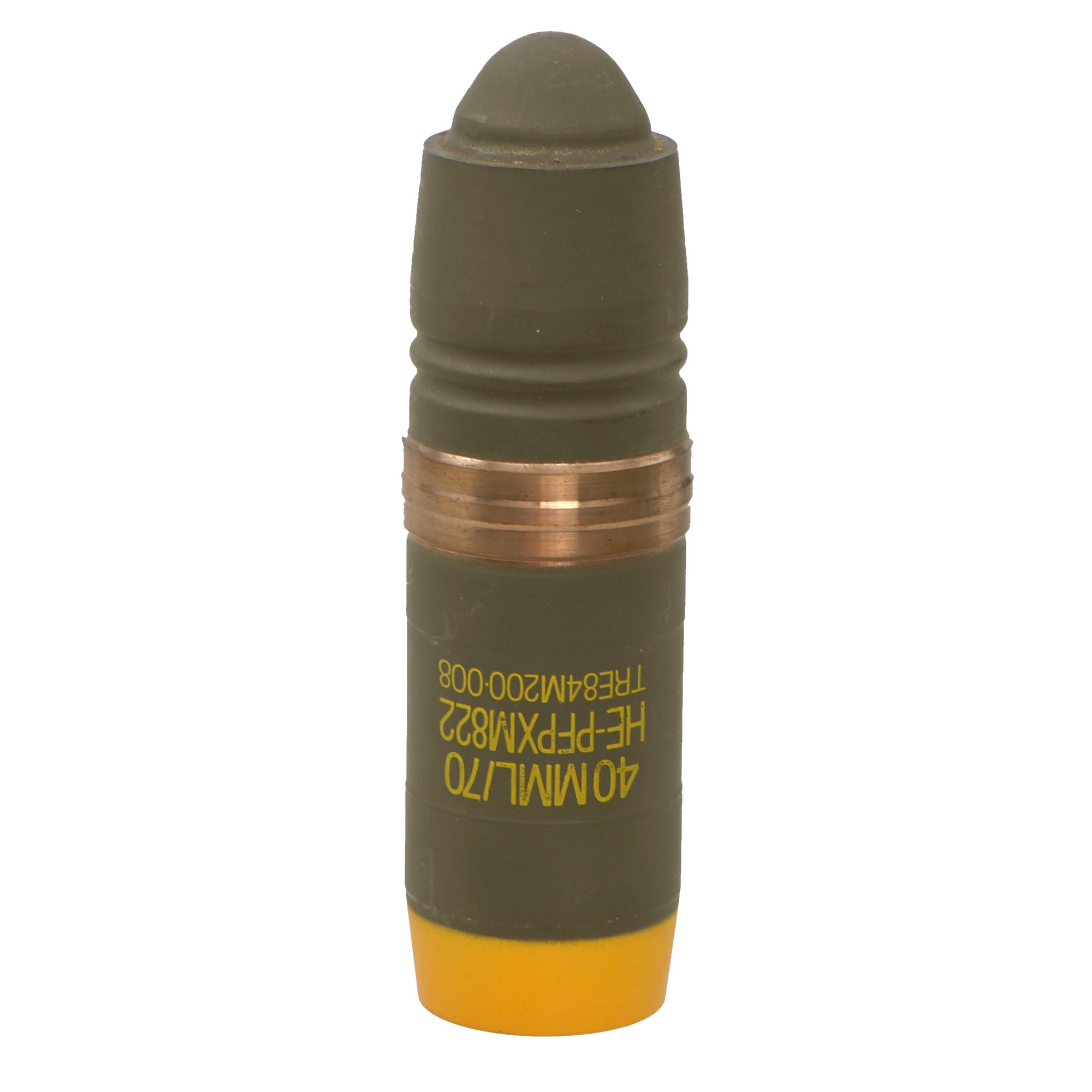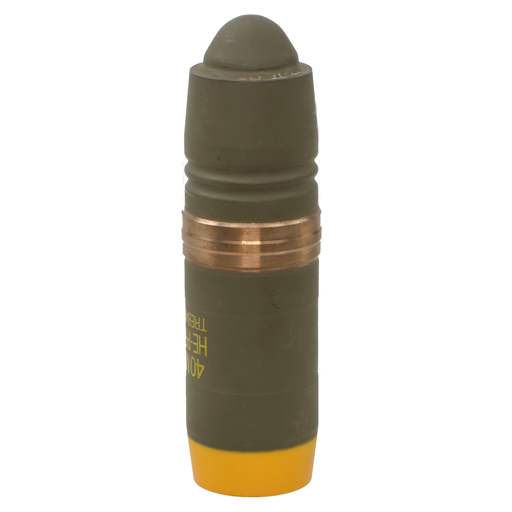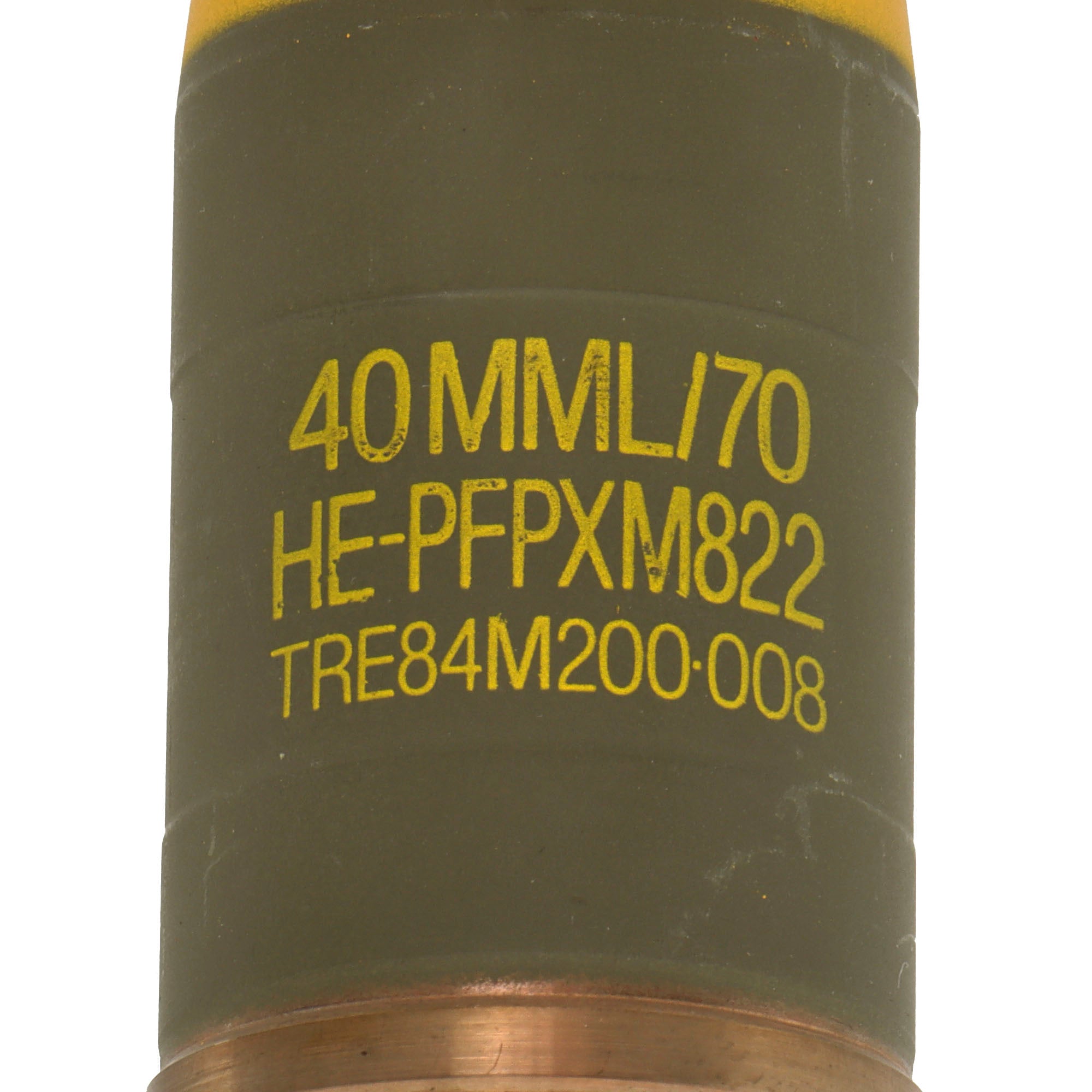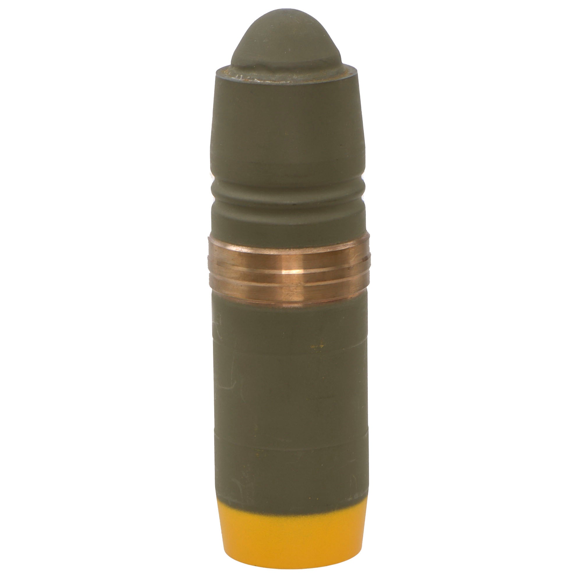 This is a great New/Old Stock example of a projectile body for use with the Bofors 40 mm Automatic Gun L/70. This round is missing the payload which would be a pointed steel tip protruding from the yellow-painted end. In its current configuration, it measures 5 ⅝” long and retains markings: