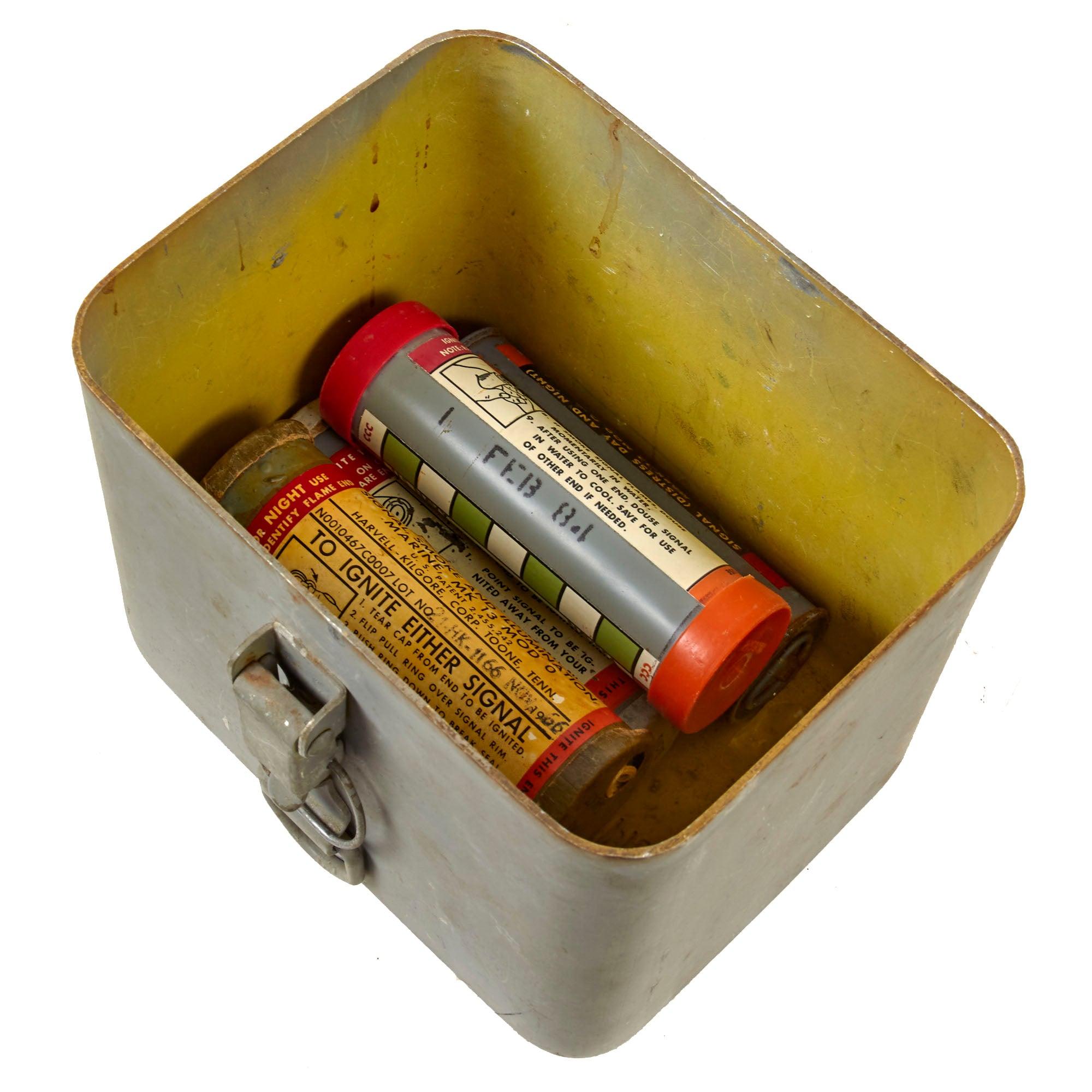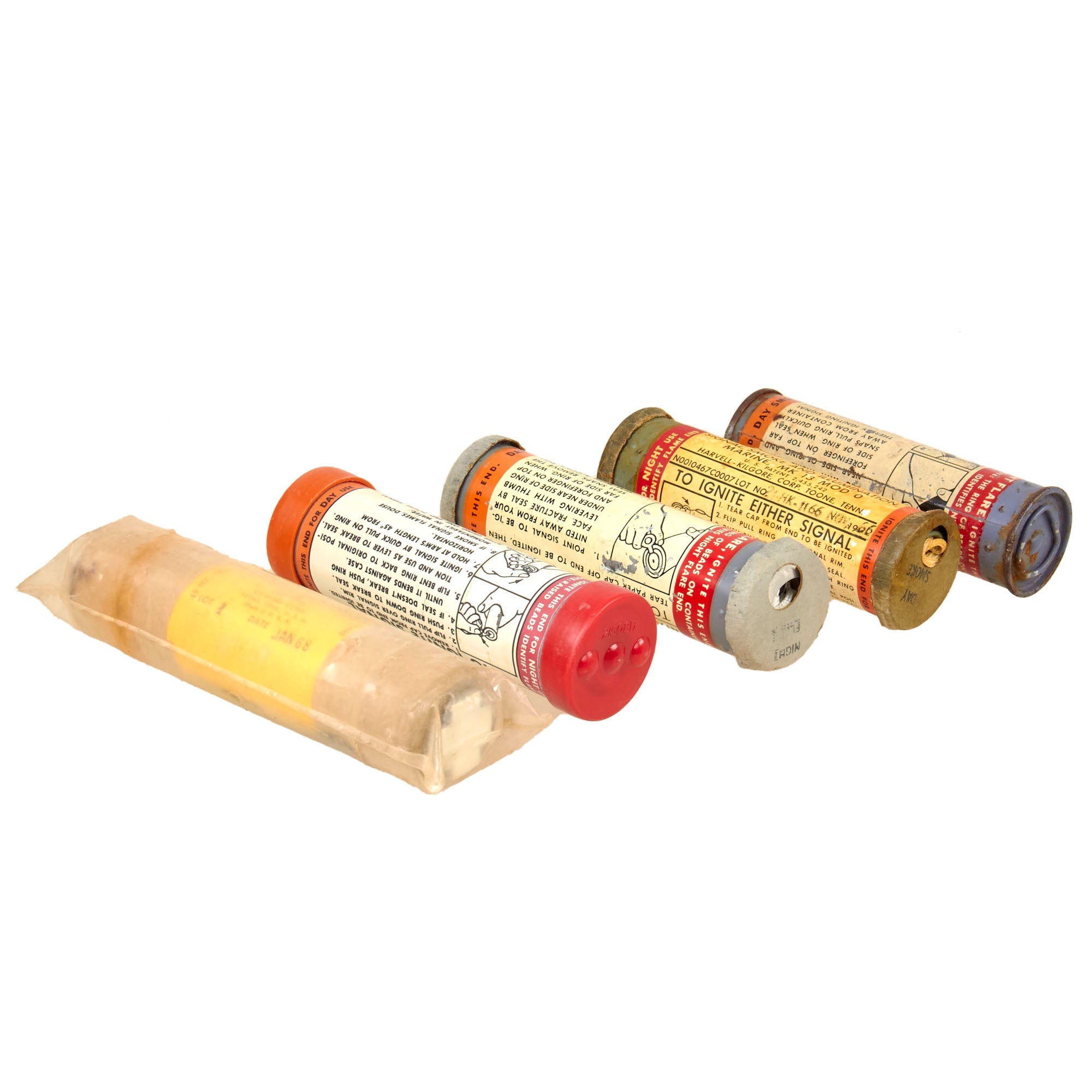 This is an outstanding lot of five Mark 13 Mod 0 signal distress flares dating from 1947-1984, with four being perfect for Vietnam War issue. They come in an original storage case marked on the lid: