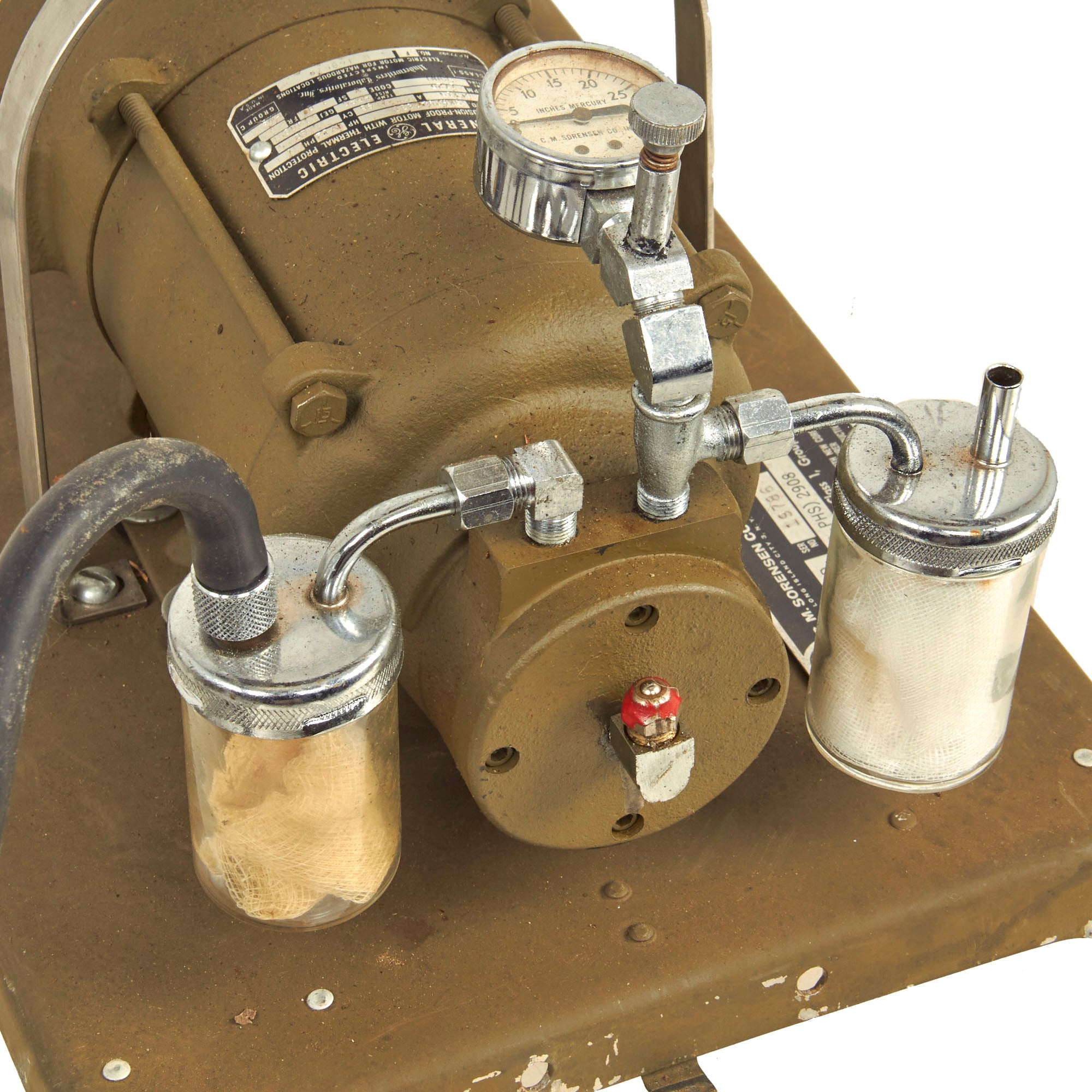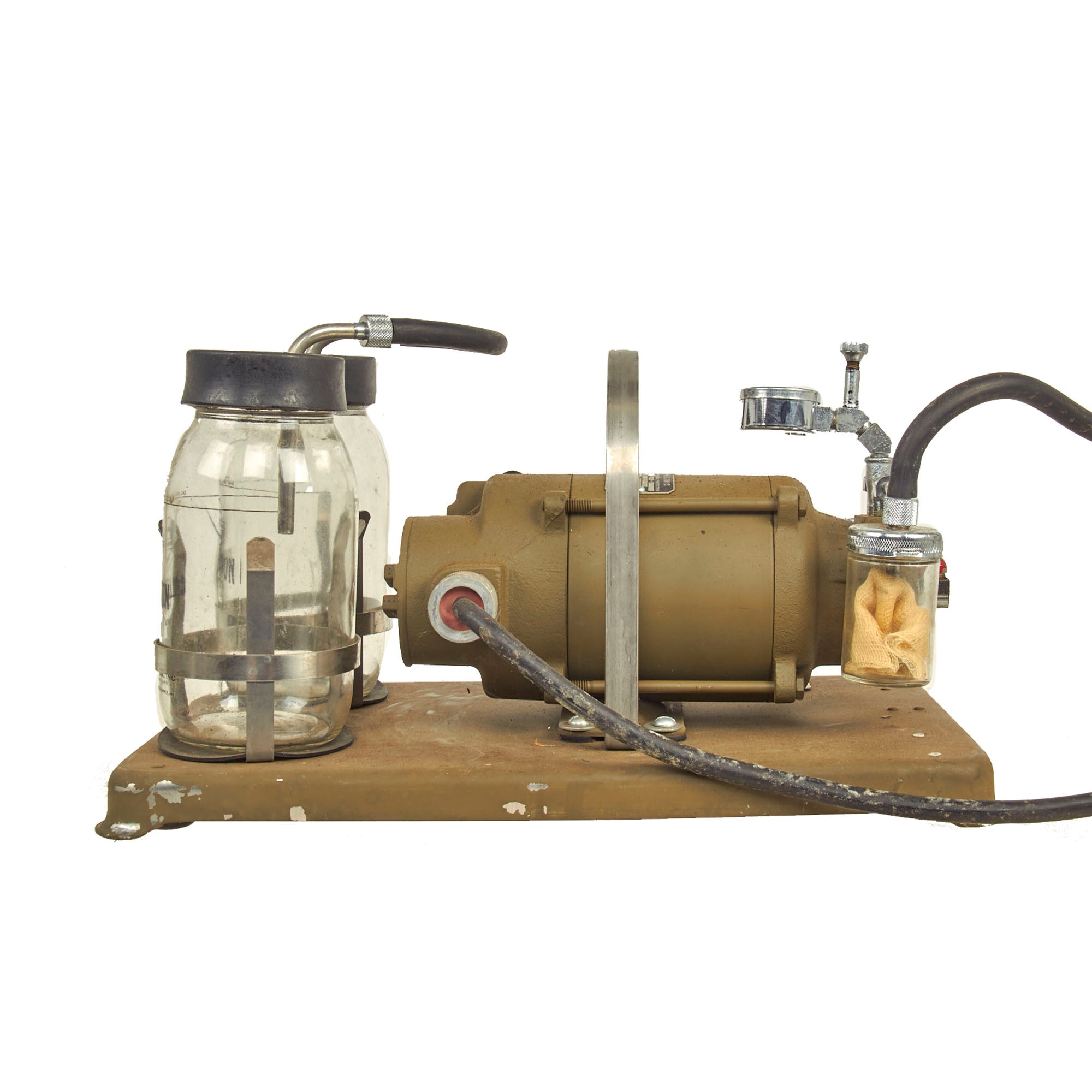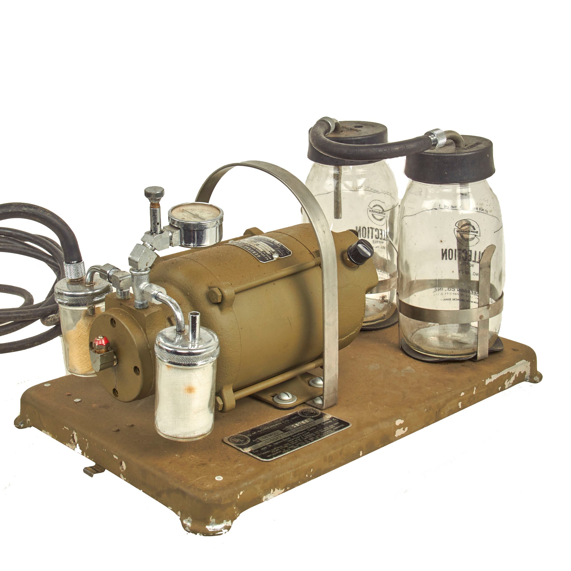 Original Item: Only One Available. Developed in January 1963, these units were used for surgeries at Mobile Army Surgical Hospitals throughout the Vietnam war. NSN 6515-00-299-8337 is is a portable, self-contained, electrically powered item capable of long term constant suction. It is used in operating rooms during surgical procedures and emergency care of the patient. Includes a power cord, circuit breaker, electric on/off switch, primary voltage select switch, motor pump with both suction and pressure connectable ports, vacuum regulator, vacuum gage, drainage bottles, drainage tube, and other related items. Transit box measures approximately Size: 10" x 16" x 12".