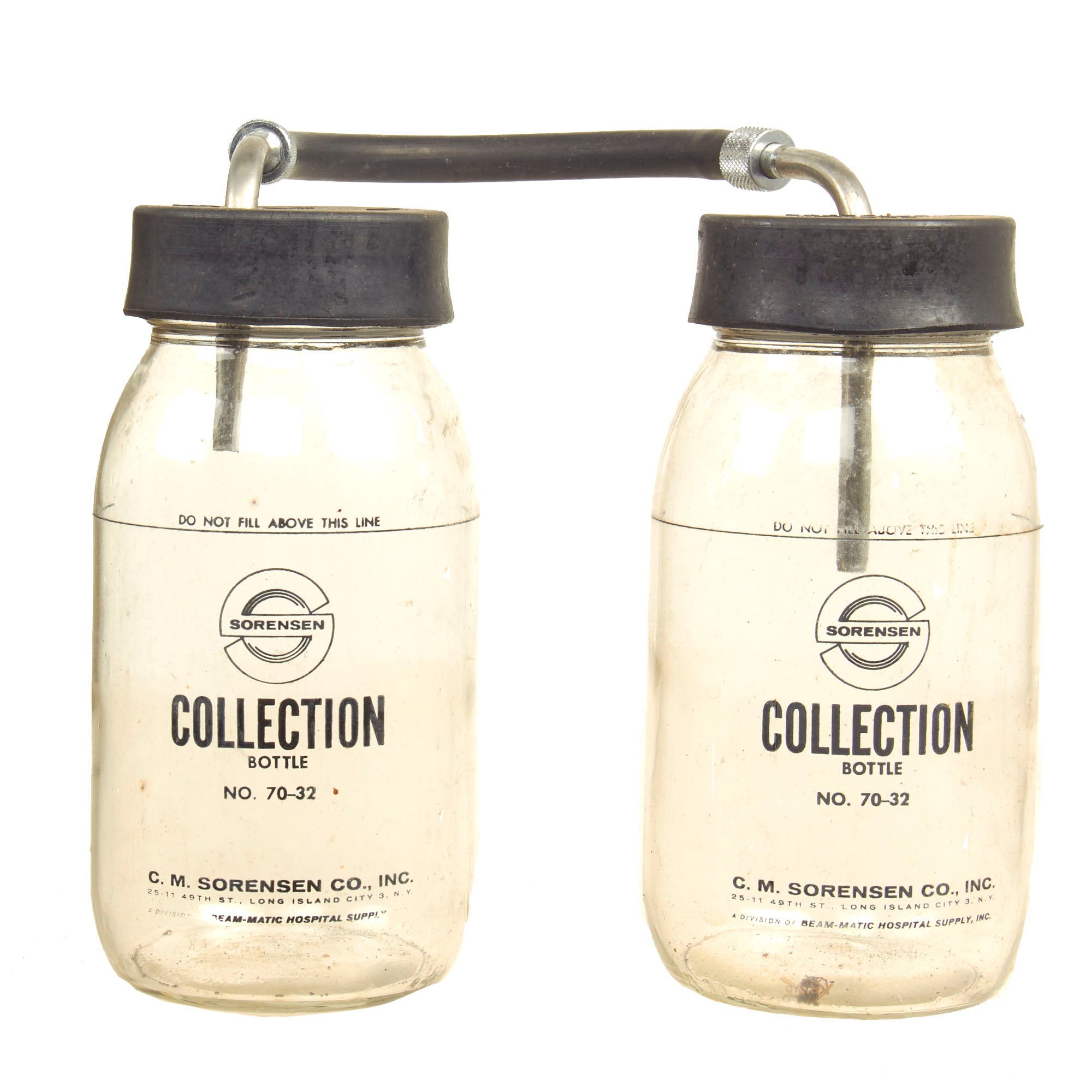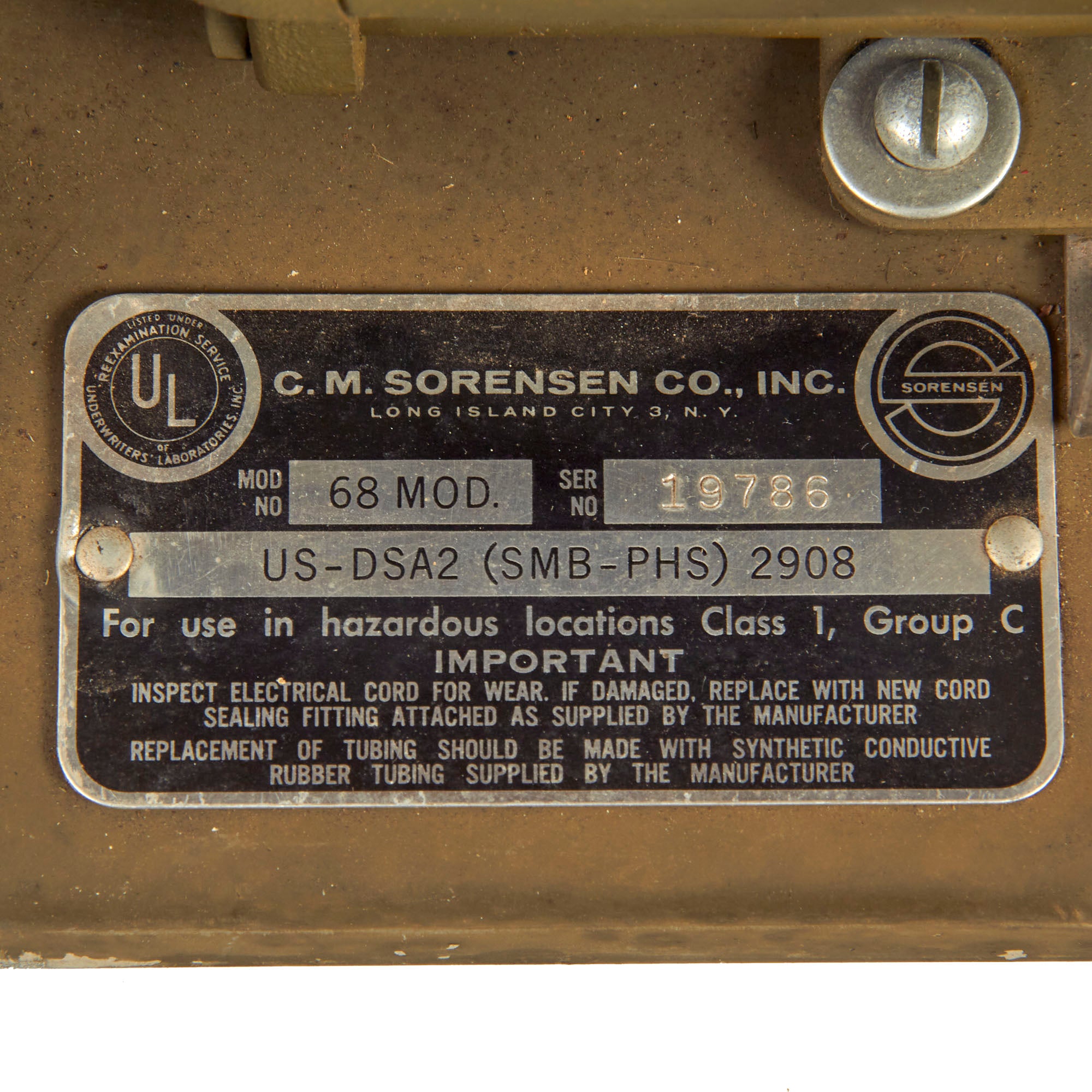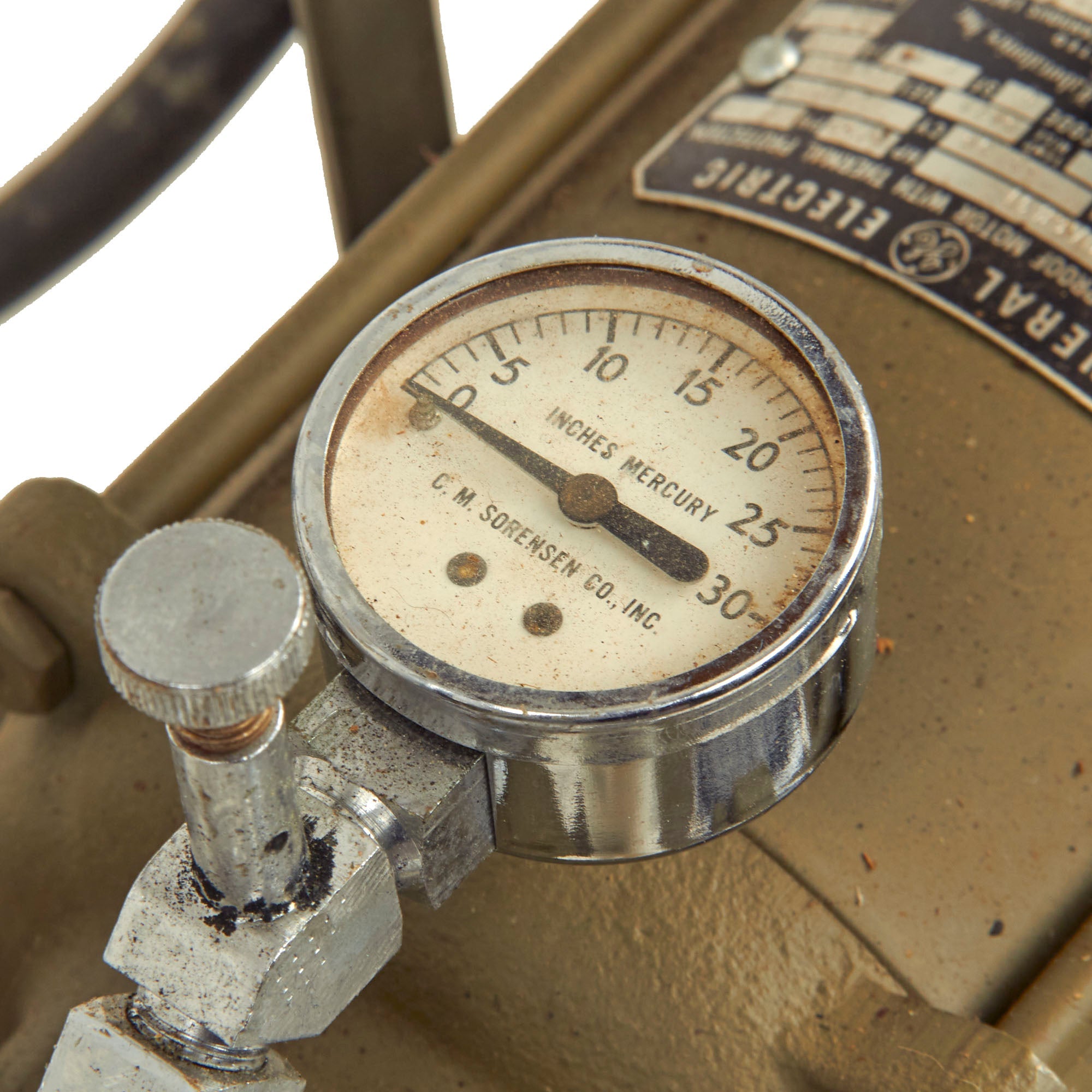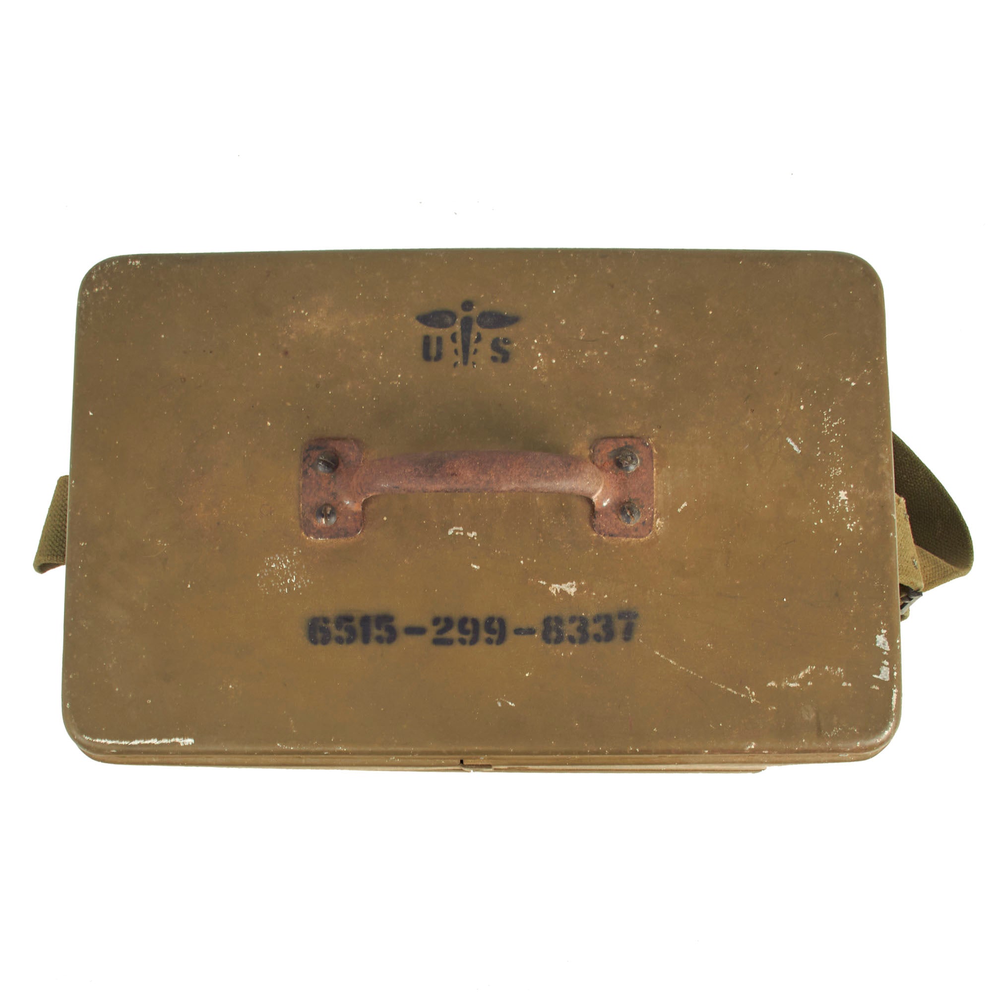 Original Item: Only One Available. Developed in January 1963, these units were used for surgeries at Mobile Army Surgical Hospitals throughout the Vietnam war. NSN 6515-00-299-8337 is is a portable, self-contained, electrically powered item capable of long term constant suction. It is used in operating rooms during surgical procedures and emergency care of the patient. Includes a power cord, circuit breaker, electric on/off switch, primary voltage select switch, motor pump with both suction and pressure connectable ports, vacuum regulator, vacuum gage, drainage bottles, drainage tube, and other related items. Transit box measures approximately Size: 10" x 16" x 12".