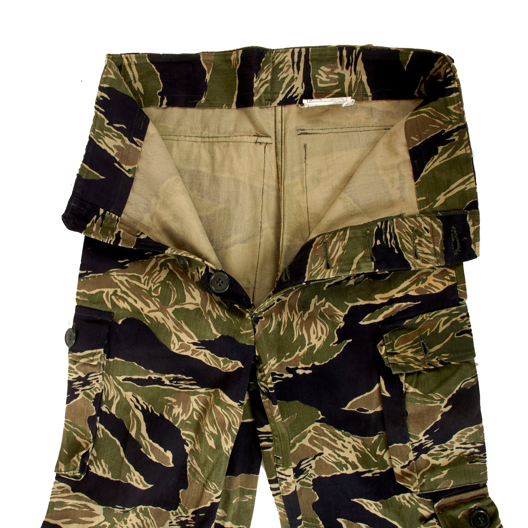 Original Item: Only One Available. Now this is a lovely pair of Tiger Stripe uniform trousers! There are more than 25 patterns of Tigerstripe but the most sought after by collectors, is the gold Advisor Sparse pattern (ADS). Another is the John Wayne Dense pattern (JWD). The JWD pattern is so named because it was used in John Wayne's movie, 'The Green Berets'. The uniforms in the film were made from material that was bought in Vietnam and shipped back to the States for manufacture.