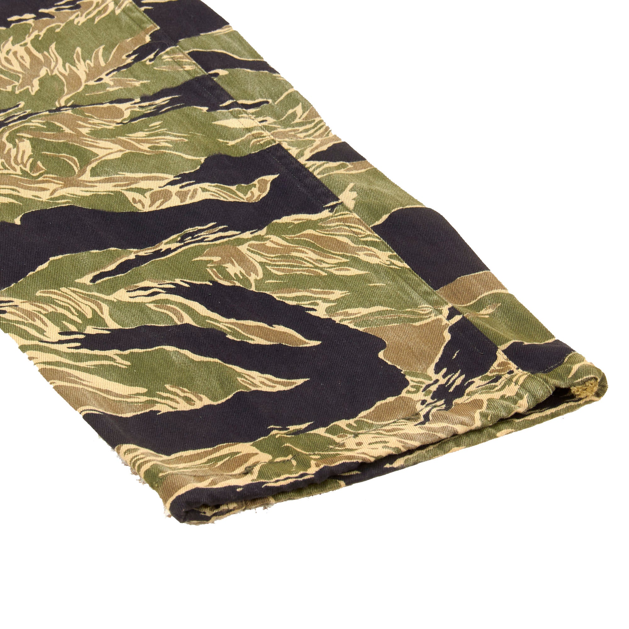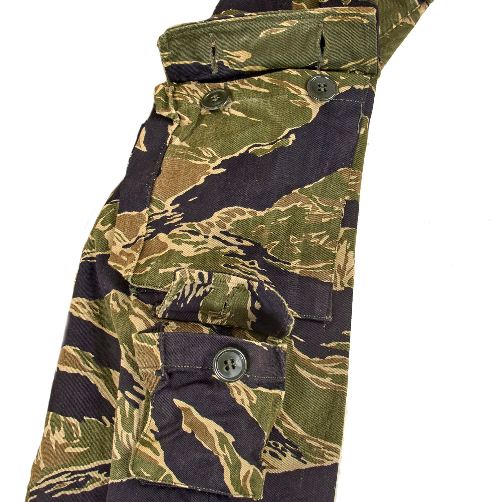 It is easy to understand how this pattern got its name from its bold black stripes, which mimic those of a tiger. The combination of green, brown and black stripes provided near perfect camouflage for a jungle environment with its light and shade. It was made using a screen-printing process, which is why it can sometimes appear smudged. The pattern was adapted from the black and green "Lizard pattern", used by the French during their war in Indochina.