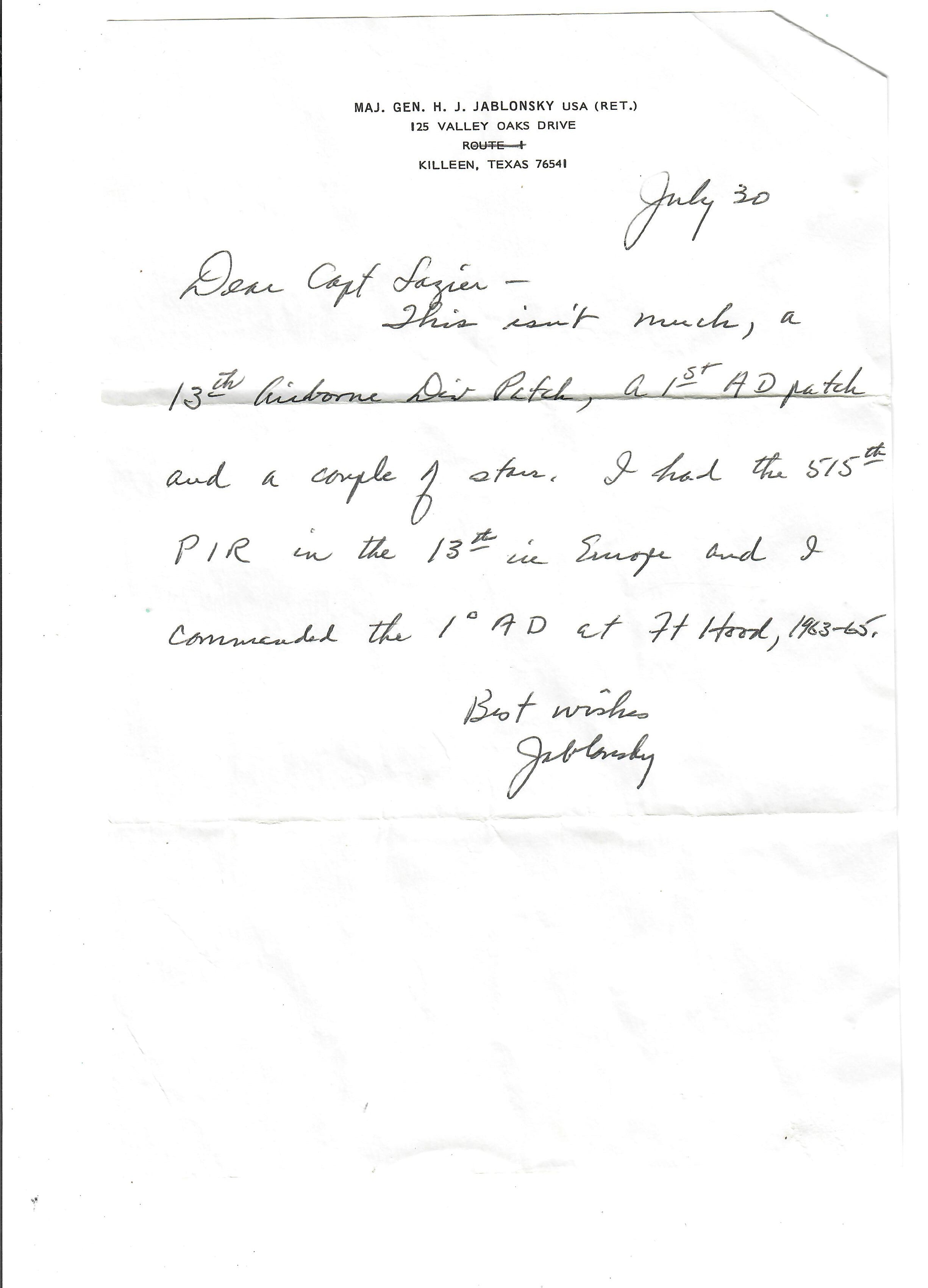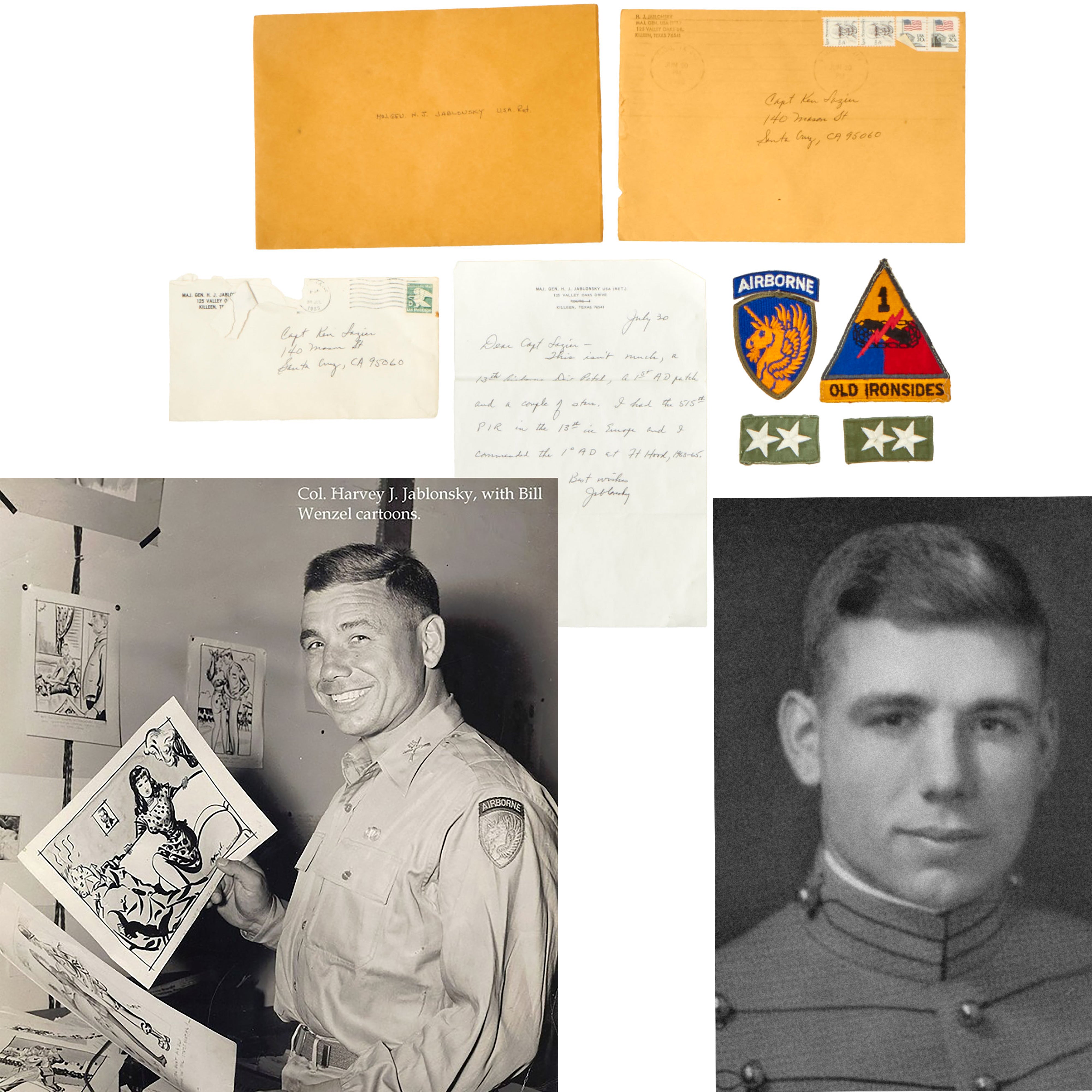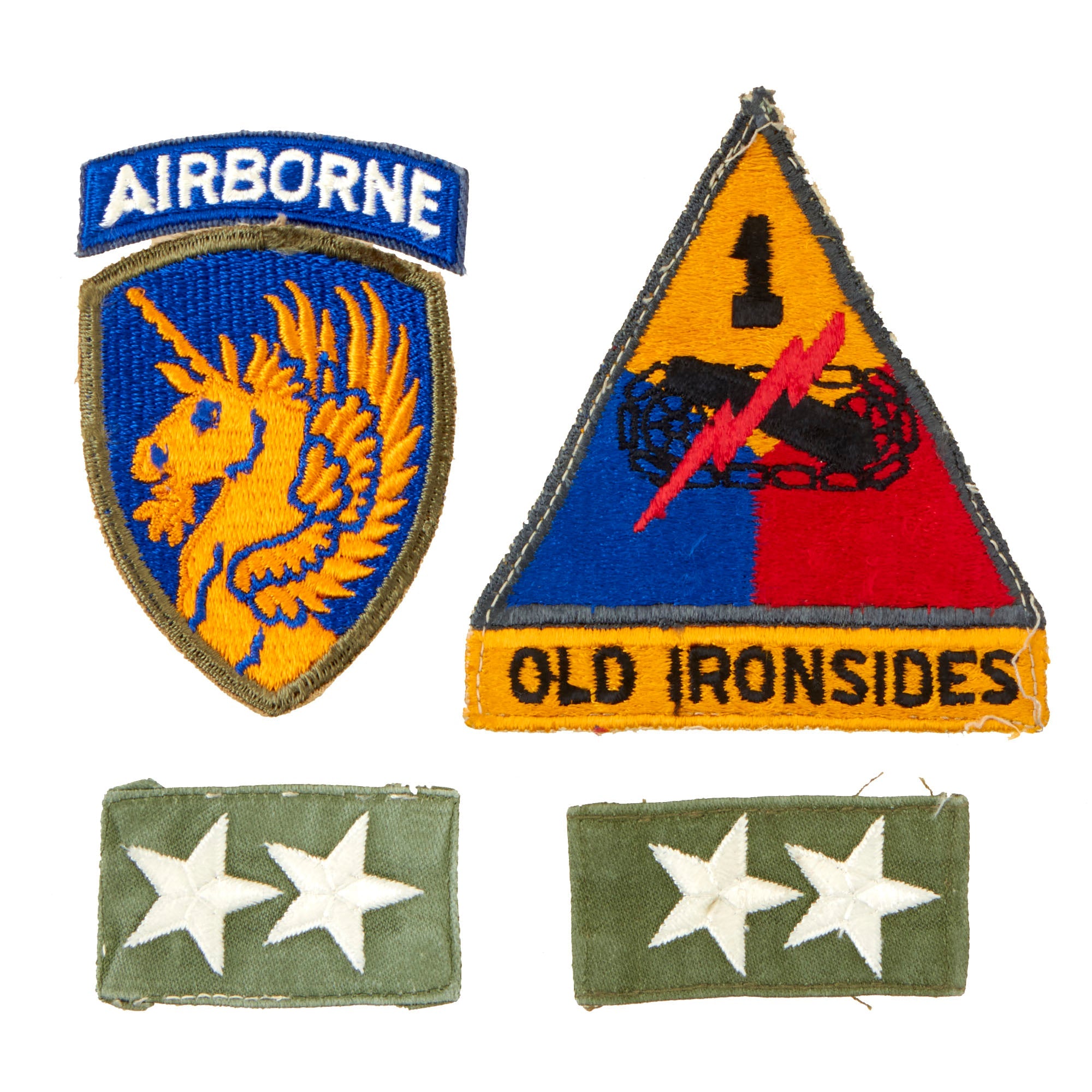 Original Item. One-of-a-Kind. This is a tremendous patch group having belonged to Major General Harvey Jabo Jablonsky, a veteran of World War II, the Korean War, and the Vietnam War, as well as an American Football player. The group includes a pair of his Major General star patches, an “Old Ironsides” Armored patch, and a 13th Airborne Division patch, as well as a letter of provenance on Jablonsky’s letterhead.