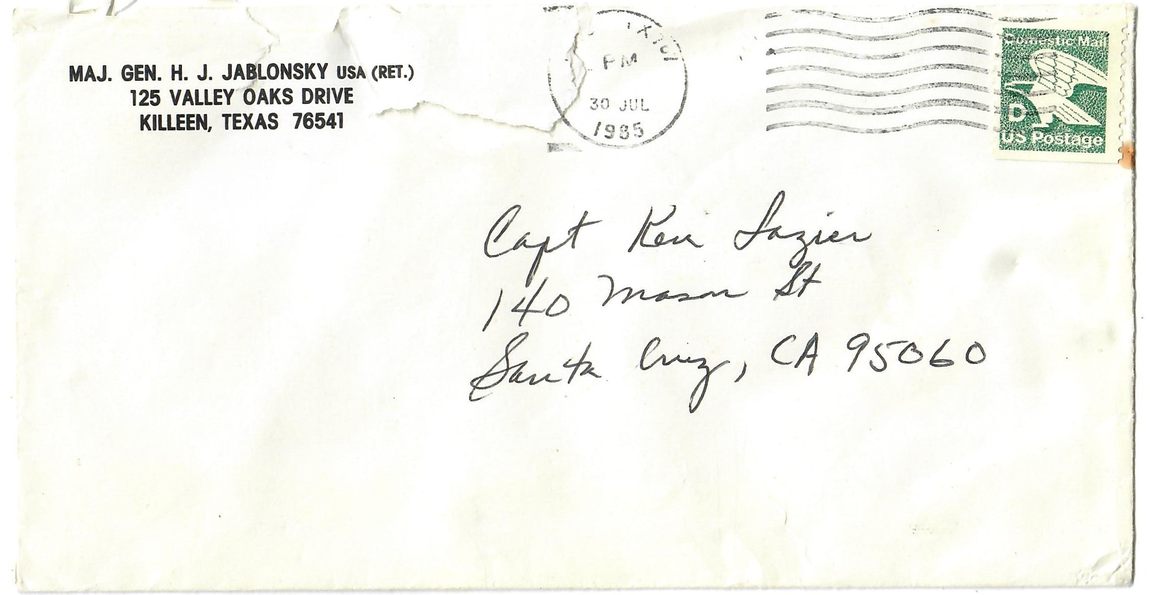 The letter, which is postmarked July 30, 1985, is to Kenneth Lazier, a well-known collector of General ephemera during the 1970s and 1980s. The group is in great shape, the airborne banner is taped to the back of the 19th Airborne Divison patch. The letter is in good shape and comes with its original postal envelope and the small parcel that Jablonsky sent the patches to Lazier in. A great group ready for further research and display!