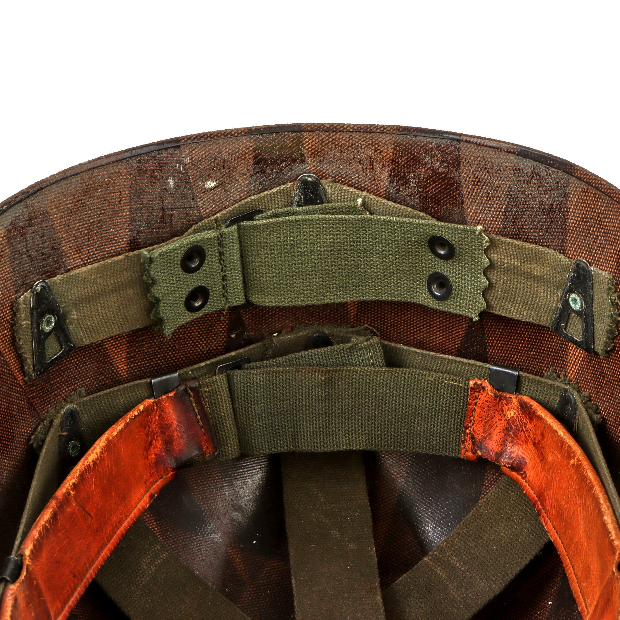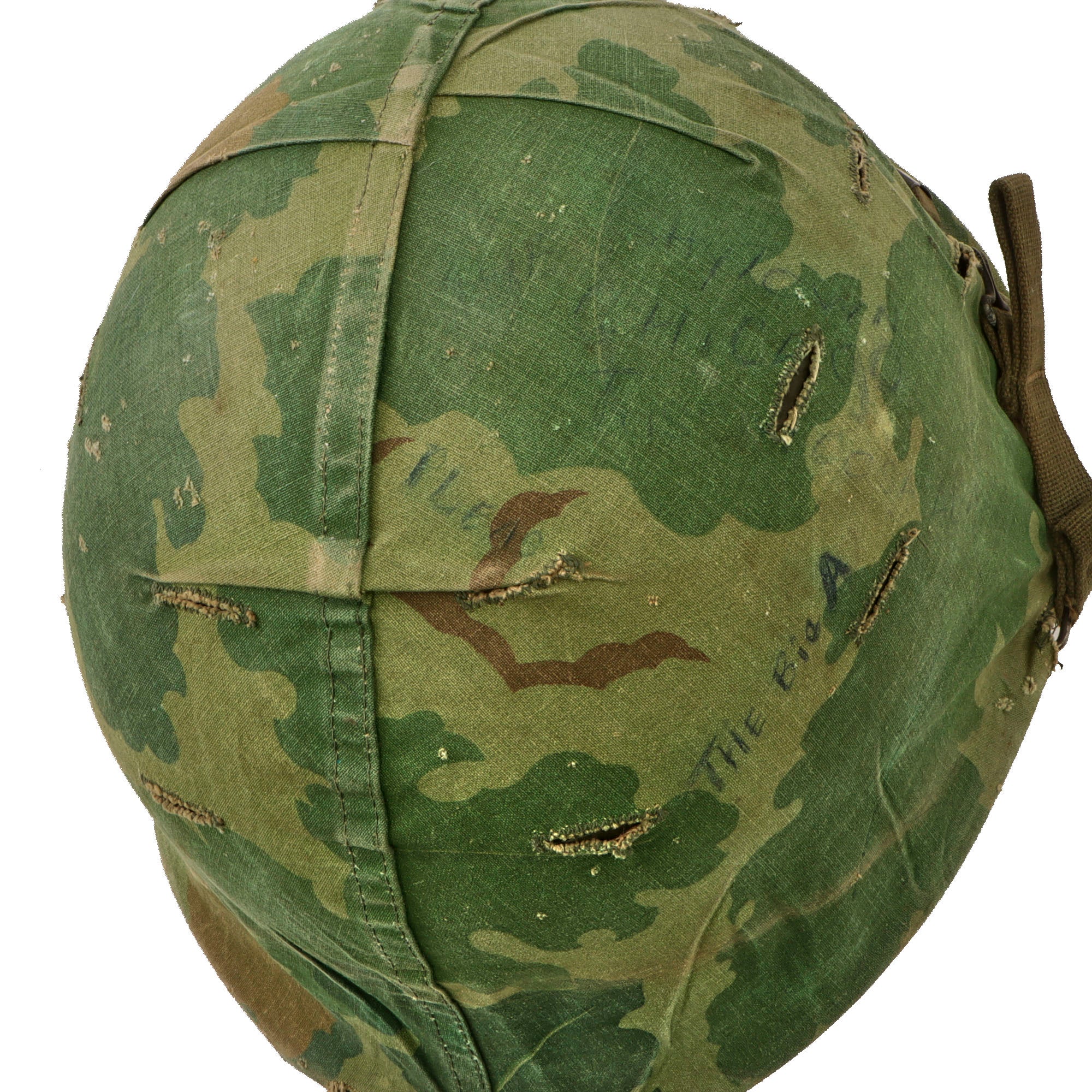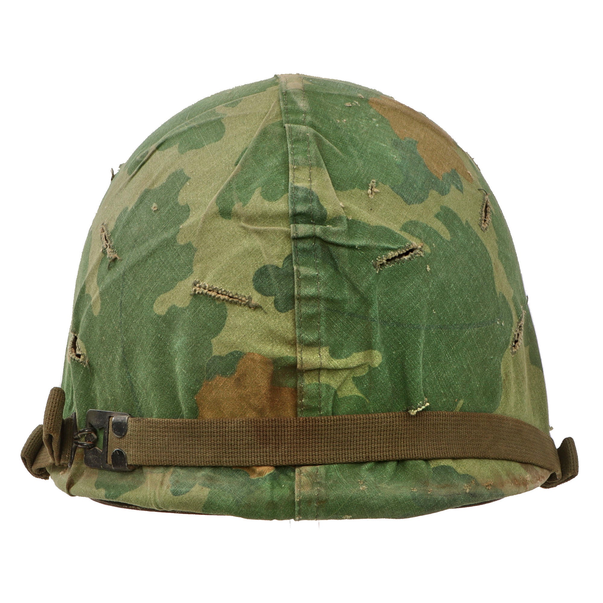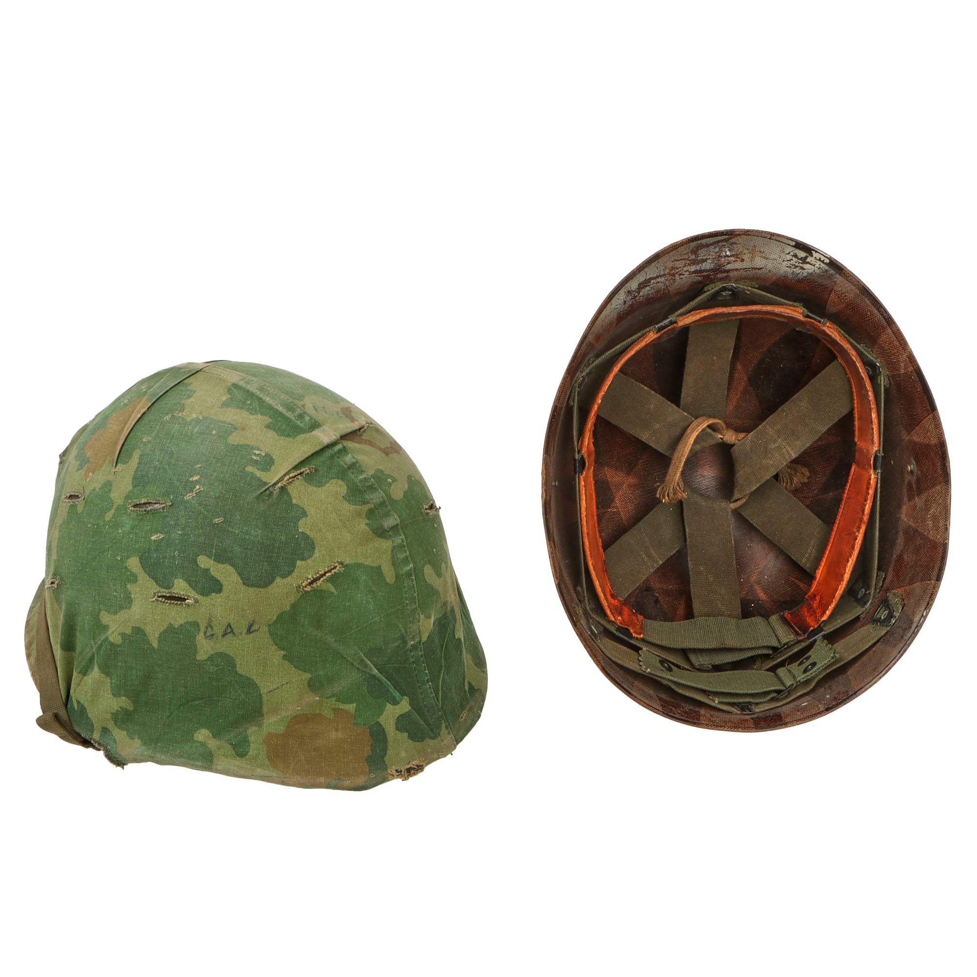 The helmet, cover, shell, and liner are all correct for a Vietnam war helmet. The helmet comes complete with high pressure Vietnam War era liner, that is only marked with a 1 on the interior crown, no maker mark.