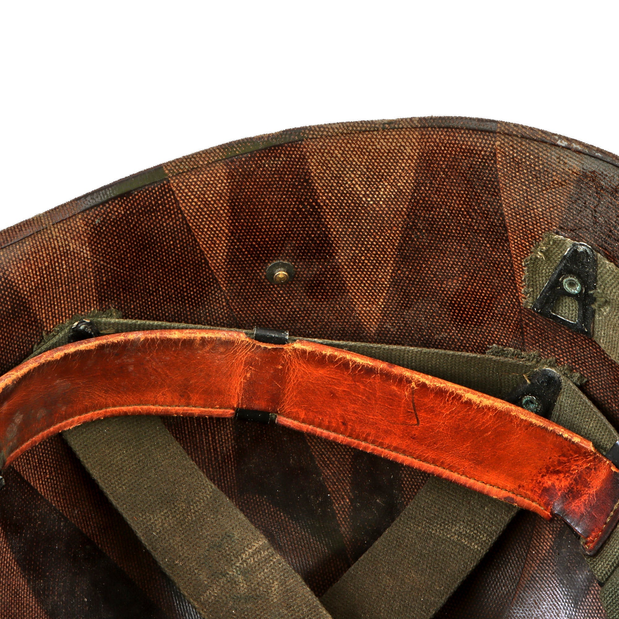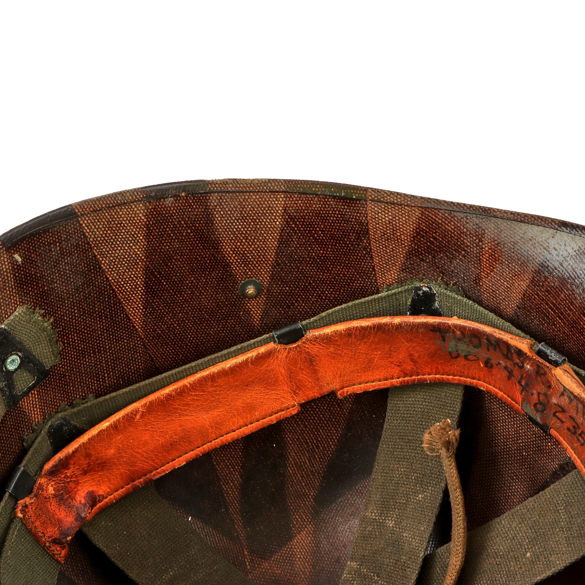 It is equipped with a standard Reversible Camouflage cover, which has a contract code but no date. It no longer retains the elastic band but this isn’t uncommon to see missing. The graffiti that is present on the cover is entirely original to the helmet, and includes a set of initials, G.A.L., and a few other markings including “THE BIG A”, and “PLEAD” at the top. Then there are some locations including “SHYTOWN / CHICAGO”, Shytown being a phonetic spelling of “Chi-Town”, a nickname for Chicago. These is some tearing along the edge of the cover.