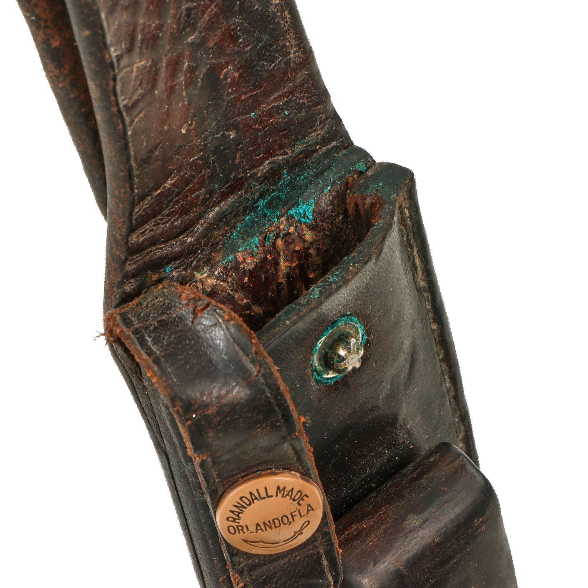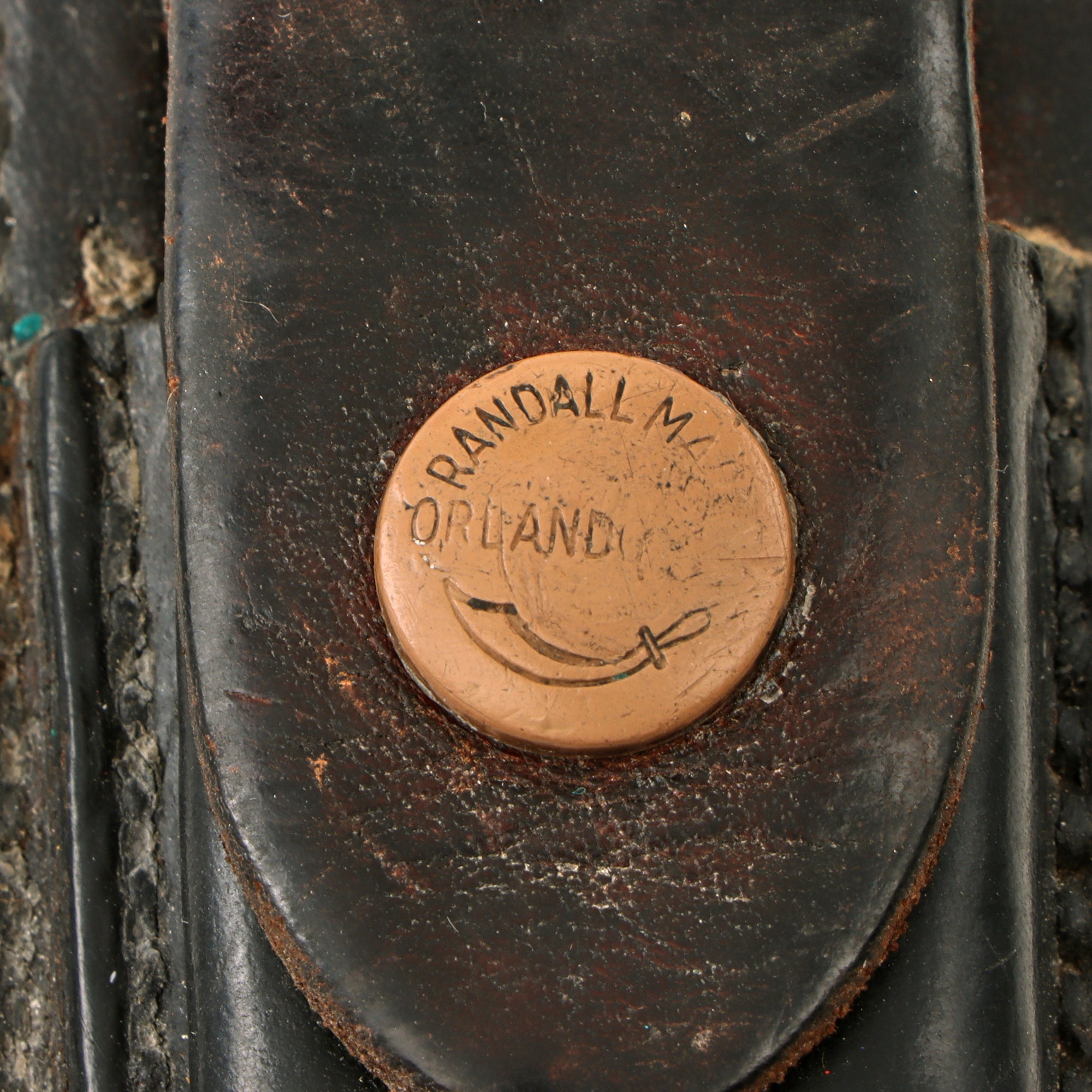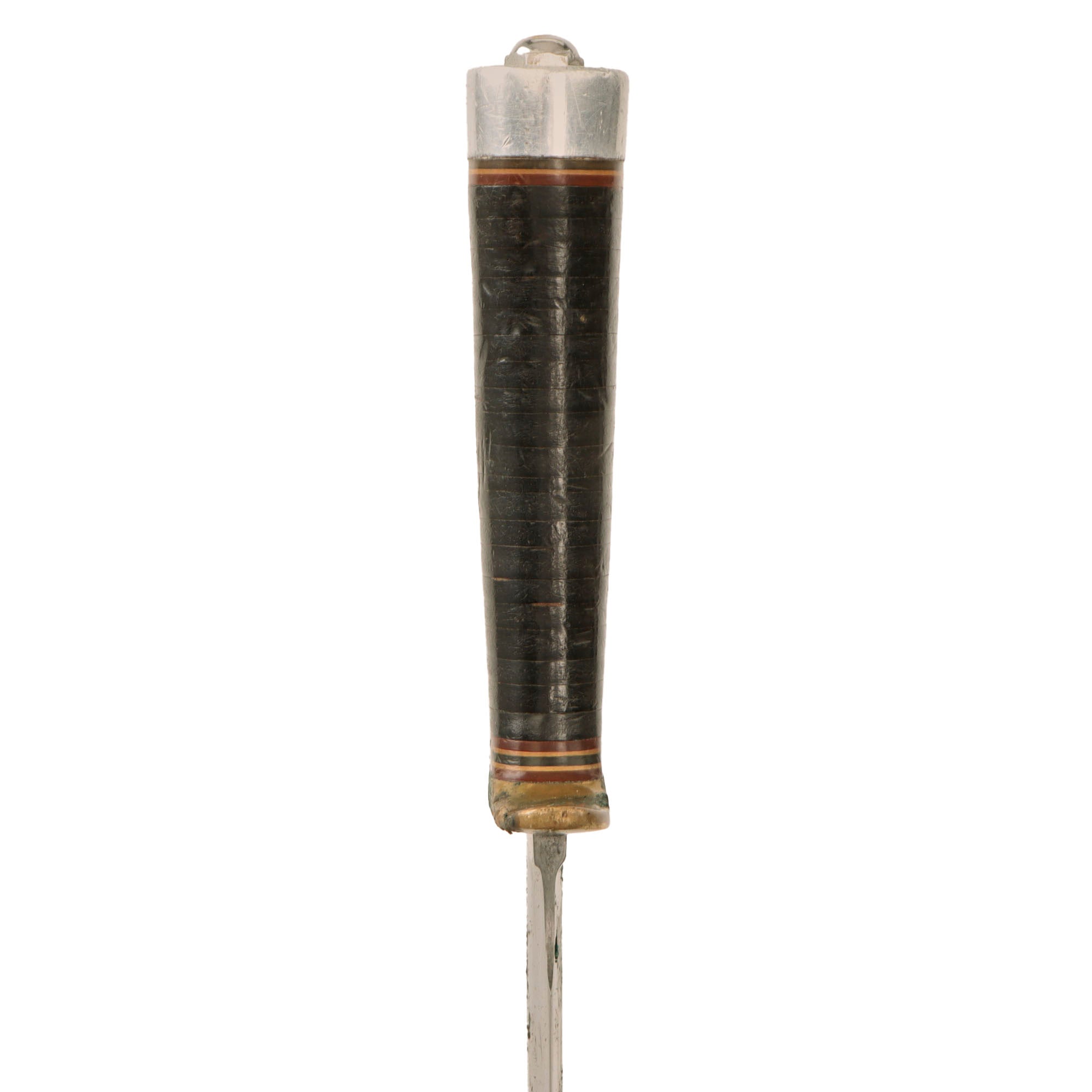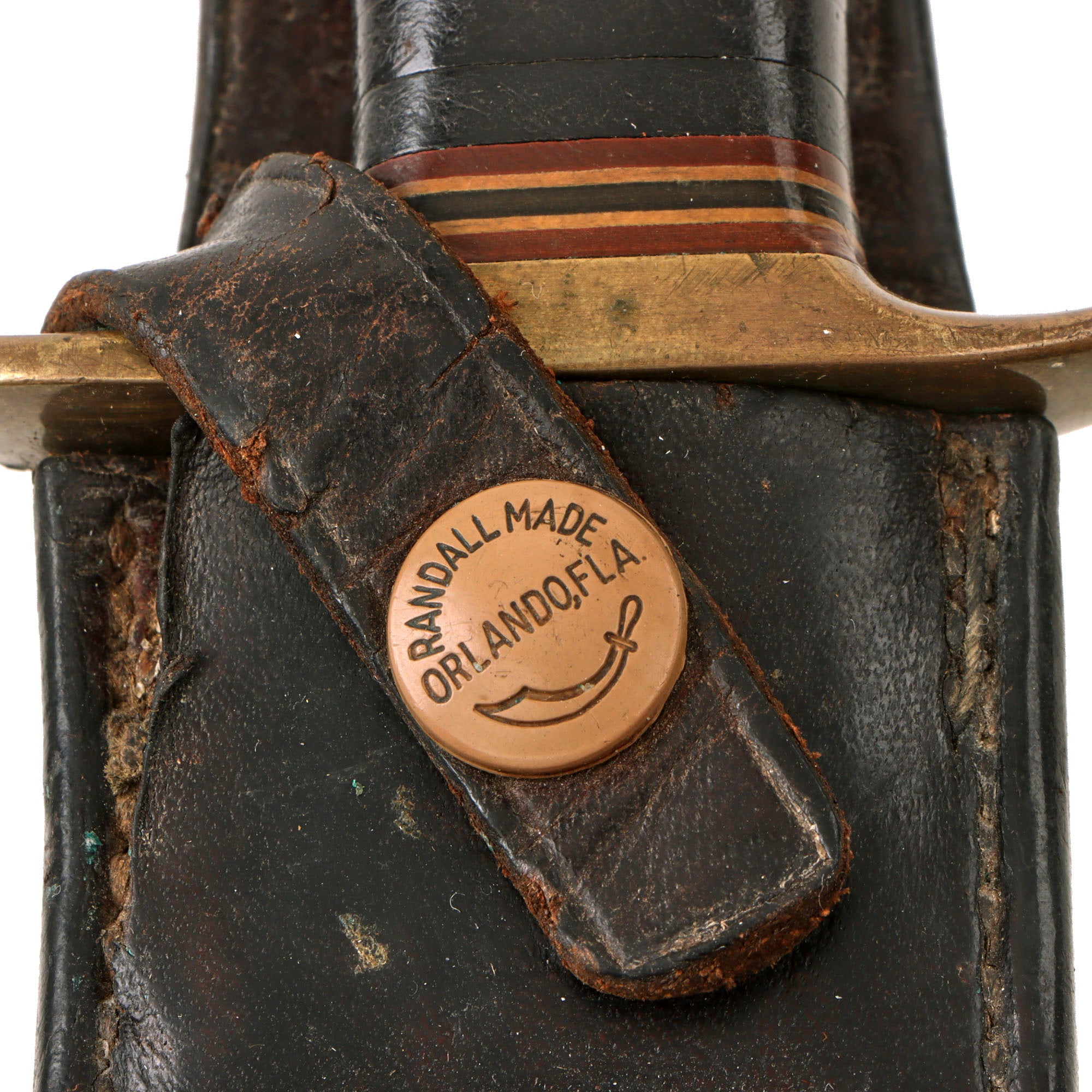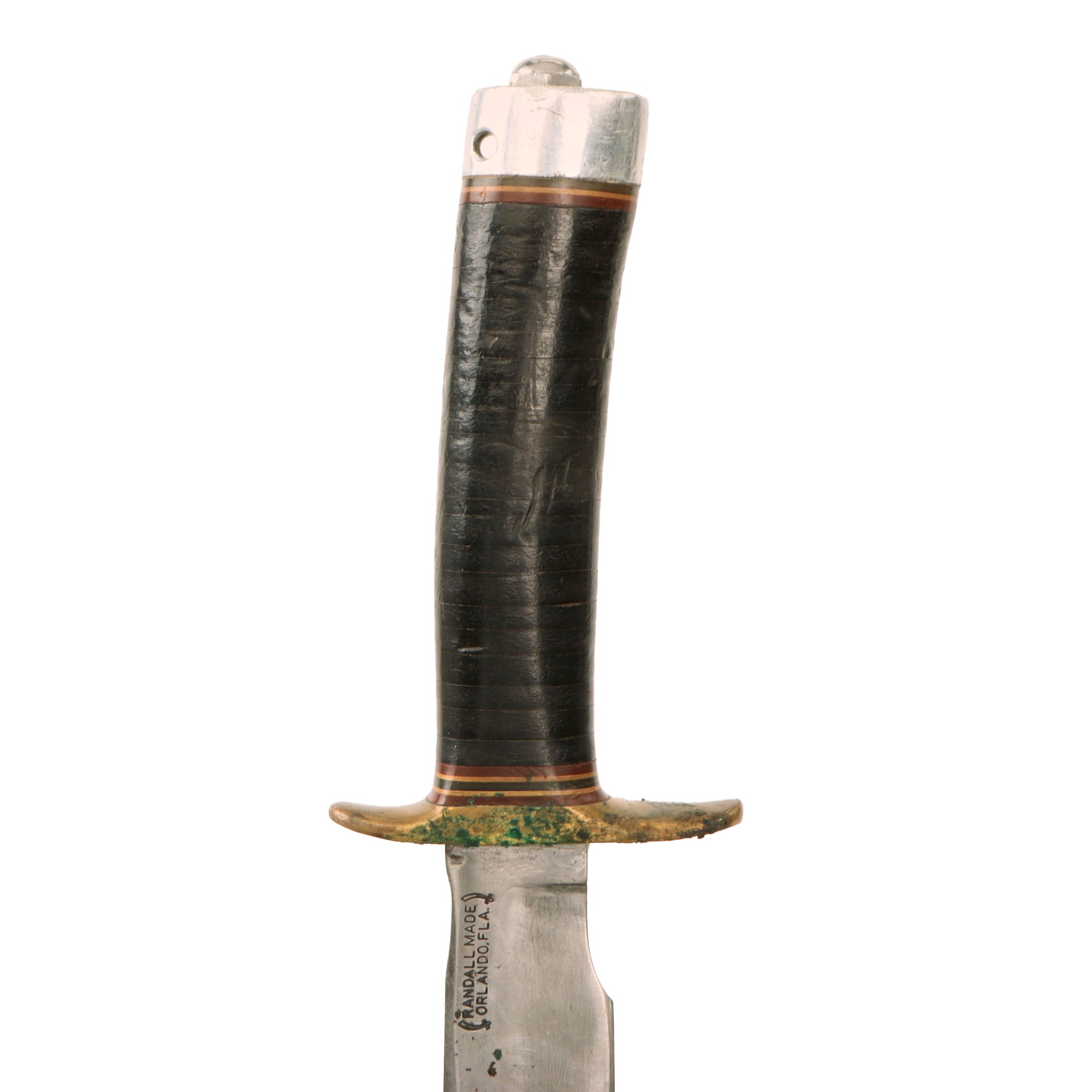 Brass cross guard, with red, tan, and black spacers on either side of the leather washer grip, an aluminum pommel cap and a hexagonal pommel nut. The knife comes with its original leather scabbard which has snaps marked RANDALL MADE / ORLANDO, FLA. and is stamped on the back of the belt loop: