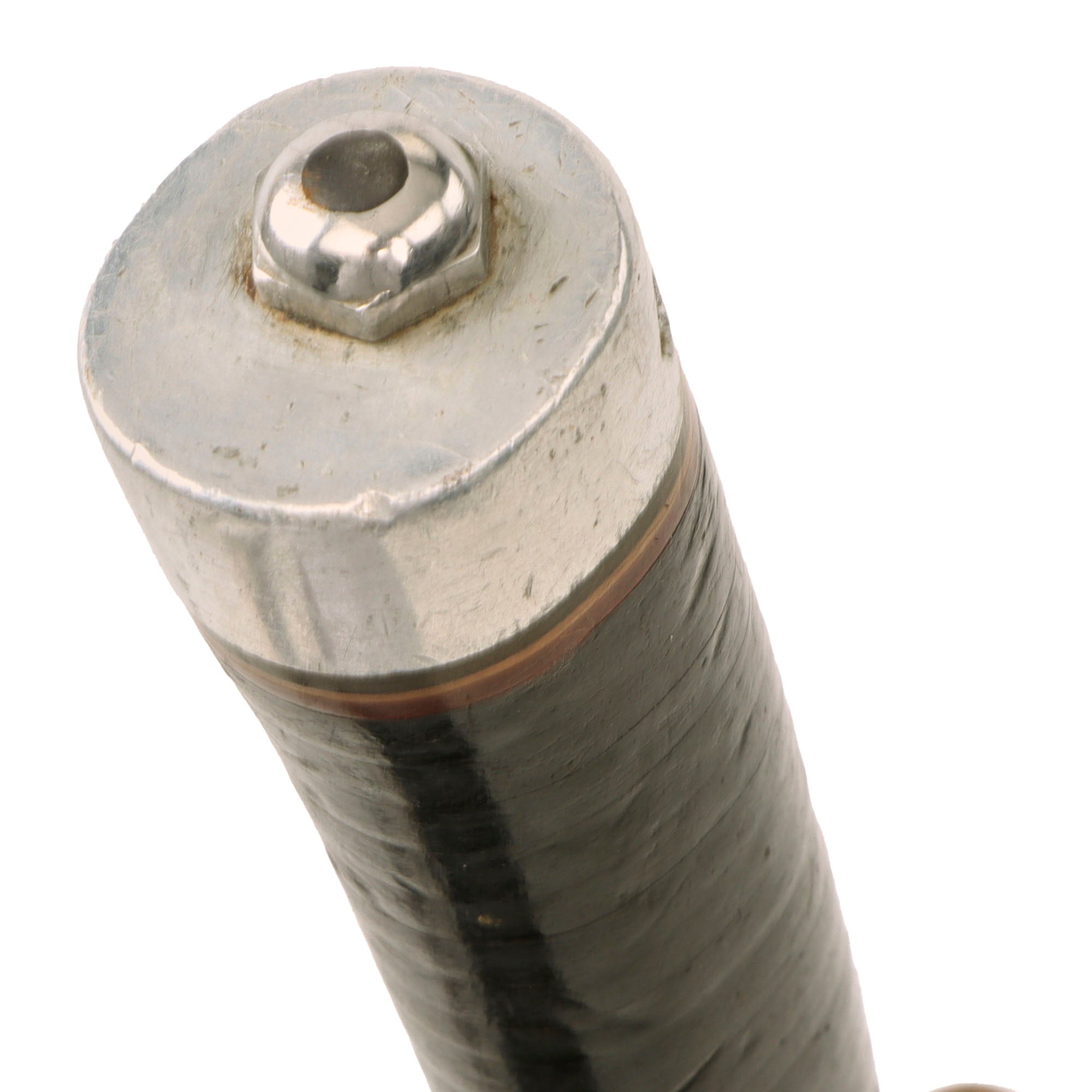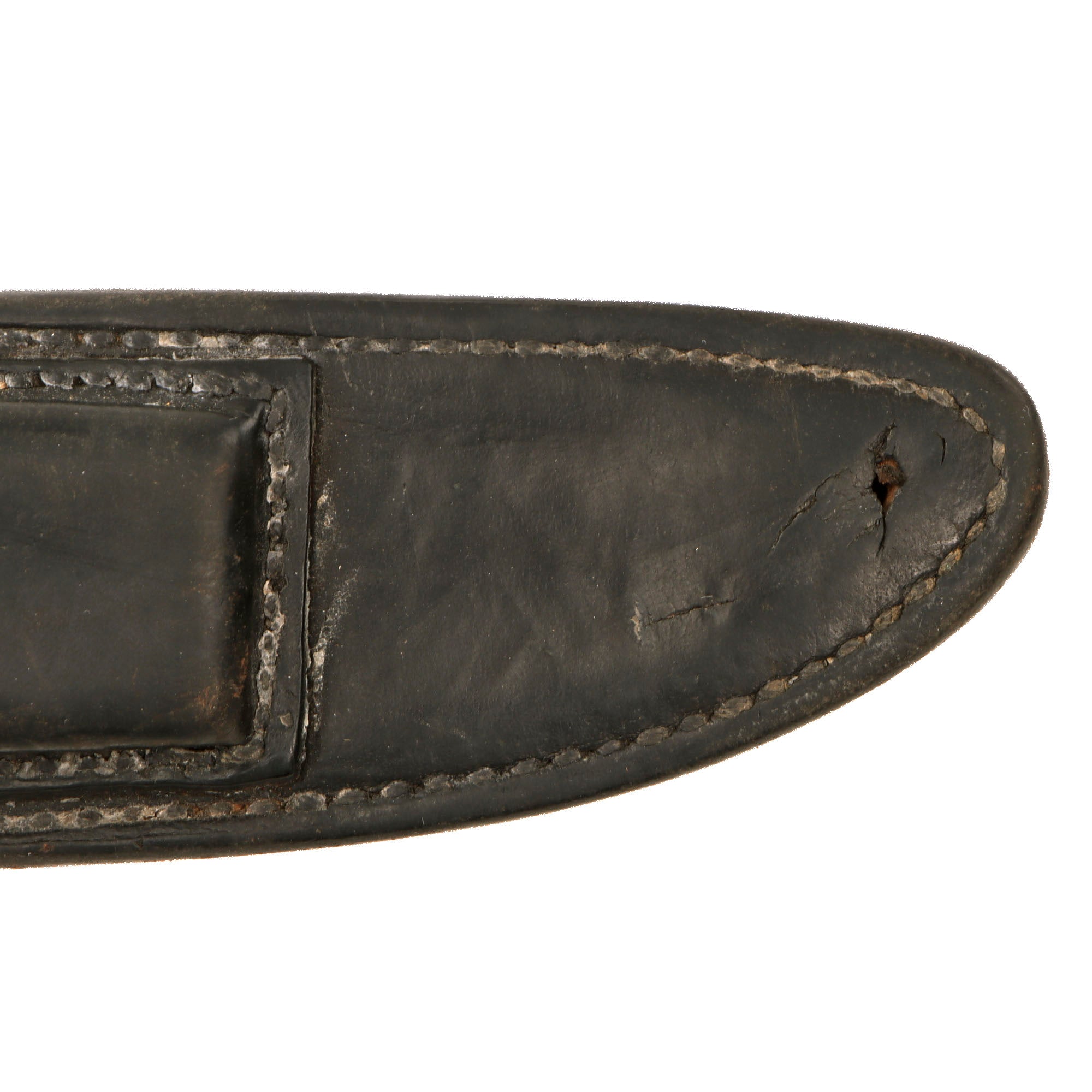 The original sheath is also fine with tight stitching, attractive original russet brown finish, intact closure strap, and functional snap on the whetstone pouch, with the whetstone still inside. Unfortunately, the leather is tearing away on one side of the throat, and the securing strap shows heavy wear and some minor tearing. Overall, the leather is in fair condition despite the tearing. There is oxidation and verdigris on the metal fittings, and scuffs and scratches, as expected with any piece of historic leather.