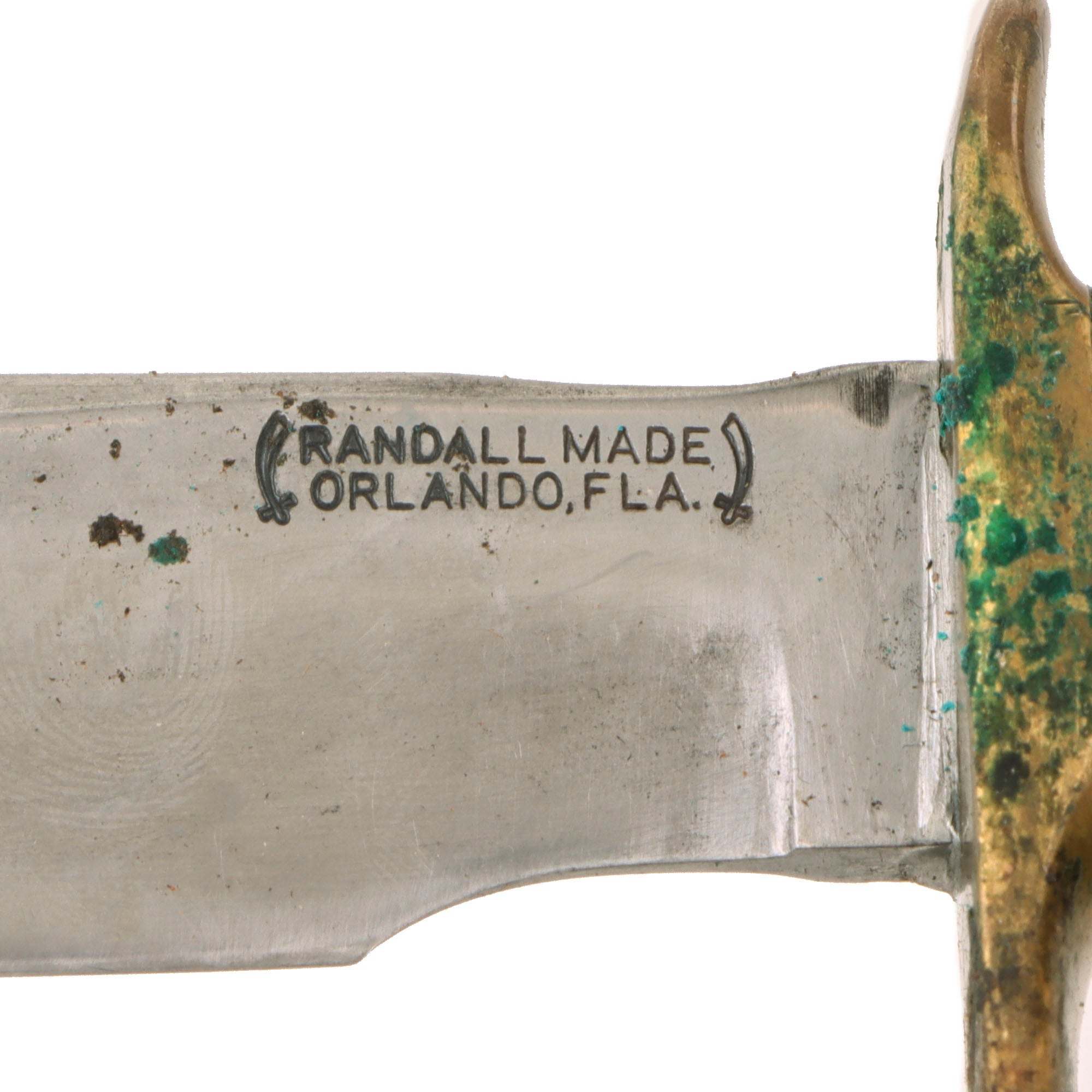 The knife measures roughly 12” overall with a 7 ⅛” carbon steel blade, outfitted with a 1 1/2 inch sharpened false edge and the scimitar flanked address reading "RANDALL MADE/ORLANDO FLA" on the left side of the blade.
