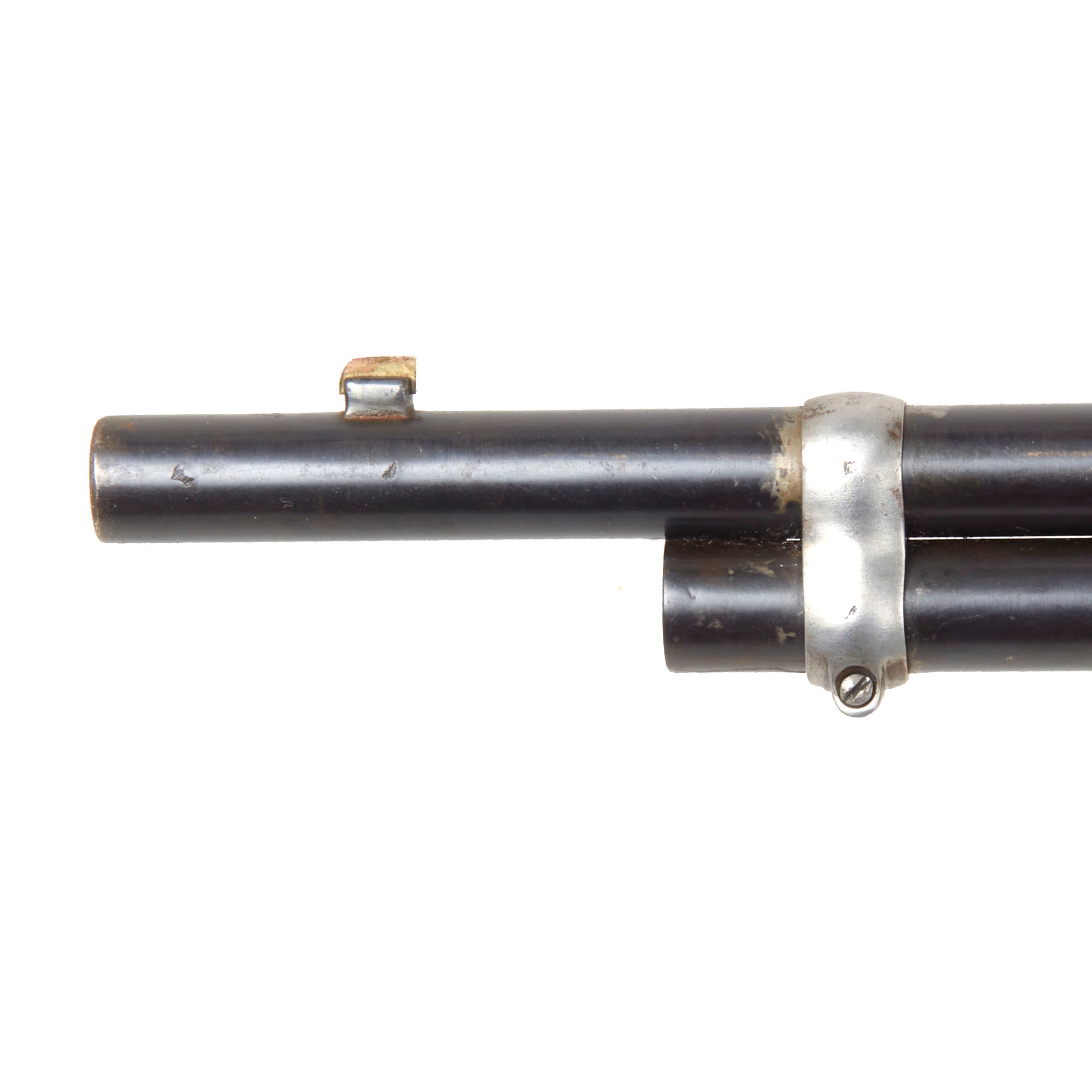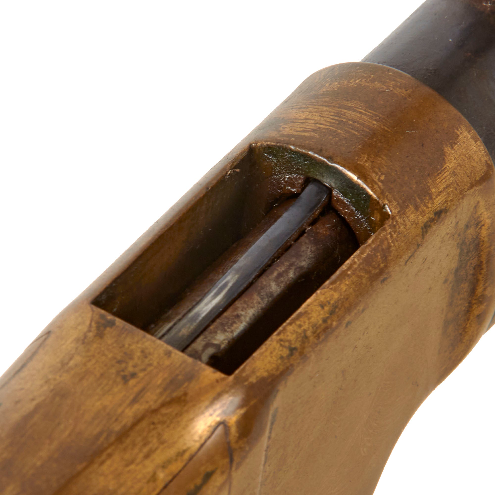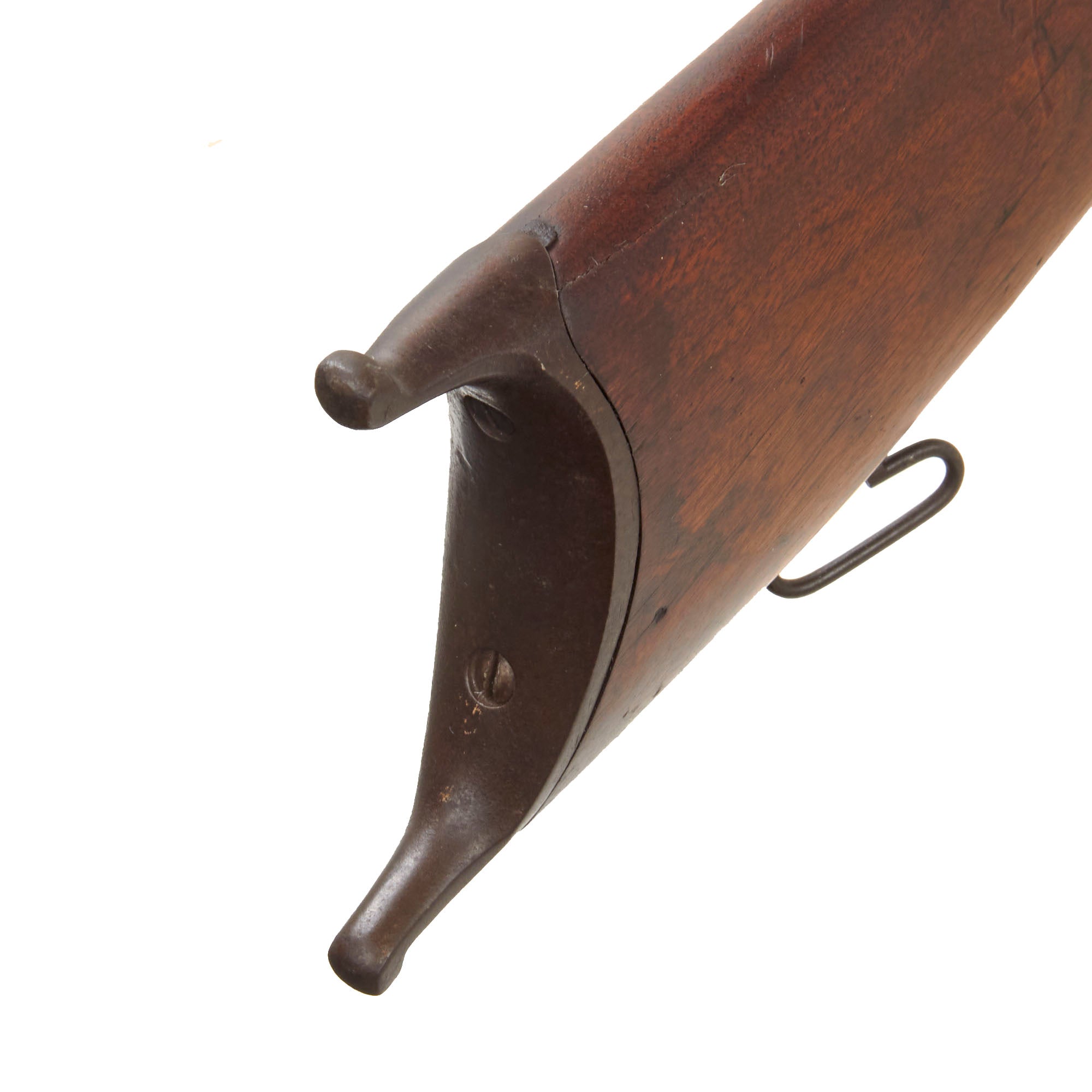 The action has a beautiful patina on the "gunmetal" frame, which we have left intact. The barrel looks to have been re-blued at some point, which is still very well retained, though for some reason the barrel bands were left bright polished steel. The lower sling swivel on the butt stock is still present, however the sling swivel on the middle barrel band is now missing. Stocks are in good condition, showing wear but also the lovely red brown color of aged and oiled walnut. The fore stock has some dents and dings, but not any cracks or other major damage. The butt stock is in even better shape, with no cracks, dents, or major scratches, and the grain really "pops" out. At some point in the past, the original butt plate looks to have been swapped out for a "sharpshooter' style with prongs at either end for a very secure shoulder rest..
