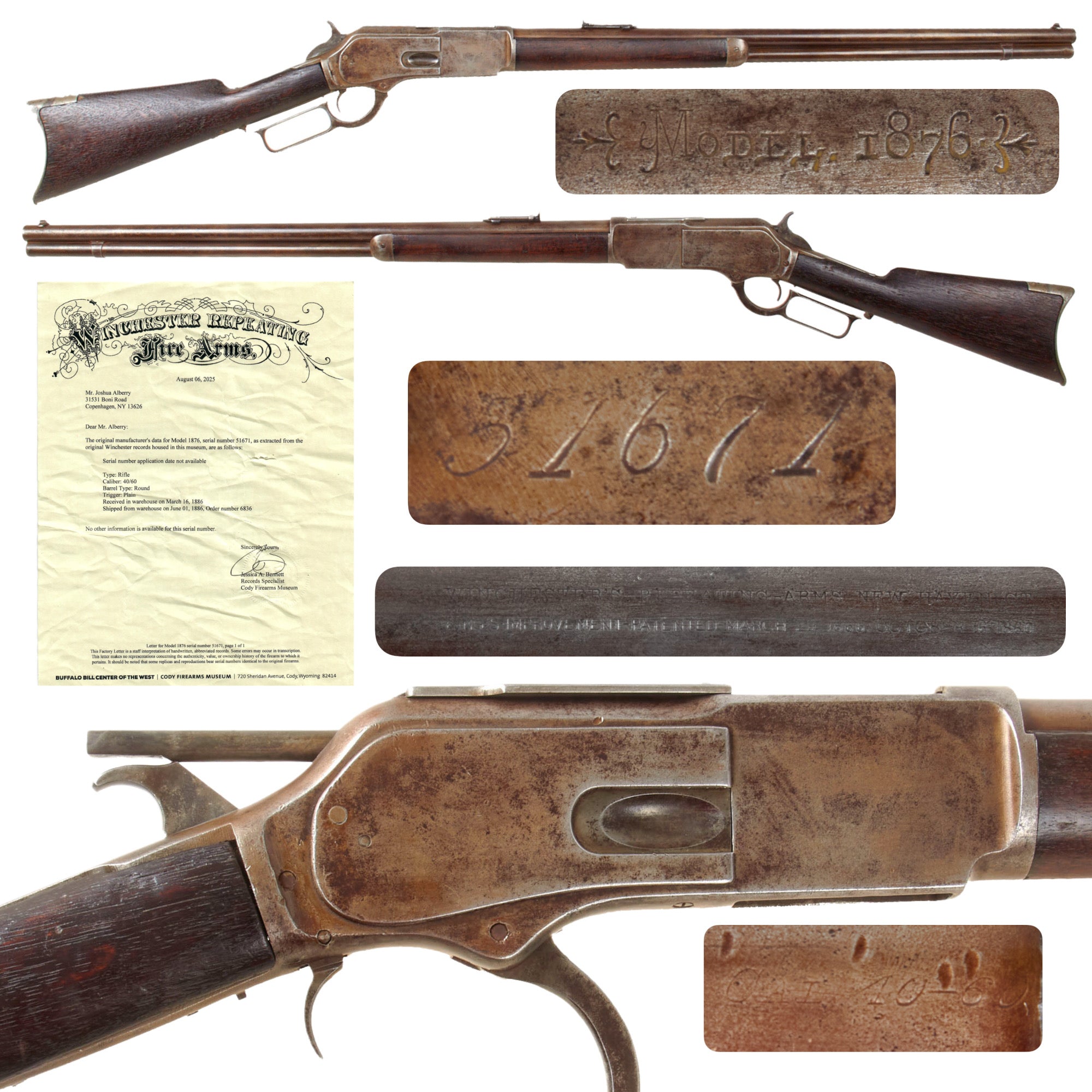 This rifle also comes with an original factory letter from the Buffalo Bill Center of the West at the Cody Firearms Museum, which now houses the original Winchester factory records. This is printed on WINCHESTER REPEATING Fire Arms letterhead, and dated August 06, 2025. It indicates that it is a Model 1876 Rifle in 40/60 caliber with a Round barrel. There is no indication of barrel length, which means it was made with the standard 28 inch "Sporting Rifle" barrel, so this rifle is still in the original configuration as shipped! The letter also indicates that the order for this rifle was received in the warehouse March 16, 1886, and shipped on June 01, 1886 as part of order 6836. There is no other information available for the serial number, but that is not uncommon for a rifle that did not see customization. The letter is signed by records specialist Jessica A. Bennett and still bears the correct raised seal.