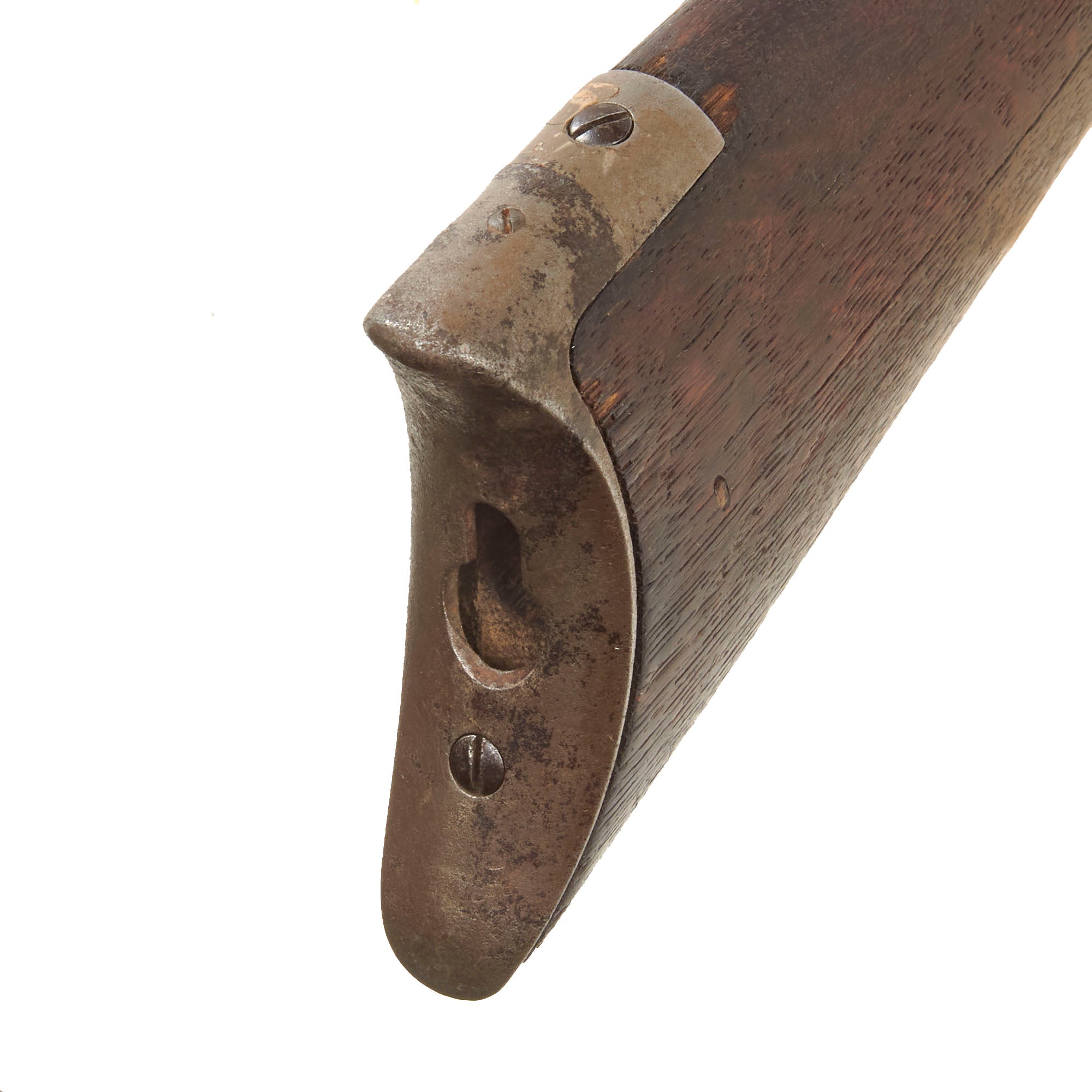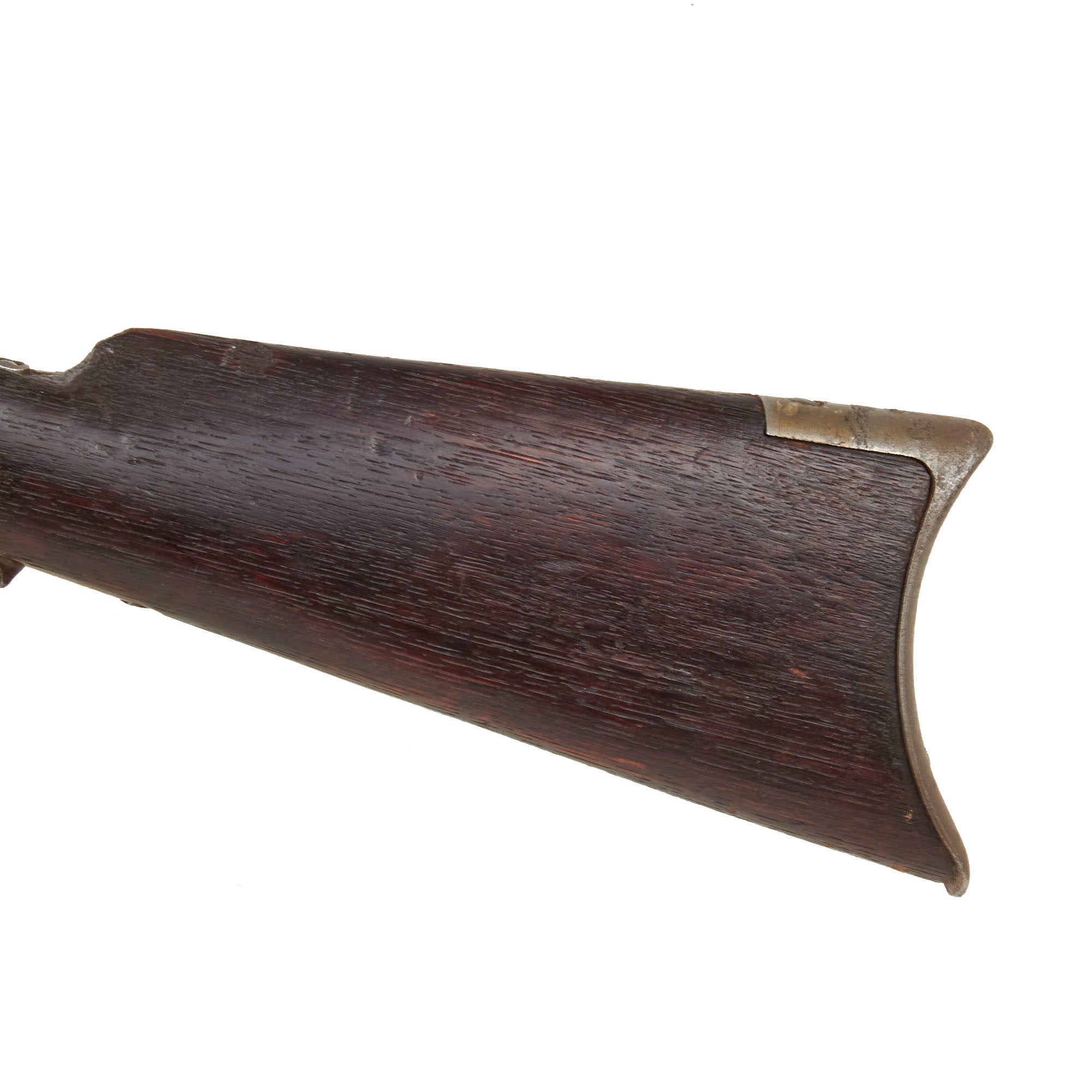 Stocks are in very good "frontier worn" condition, showing the lovely dark red brown color of oiled and aged walnut. They do look to have been varnished at some point, which is very well retained. Both show the usual dents and dings from use, as well scratching and other issues from long service. The butt stock in particular seems to have lost some of the wood from repeated cleanings, so the wood is below the level of the metalwork. The crescent butt plate is in good shape, however the storage compartment door is missing.