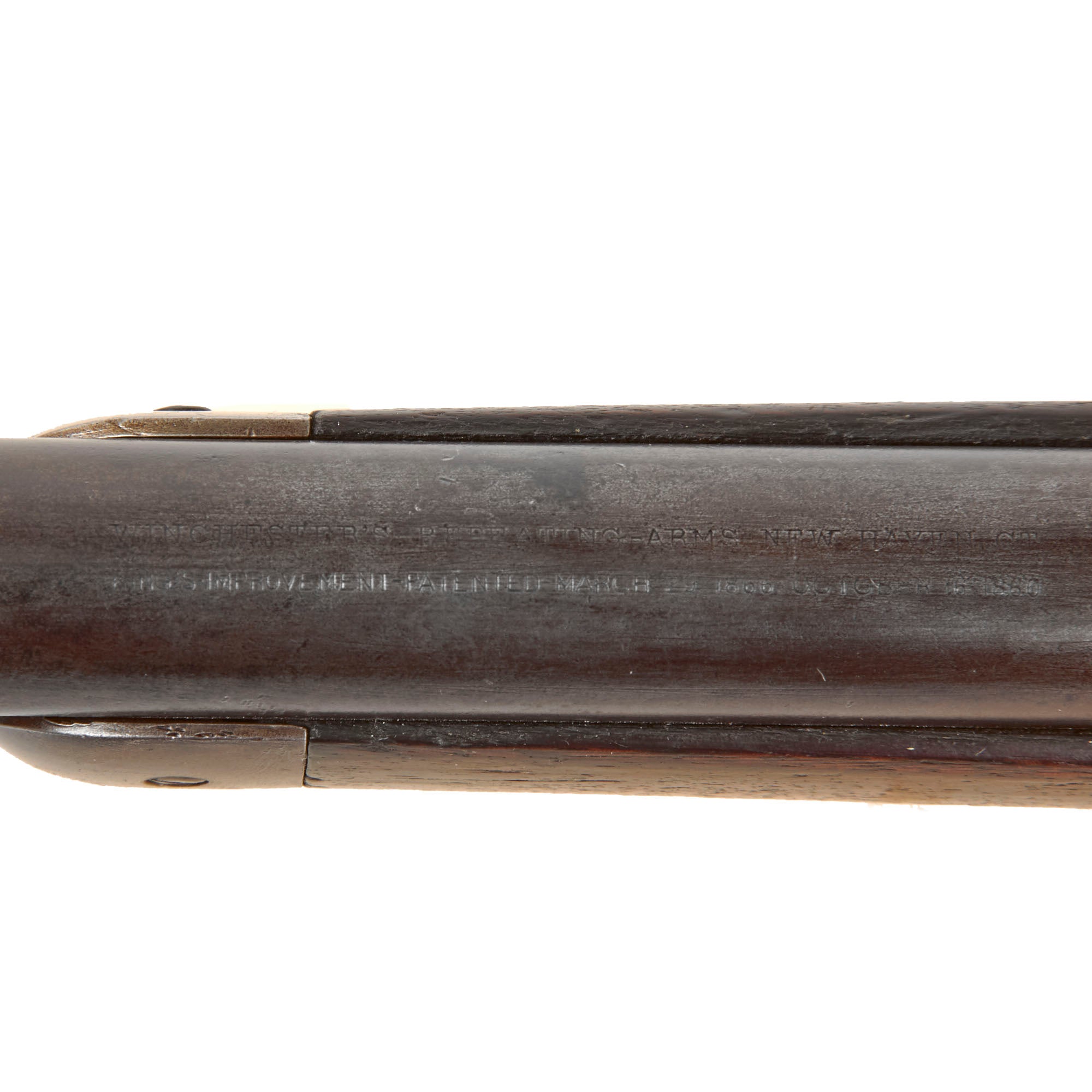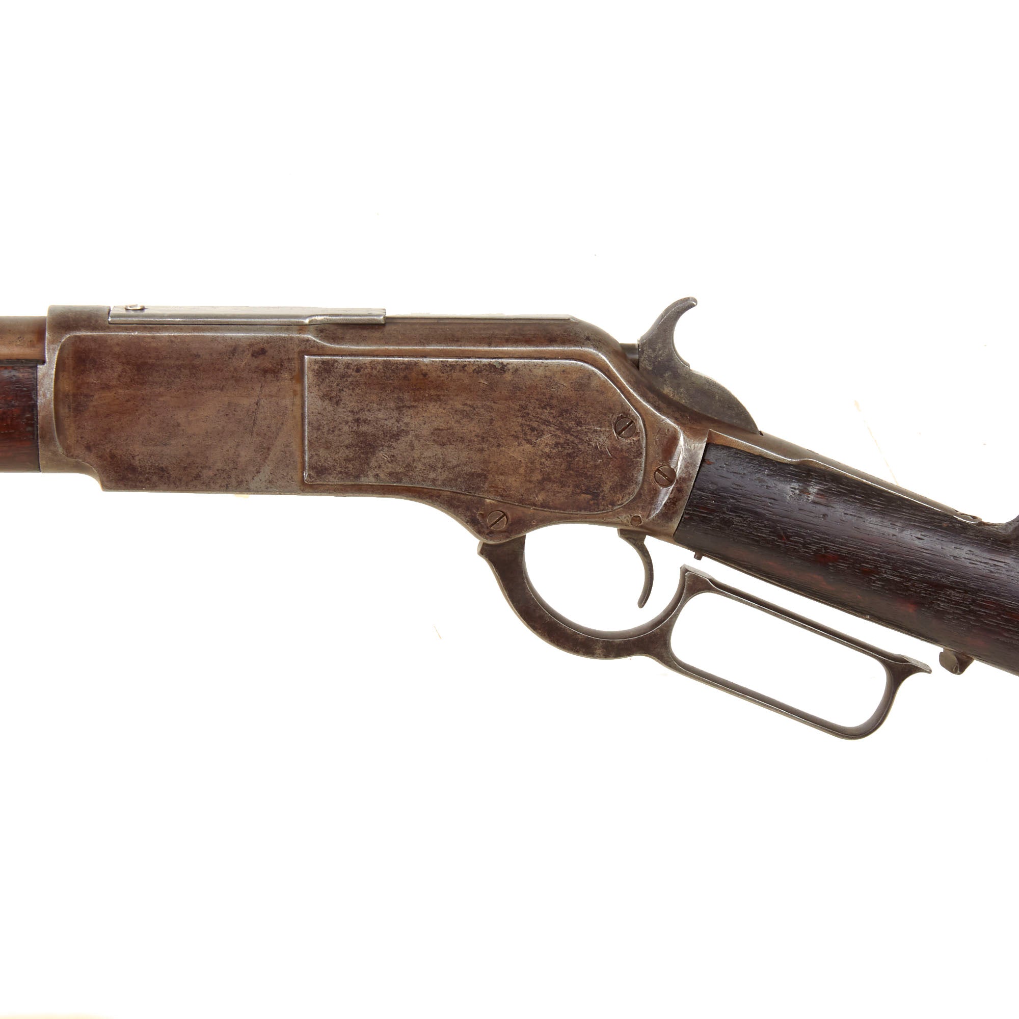 This Winchester lever-action repeater is in lovely condition, with the original bluing and case hardening faded to a nice light gray patina overall. There is just a bit of past peppering in areas, and no major rust or other issues. The engraving on top of the barrel is still fully legible: