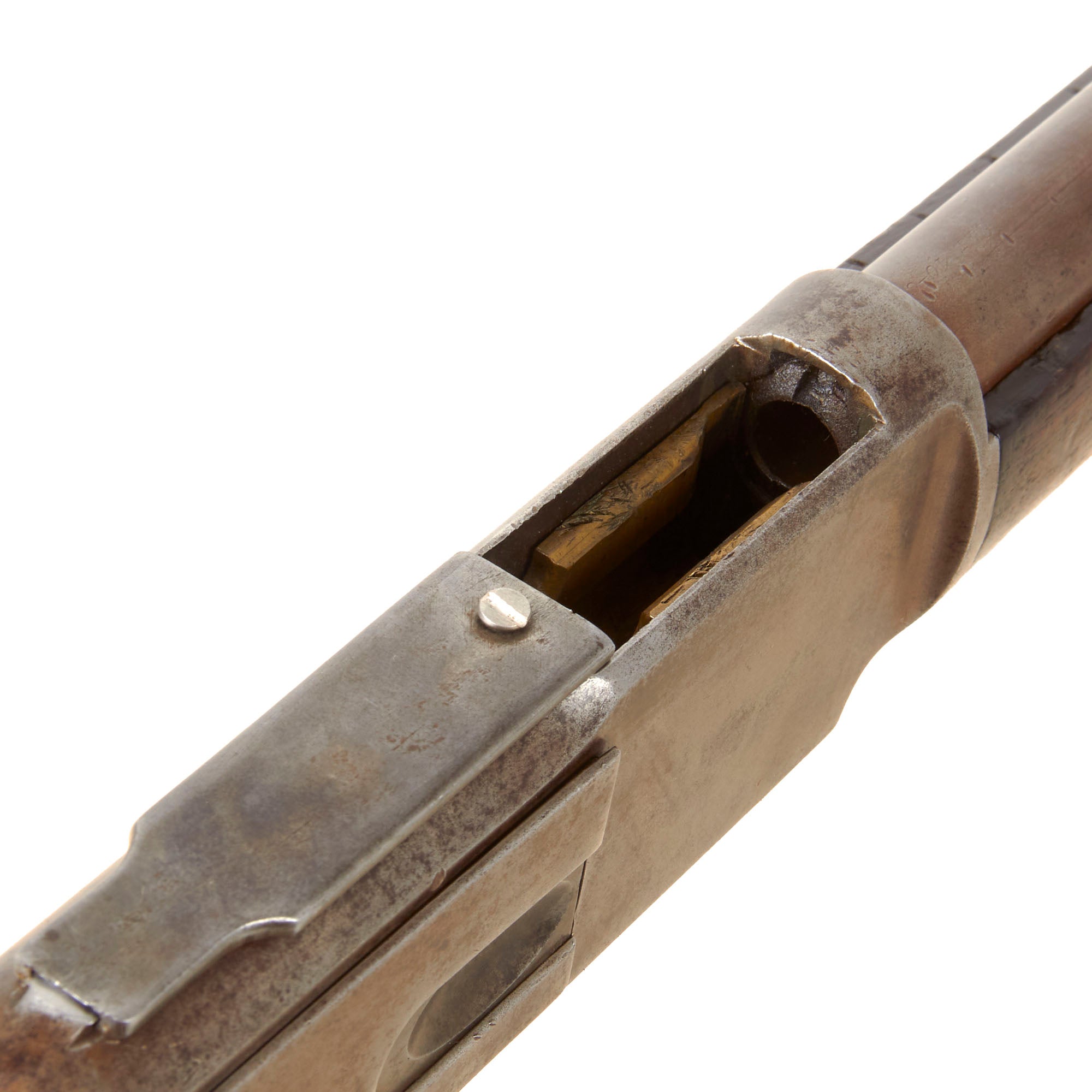 This lever action repeater is offered with a crisp tight action in fully functional condition, with a working original dust cover. We did not notice any of the sloppy movement that this type of action can develop over time. The bore is in good condition, showing a mostly bright finish with faint lands and grooves. It looks to have seen long use with many cleanings, but was well cared for, and we would rate it about a 5 out of 10.