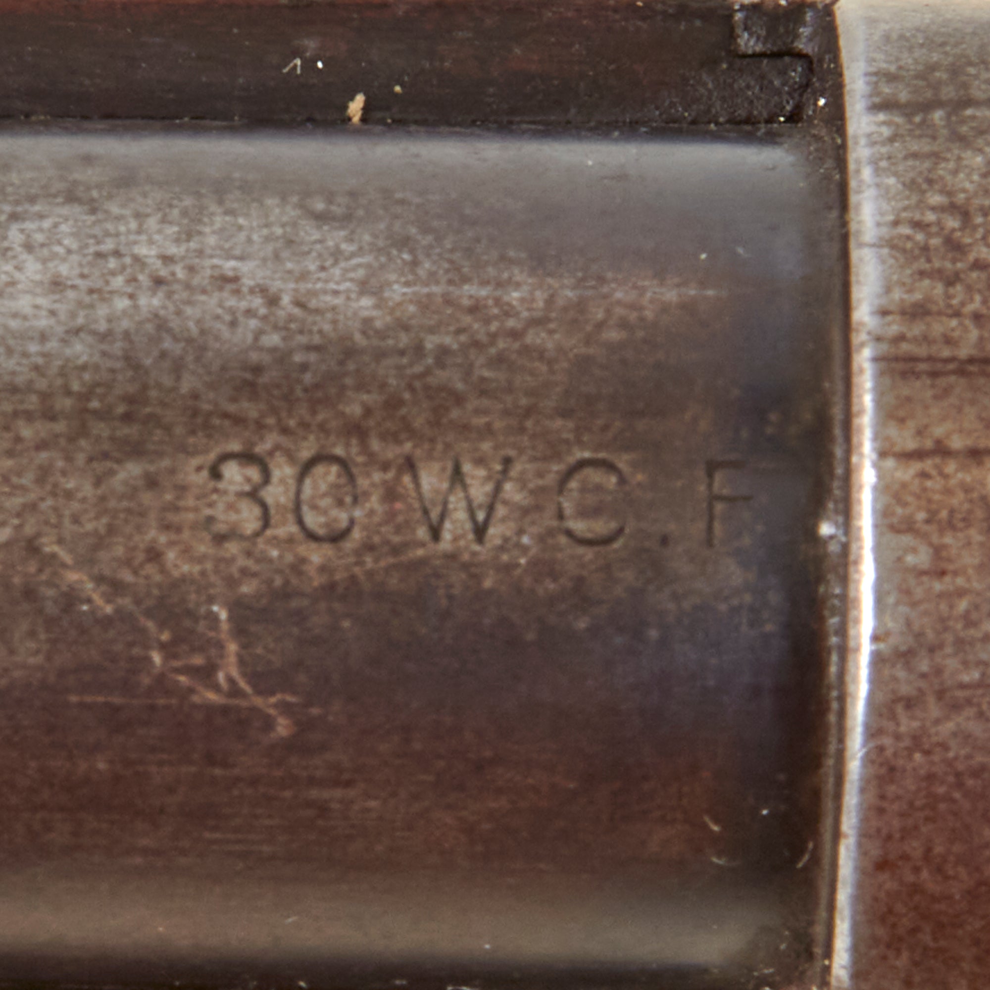The barrel is also marked 30 W.C.F.. above the chamber next to the receiver, and the side of the barrel is marked NICKEL STEEL BARREL / ESPECIALLY FOR SMOKELESS POWDER. The Model 1894 was originally chambered to fire 2 metallic black powder cartridges, the .32-40 Winchester and .38-55 Winchester. In 1895 Winchester went to a different steel composition for rifle manufacturing that could handle higher pressure rounds and offered the rifle in .25-35 Winchester and .30-30 Winchester. The .30-30 Winchester, or .30WCF (Winchester Centerfire), is the cartridge that has become synonymous with the Model 1894. As this rifle was made in 1896, it was made during only the second year that this caliber was offered.