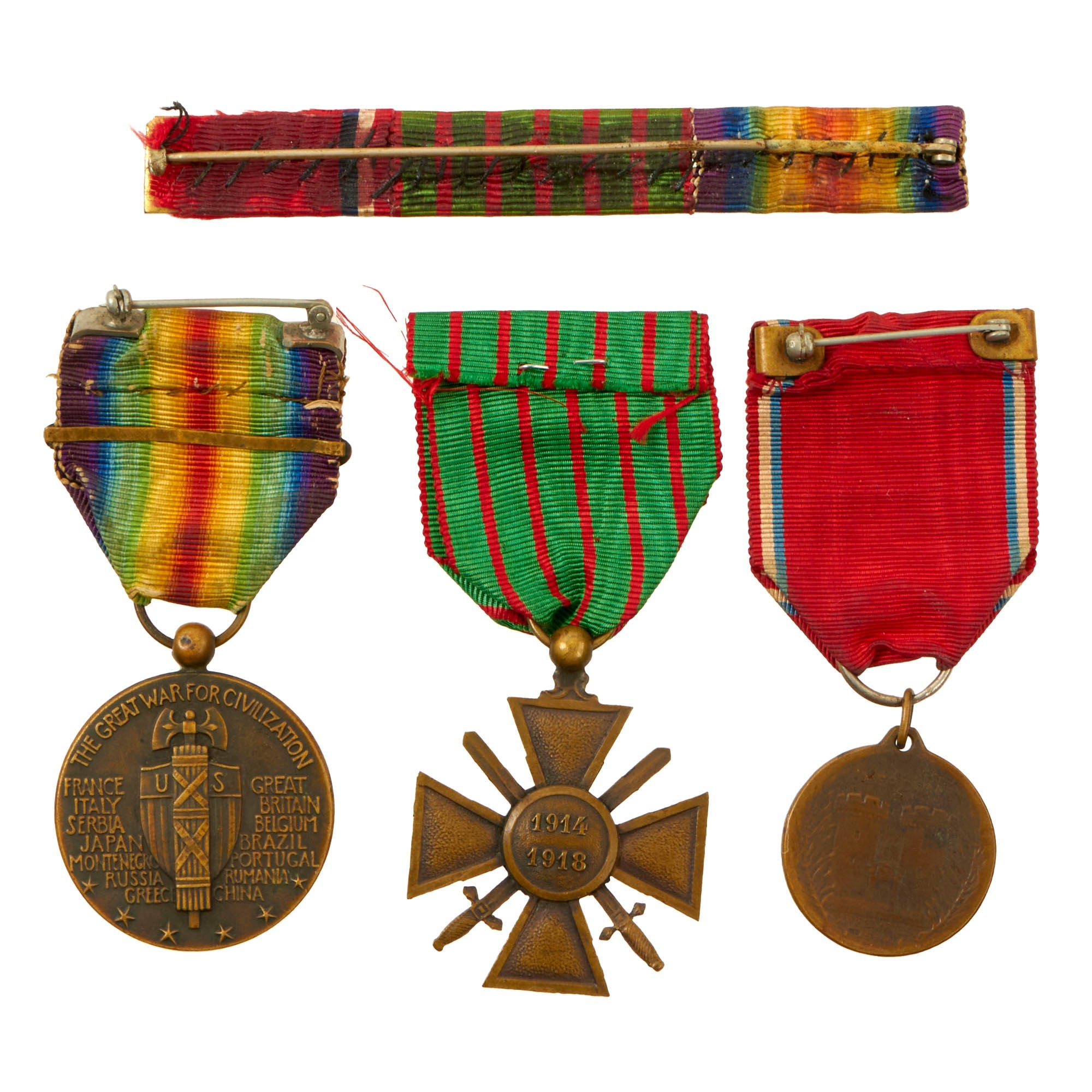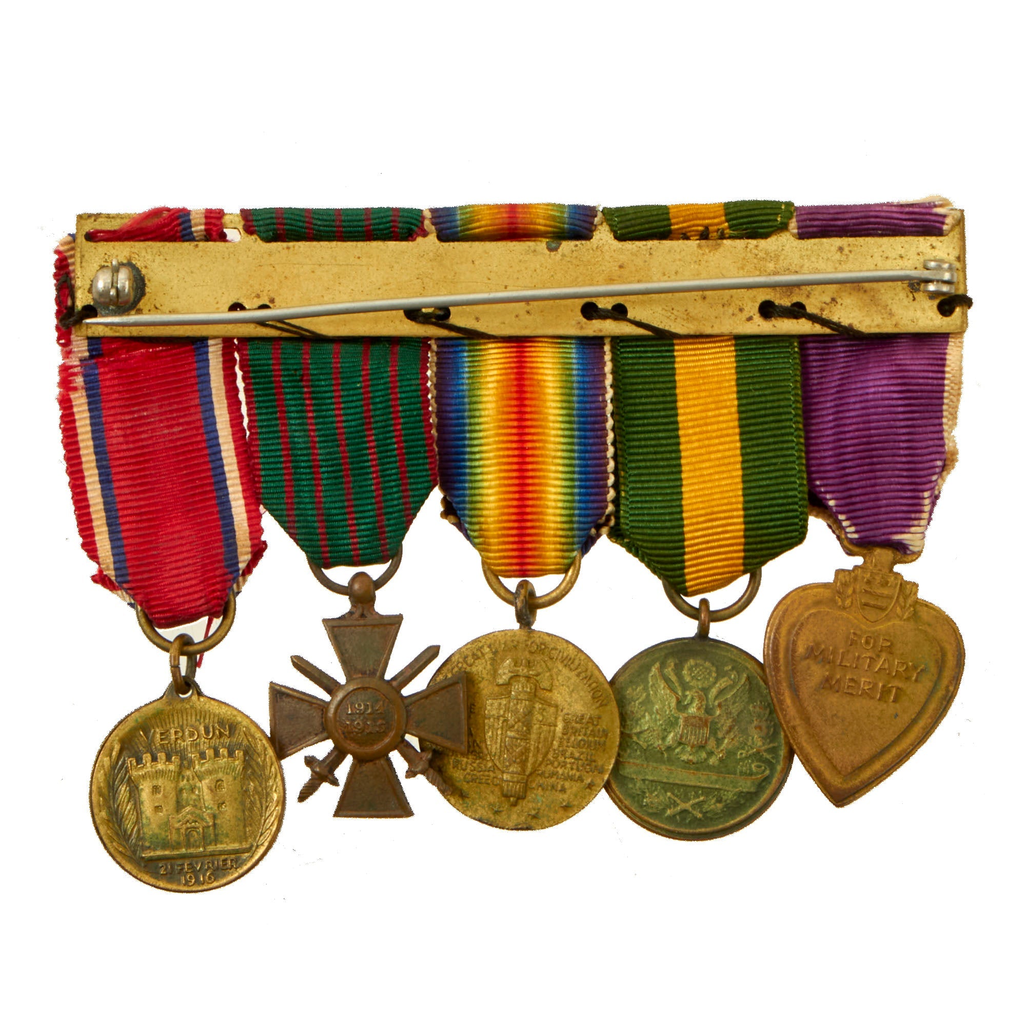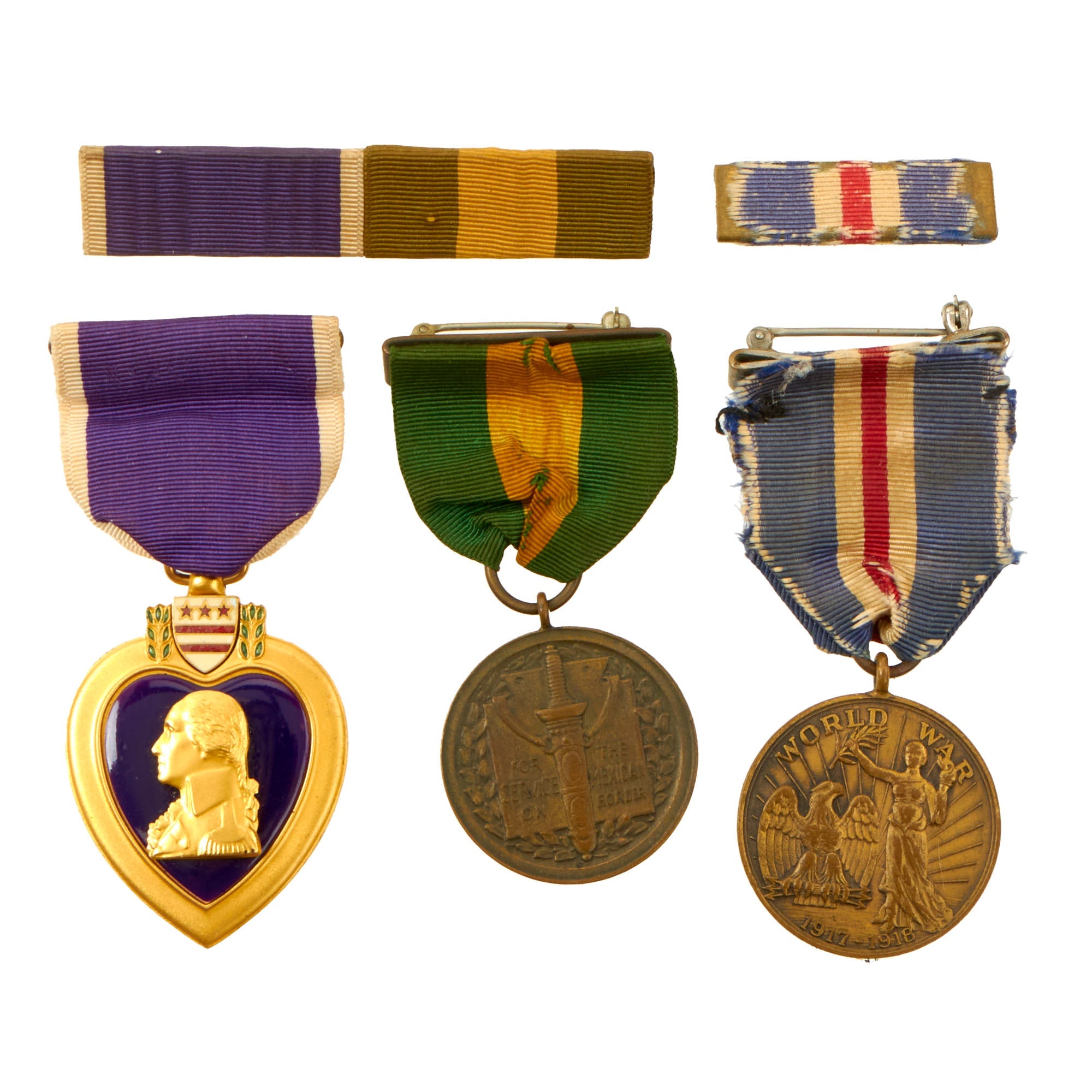 - 5-place mini-medal bar with the Purple Heart, Mexican Border Medal, U.S. Victory Medal, Croix de Guerre with Palm, and the Verdun Medal, although the ribbon for the Verdun medal shows tearing.