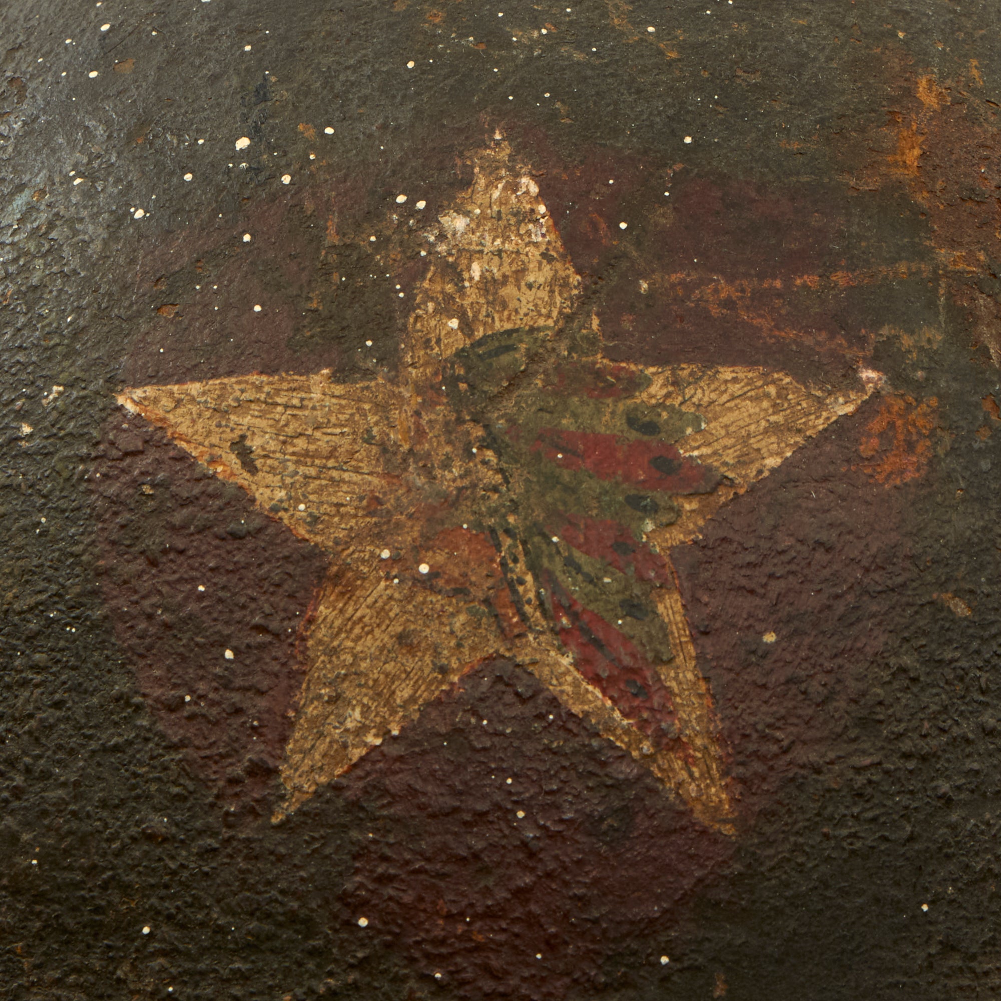 The front of the helmet is painted with an Indian head within a white star over what appears to be a Red Shield, which would denote men of the 1st Field Signal Battalion. At first glance we believed it to be a circle for the 23rd Infantry Regiment, but after taking a close look, we are confident that it is for a man of the 1st FSB.