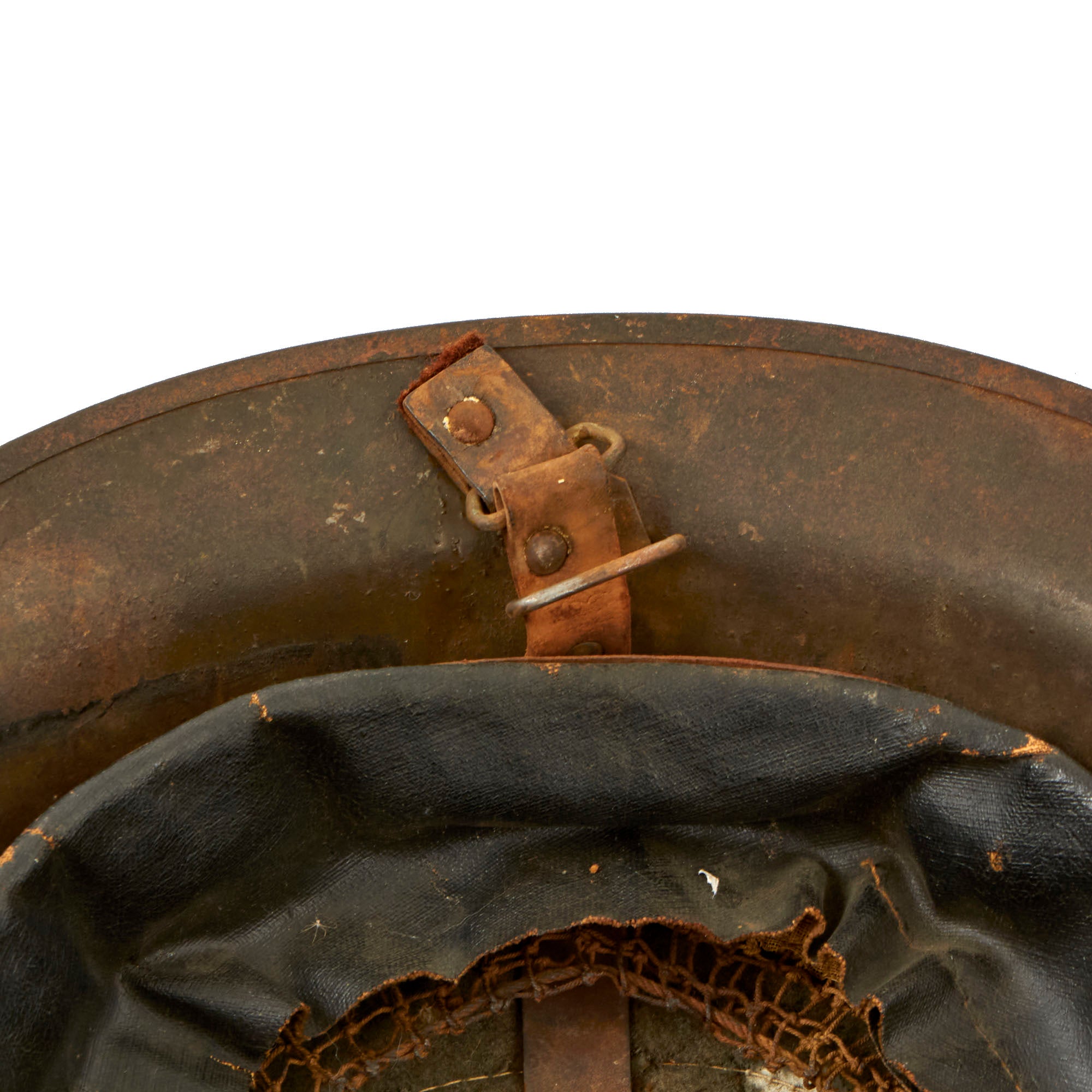 M1917 helmet liners typically show a paper label at the crown and the dome rivet head. The liner is set up as on the British versions, with an oilcloth band and net configuration, attached to a leather strap, riveted to the shell. The chinstrap is leather with steel buckle.