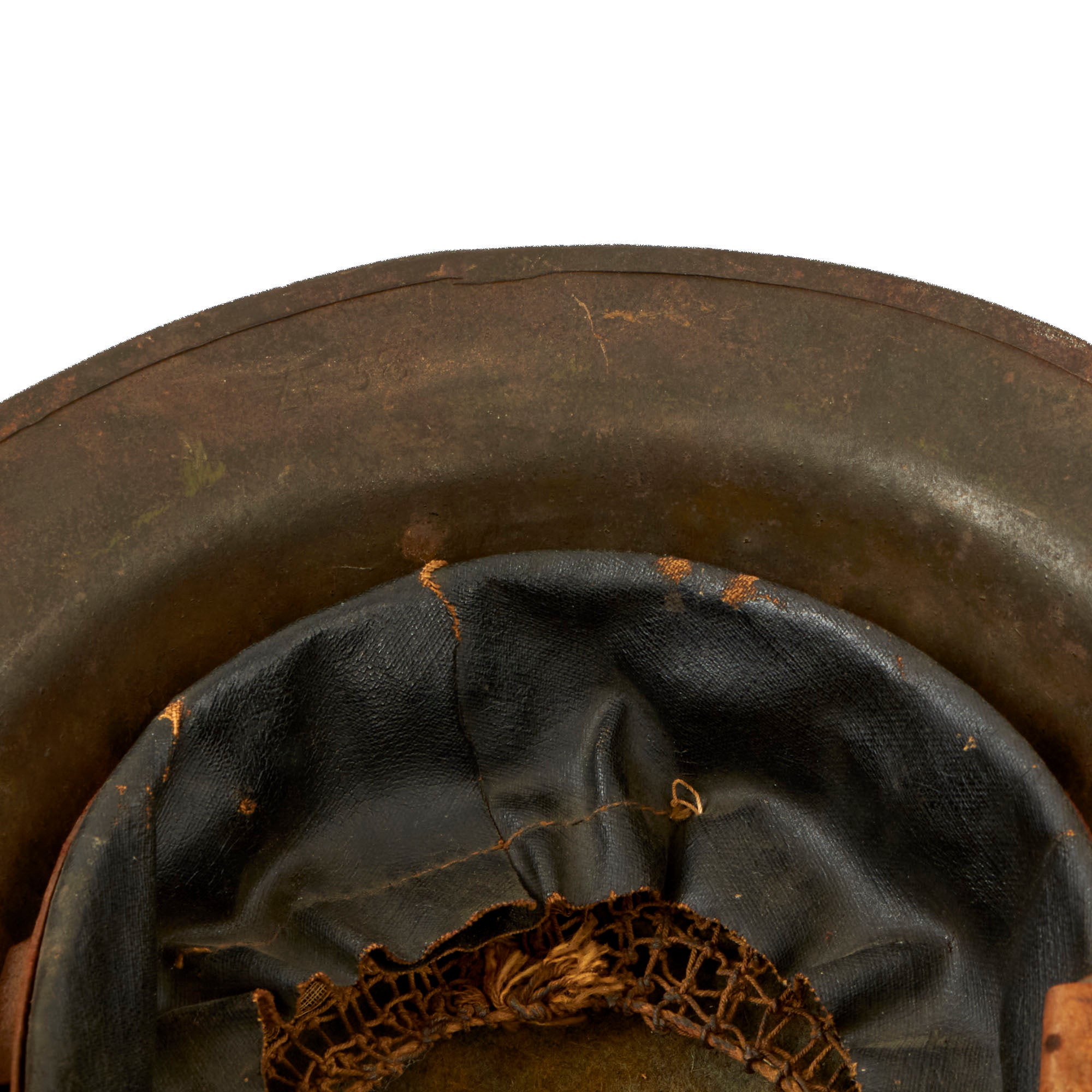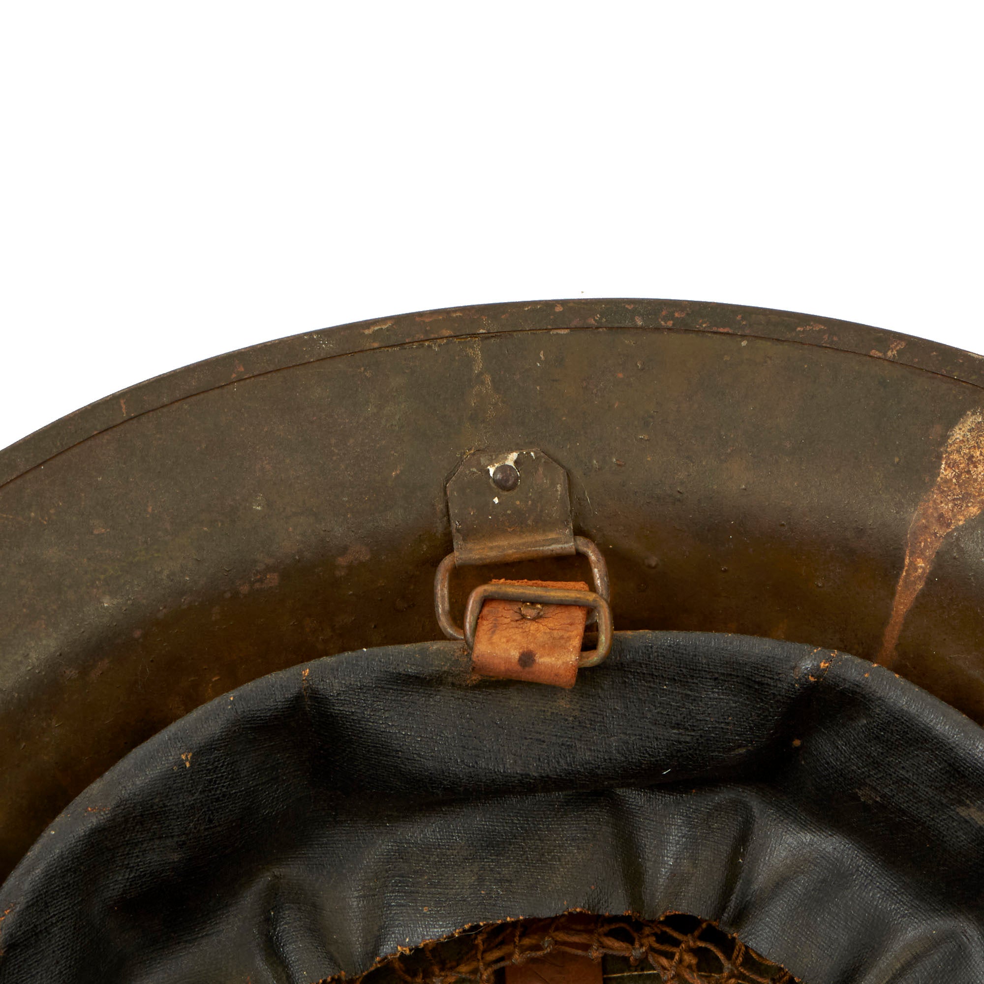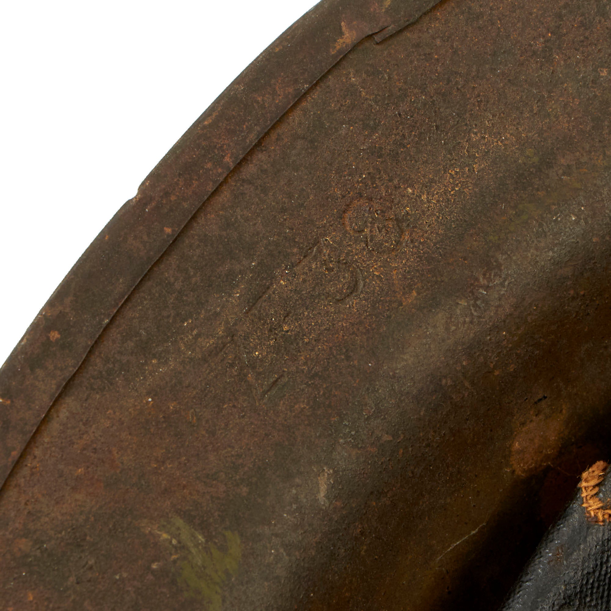 Original Item: Only One Available. This is a very nice & service-worn example of a U.S. WWI 1st Field Signal Battalion, 2nd Division M1917 "Doughboy" helmet! The shell is maker-marked with a stamping on the underside of the rim that reads ZE 38. The solid rivets and heat lot number indicate that this helmet shell was produced in the United States. The helmet retains its liner but the chinstrap is gone.