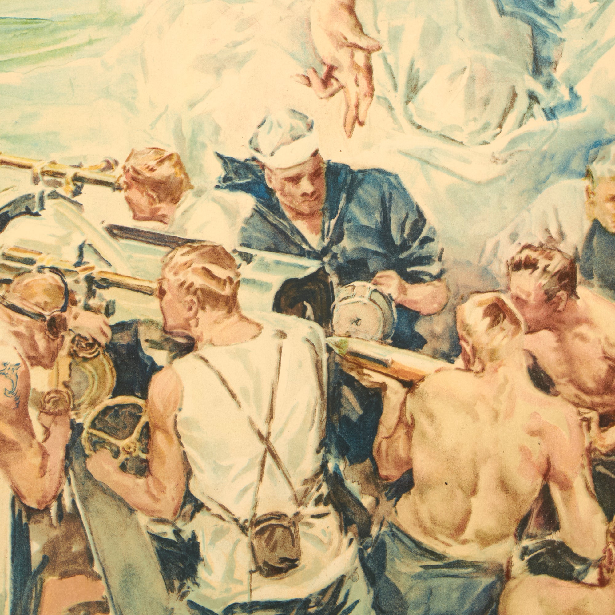 Original Item. Only One Available. Clear the Way” was one of many posters issued by the United States government during World War I to encourage support of the war. The picture depicts the “Christy Girl” version of Columbia waving the American flag above a naval crew in action at sea. Countries on both sides of the conflict distributed posters widely to garner support, urge action, and boost morale. The poster advertises “Buy Bonds Fourth Liberty Loan.” Liberty Loans were bonds that the government sold so they could keep up with the expenses of war. These were sold back to the government after the war.