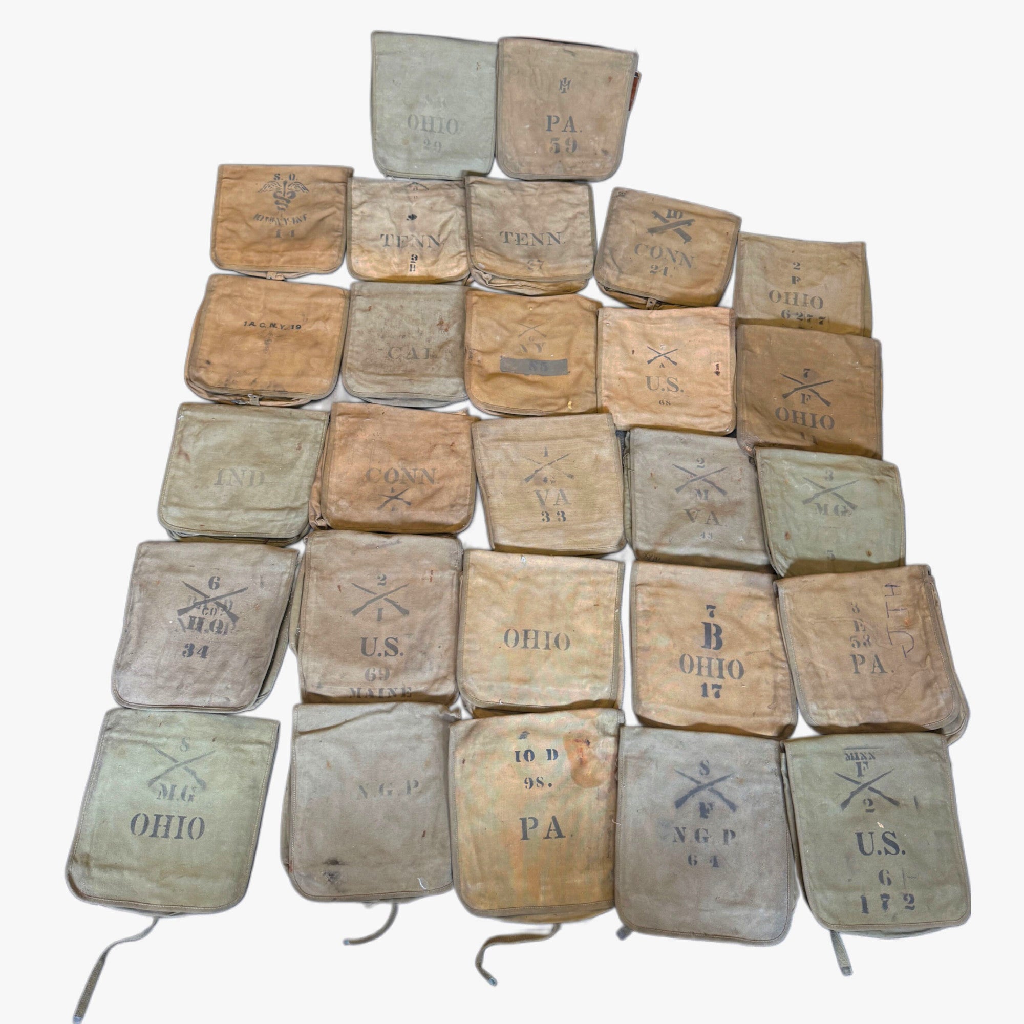 Original Items. Very Few Available. We are offering an outstanding selection of M1902 Haversacks, with every single example having a state or unit marking, with many having both! These saw use by a great deal of National Guard troops and troops training stateside during World War I, and we’ve even seen some in the past marked to aero squadrons, although none of the examples here are.
