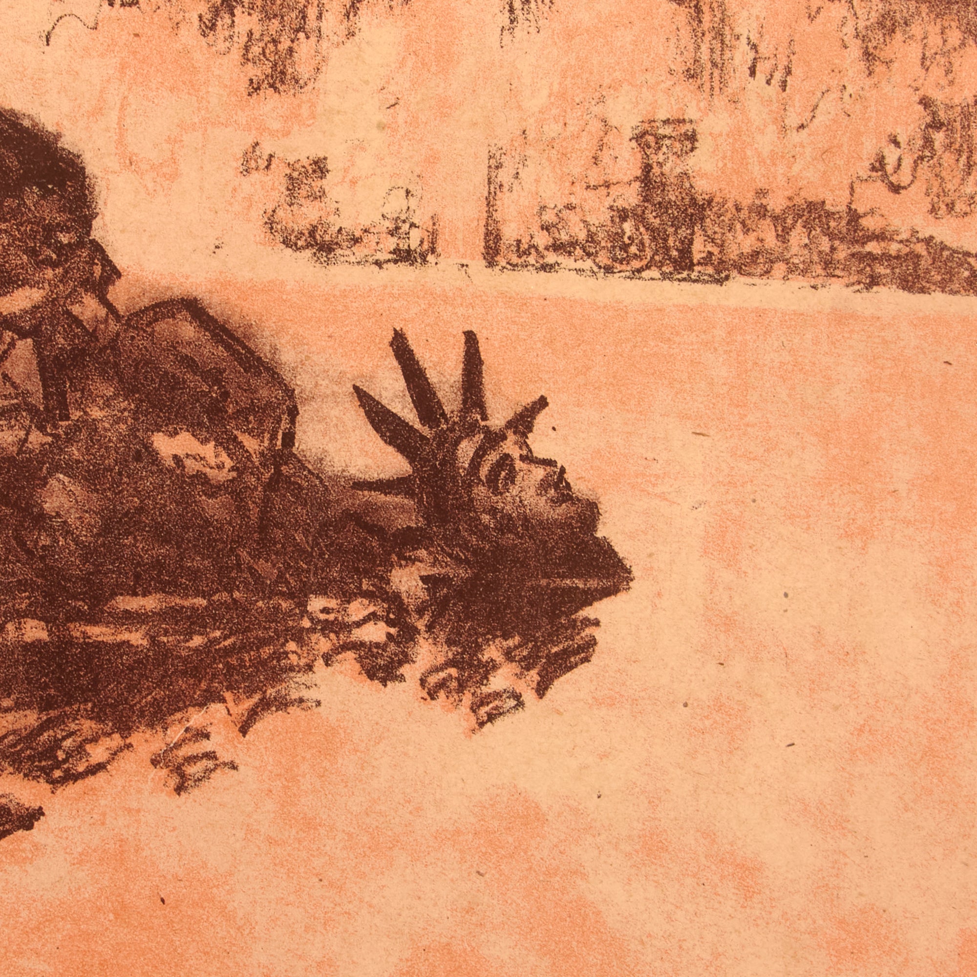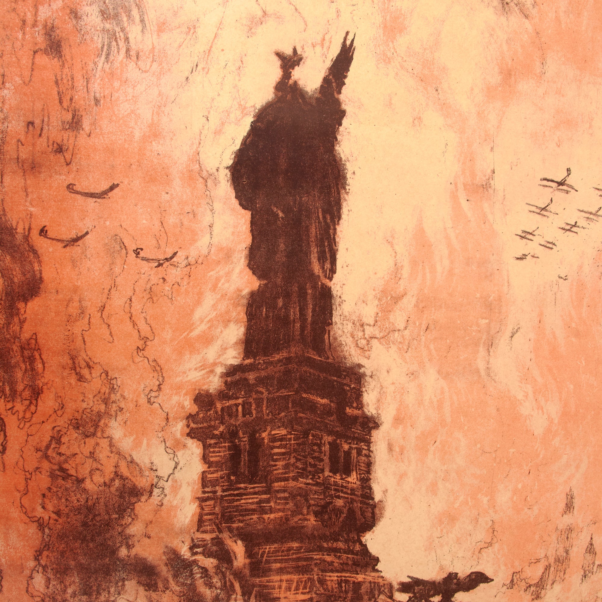 • Original Item: Only One Available. “That Liberty Shall Not Perish From The Earth'' was one of many posters issued by the U.S. government during World War I to encourage support of the war. This poster features a picture of the Statue of Liberty in ruin, the New York skyline in flames with a squadron of German bombers flying overhead and in the distance a collapsed Brooklyn Bridge. A German U-Boat can also be seen in the water heading towards the coastline. This is one of the most interesting & macabre posters ever designed during World War I, and is often referred to when discussing the origins of “total war” and “scorched earth”. During World War I, annihilation of the scale depicted in this poster could only have been theorized. In many ways, the poster depicts what a Nuclear detonation would do to New York City, almost three decades before their invention, making this poster a grim foreshadowing of what was to come.