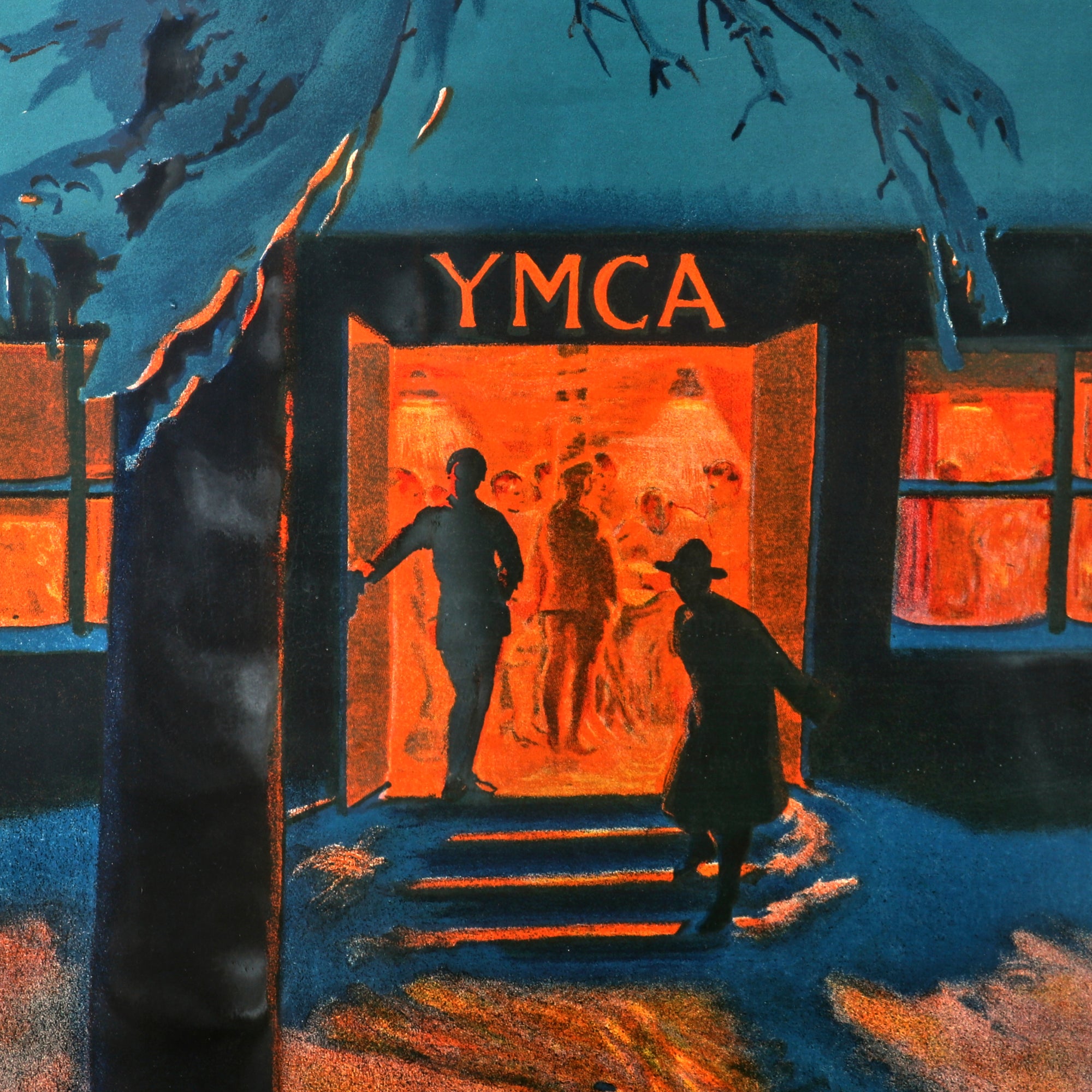 Original Item: Only One Available. Albert Herter (March 2, 1871 - February 15, 1950) was an American painter, illustrator, muralist, and interior designer. He was born in New York City, studied at the Art Students League with James Carroll Beckwith, then in Paris with Jean-Paul Laurens and Fernand Cormon. Herter had an extraordinary early career, at age 19 receiving an honorable mention at the Paris Salon (1890, La Femme de Buddha), and winning prizes from the Pennsylvania Academy of the Fine Arts (1897 Lippincott Prize, Le Soir), the American Watercolor Society (1899 Evans Prize, The Gift of Roses), and elsewhere. He was awarded medals at the 1895 Atlanta Exposition (1830, The Muse), the 1897 Nashville Exposition (The Muse), the 1900 Paris Exposition Universelle (Sorrow), and the 1901 Pan-American Exposition in Buffalo (Gloria, The Danaides). He painted covers for the Ladies' Home Journal and other magazines, and illustrated a number of books. Herter created several World War I posters.“His Home Over There” was one of many posters issued during World War I to encourage support of the war. The poster features men standing in the snow entering a cozy building labeled the YMCA. At the top of the poster, the insignias of the YMCA and the YWCA are placed with the caption, “More than 2,000 such homes for our boys- United War Work Campaign, November 11-18.” According to researcher Michelle Ule, during WW1 the YMCA provided for 90% of the general welfare to American troops numbering over 4 million with the help of 26,000 paid workers and 35,000 volunteers. They provided entertainment for the troops and managed the US mail, helping soldiers write letters to loved ones. They also provided morale boosters with religious activities and even set up roller skating rinks. They also provided coffee, tea, donuts, and cigarettes at mobile canteens, where soldiers from the front lines could come a relax and recover. The Young Women’s Christian Association, or the YWCA, aimed to support the war efforts as well. During WWI, the YWCA was responsible for forming work councils, operating hostess houses on camp grounds as well as manufacturing areas. Their mission was to do its share for men in uniform, with its main purpose to meet the needs of women and girls, including the wives and families of servicemen, nurses and employees at military posts, workers in war industries, and others directly affected by the emergency needs of the nation. The local YWCA formed a patriotic league for its members and concentrated on food conservation and Red Cross work. Throughout the Great War, the YMCA and YWCA made significant and critical contributions to the war effort (MDHS Library Department, 2014).This poster asked for donations for the United War Work Campaign for 17,500,000 dollars. The United War Work Campaign was created a the day WWI ended. It was formed by a coalition of America’s biggest organizations: YMCA, YWCA, The American Library Association, Jewish Welfare Board, Knights of Columbus, the Salvation Army, and War Camp Community Service. These groups combined were called the “Seven Sisters.” They raised money to help war-torn Europe and the troops that stayed in Europe well past 1919. The groups worked to put aside their differences to help the soldiers in Europe. This poster was created by American artist Albert Herter in either 1917 or 1918. Herter was best known for his work in interior design in New York. The poster was created and reproduced as a lithographic print at the time of it’s distribution.This is a tremendously-framed example with only a few small tears and scuffs near the top of the poster. Otherwise it’s near mint, and the colors are very well-retained. The frame measures roughly 32 x 45½”. This was professionally framed and comes ready to mount & display!