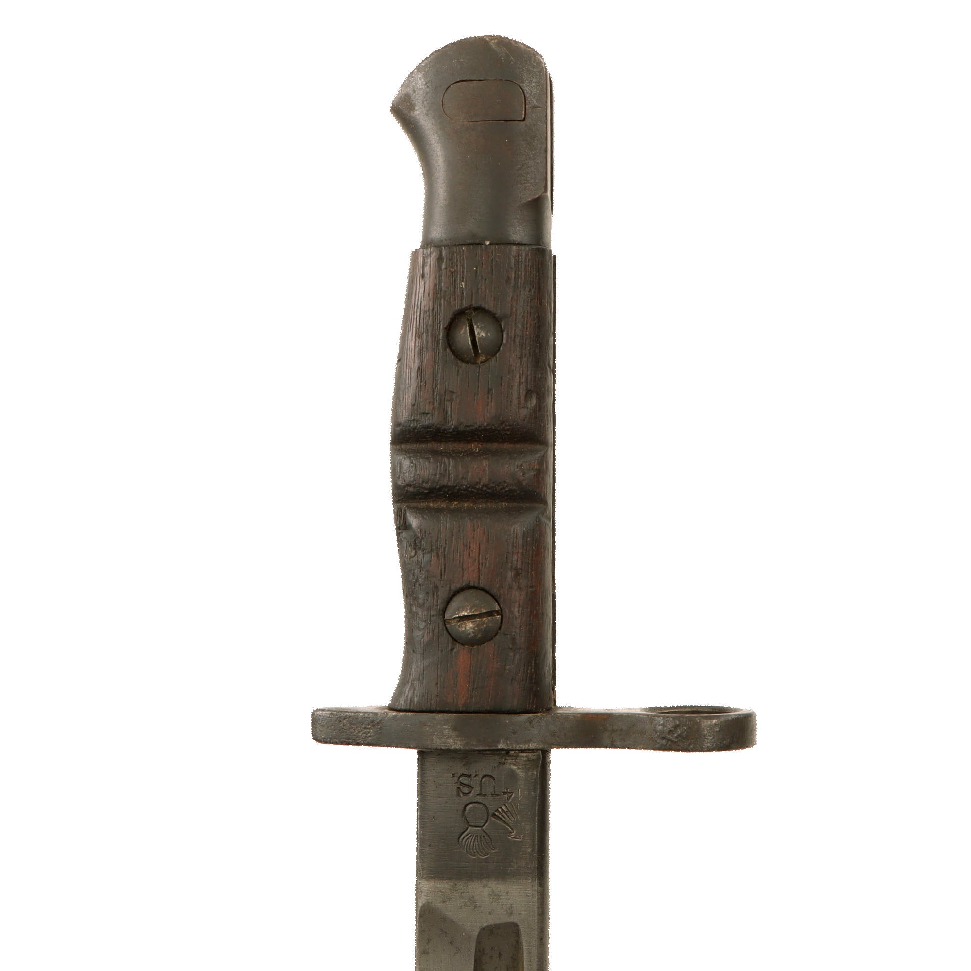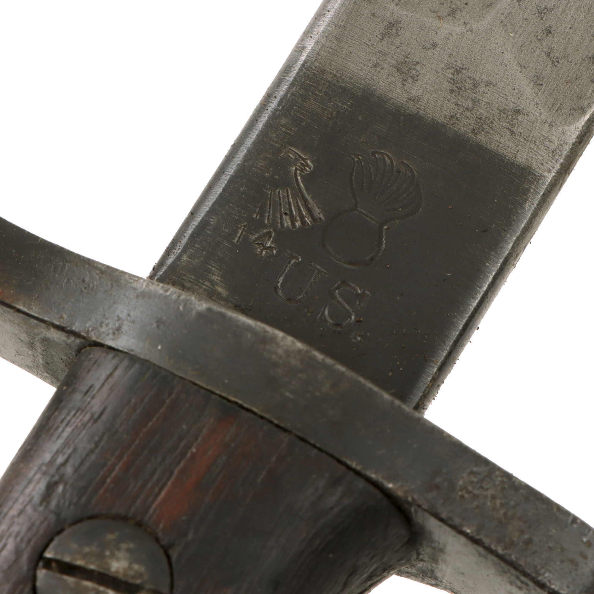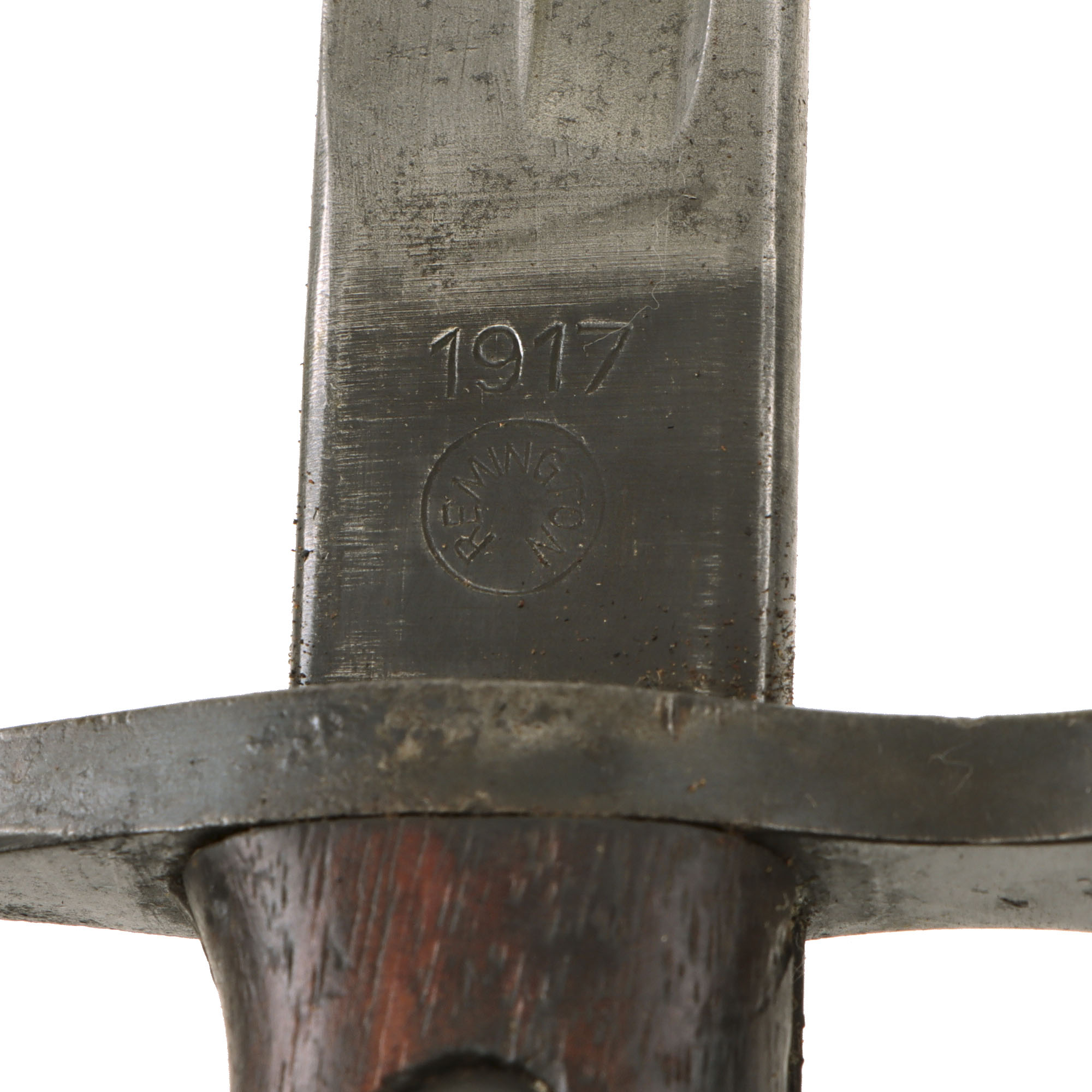This bayonet is in good condition with heavy scratching and wear, and is marked on the blade ricasso with date 1917 over the Remington logo. The reverse ricasso is marked with the ordnance "Flaming Bomb" over U.S., next to an Eagle proof mark over 14. The blade is good, and was not sharpened after the arsenal, with minor staining and some edge nicking. The handle finish is in great shape.