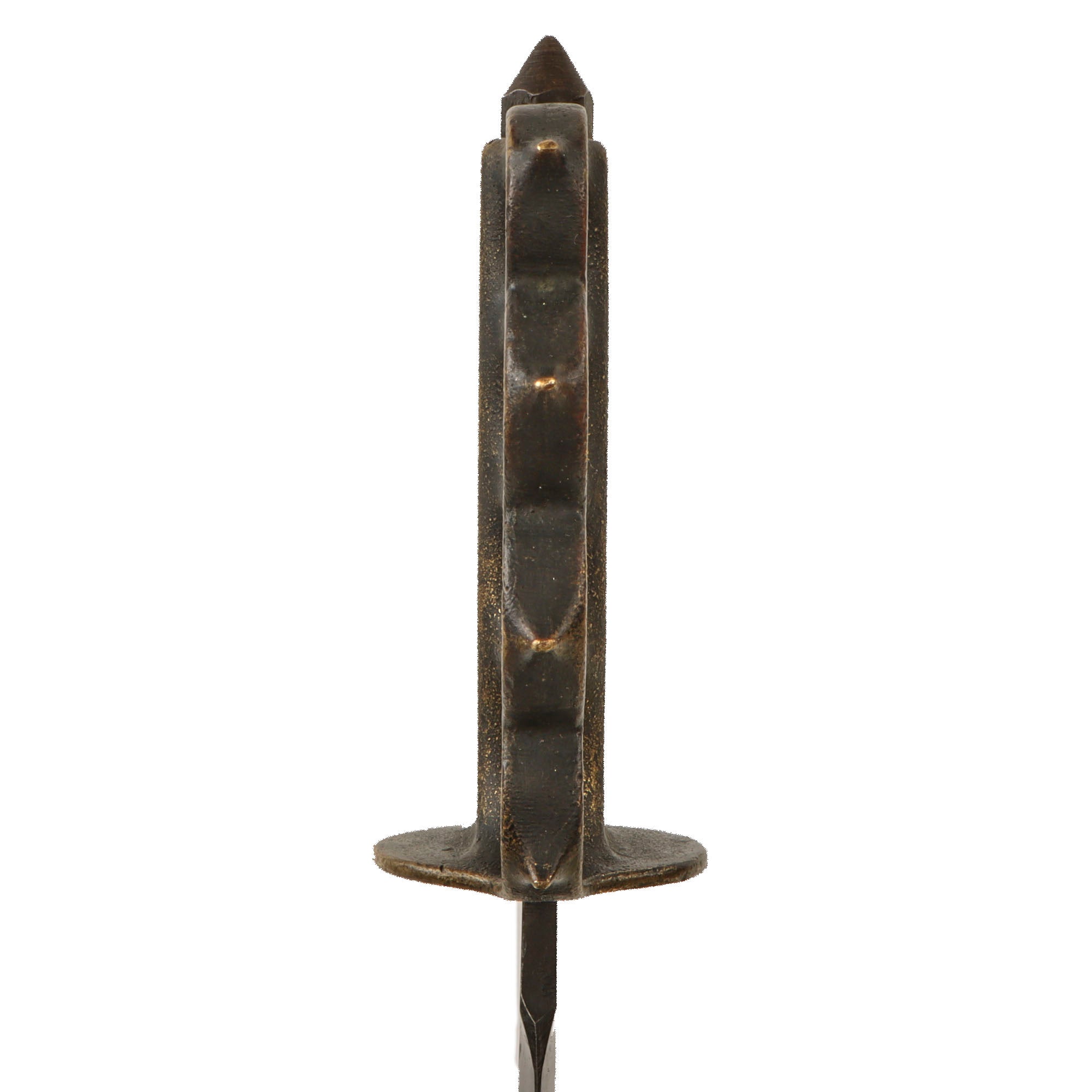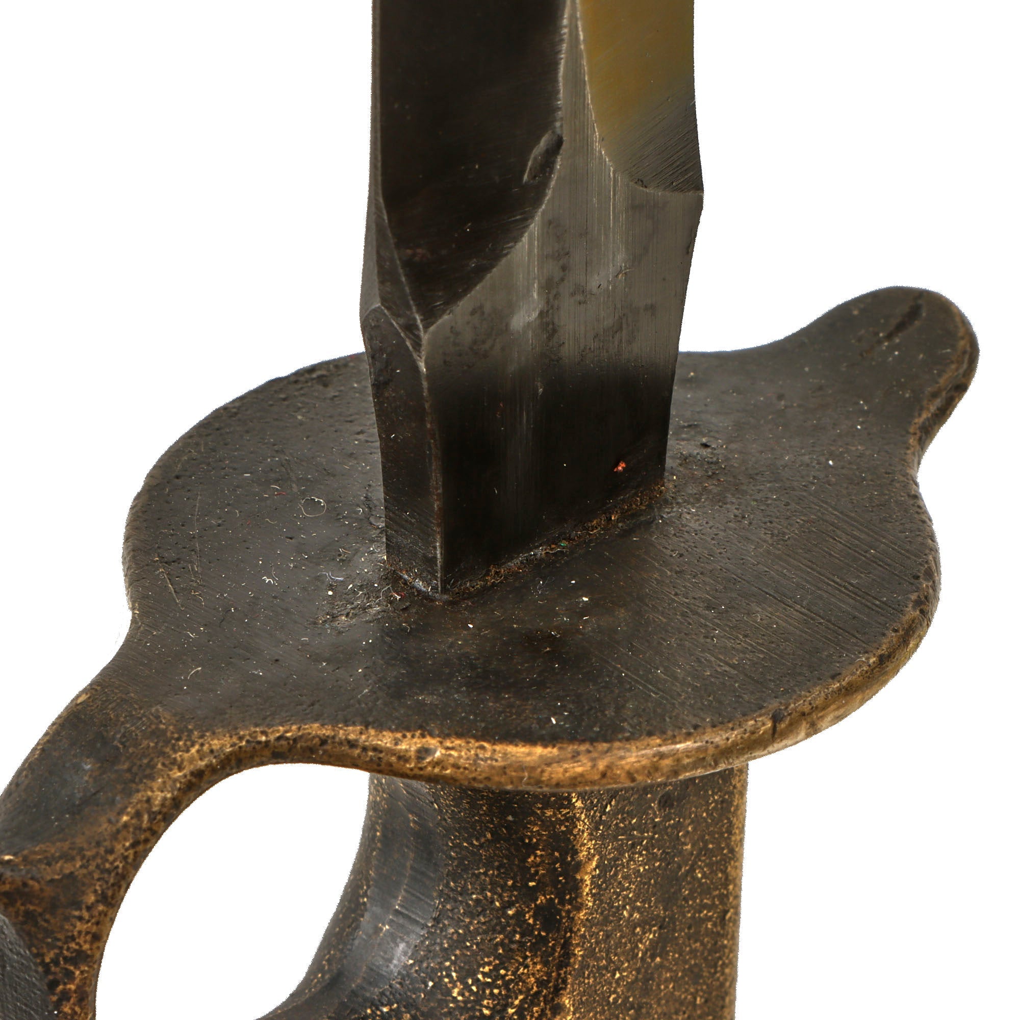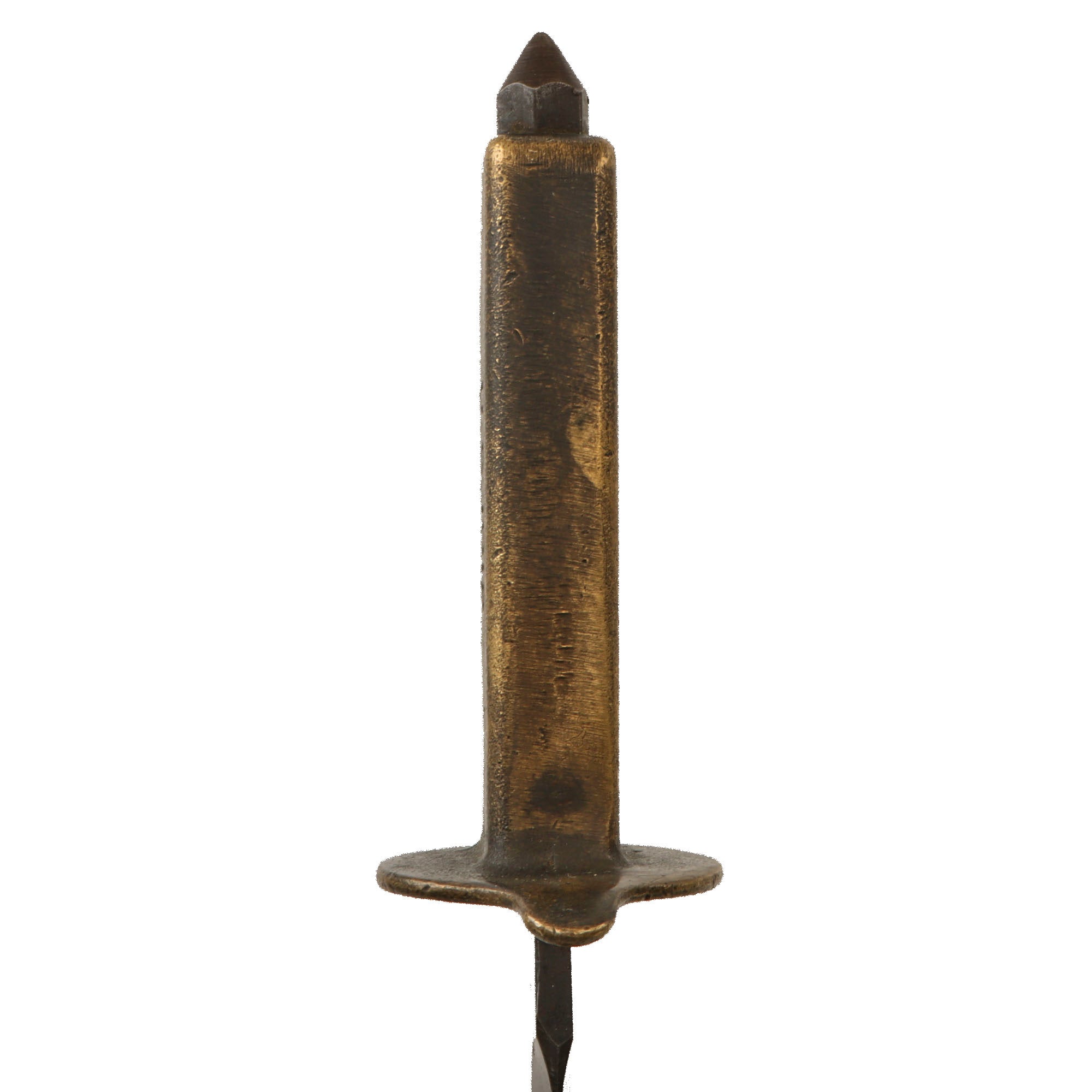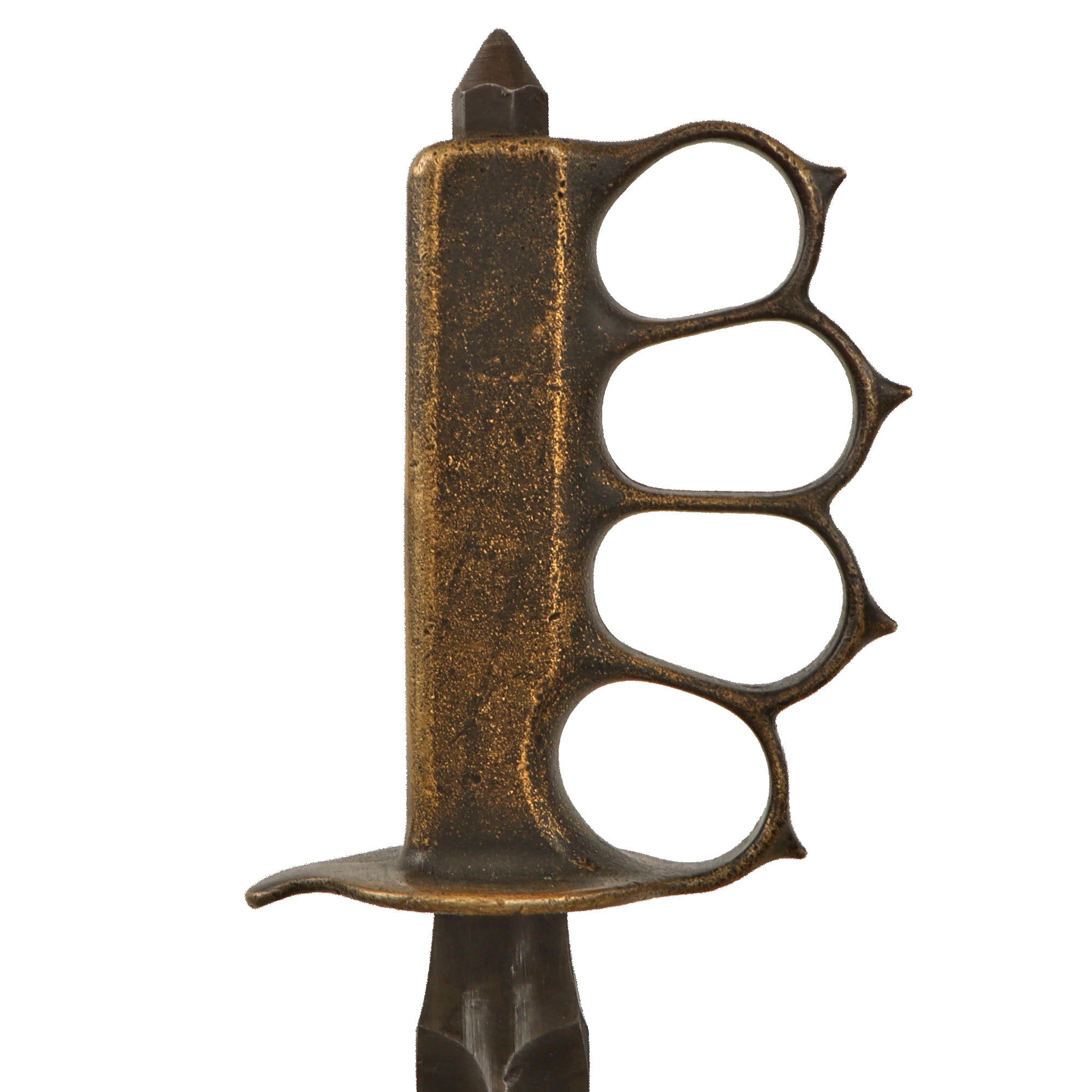 The brass grip and knuckle guard blackening is retained very much, with a great overall patina. Where the blackening is worn is a lovely aged brass dark patina. The steel dagger blade still has much of the original factory grind visible though the blade was definitely refinished after the war, with many of the past flaws being visible underneath. There is very minor edge wear with one nick. Overall this is a very nice display example of the very popular and collectible World War I era US trench knife. These brass D guard knuckle knives always make a great centerpiece to any military knife display and certainly draw attention due to their size and fierce appearance.
