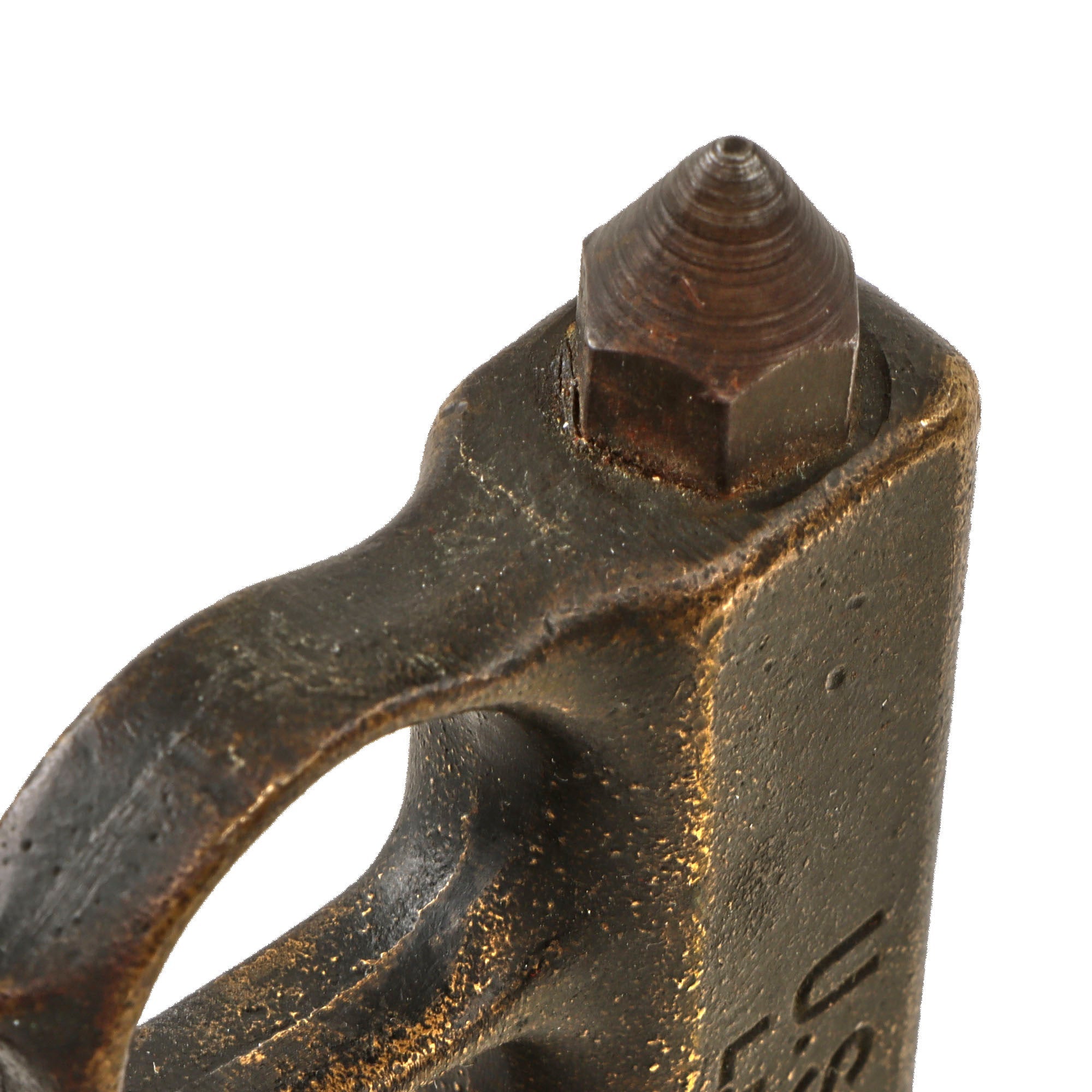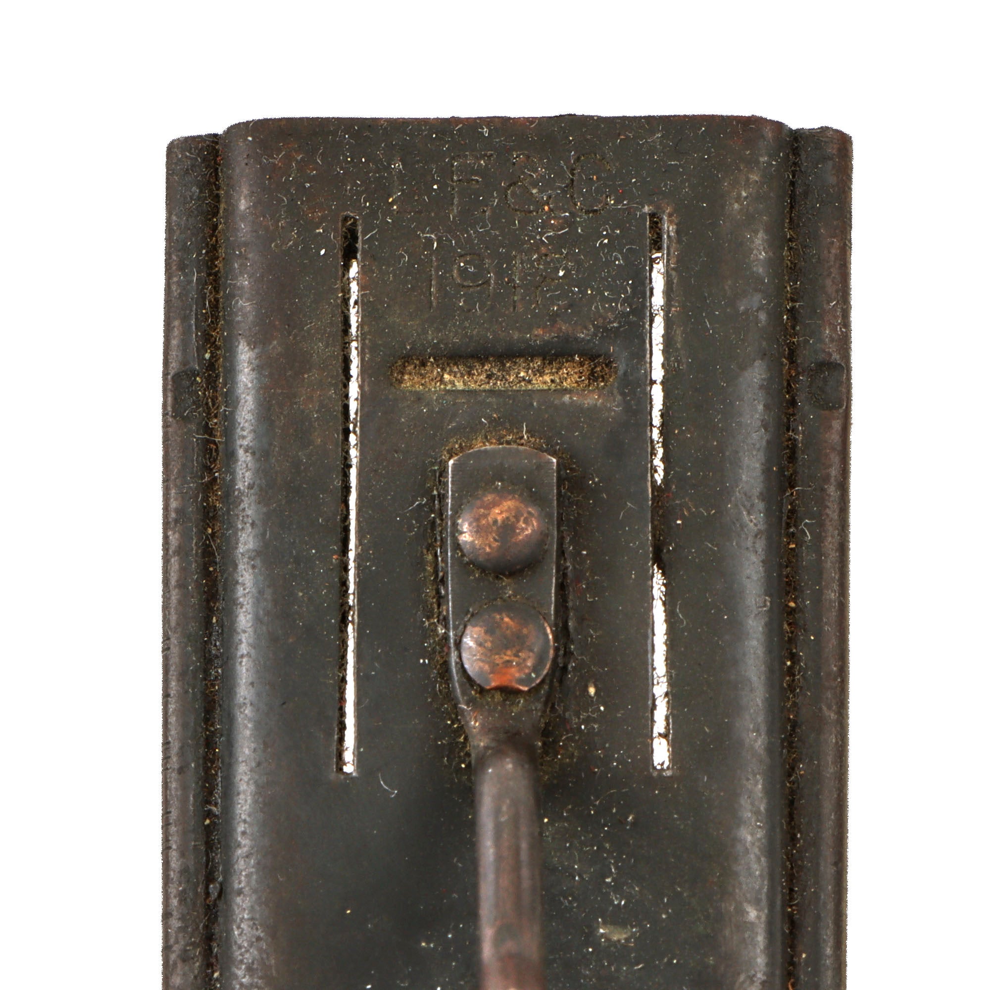 The U.S. M-1918 Mark I Trench Knife is easily identifiable due to its large "brass knuckle" style guard and grip. This knife is 11 ¾" in overall length, with a 6 ¾" dagger style blade. The overall length with scabbard is 12”. The brass grips are beautifully darkened and are marked U.S. 1918 L.F & C - 1918. The scabbard is marked LF&C 1918. One of the two hanging prongs is still fully intact as shown, but the other has torn away long ago. The blade shows a complete refinish.