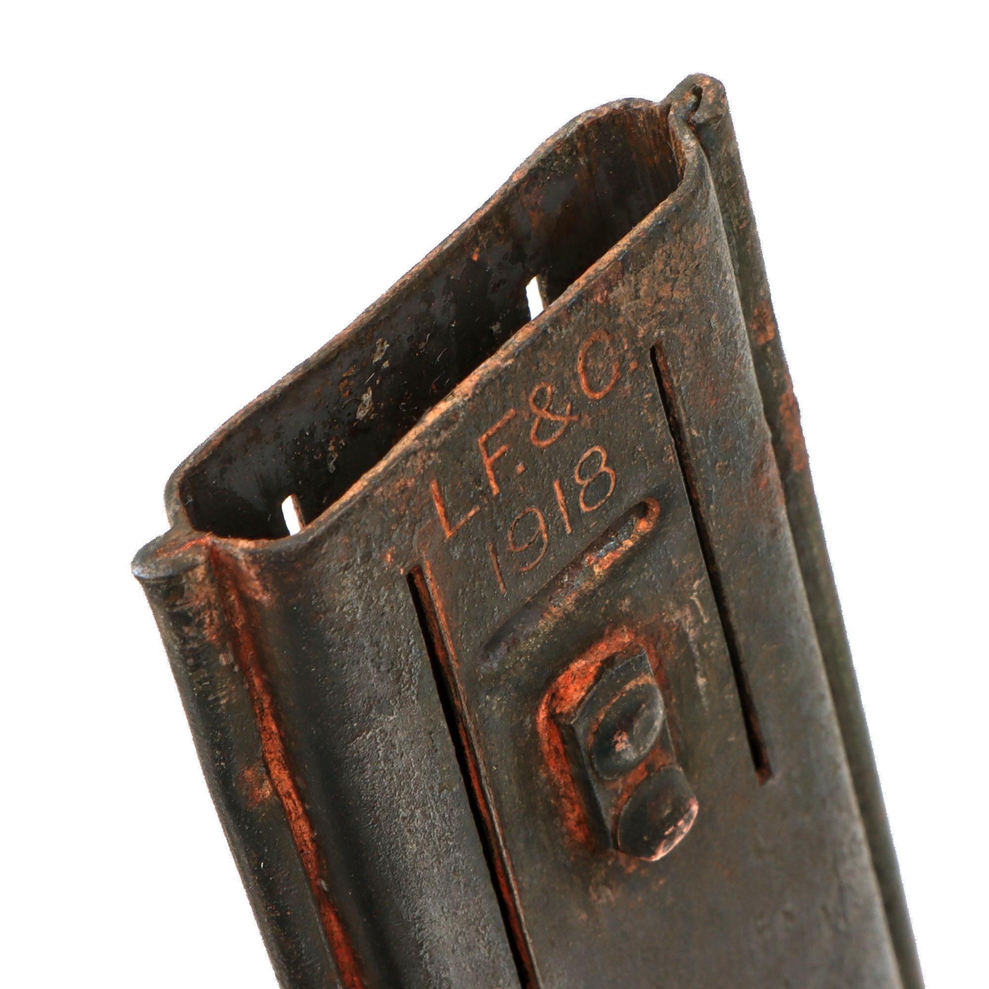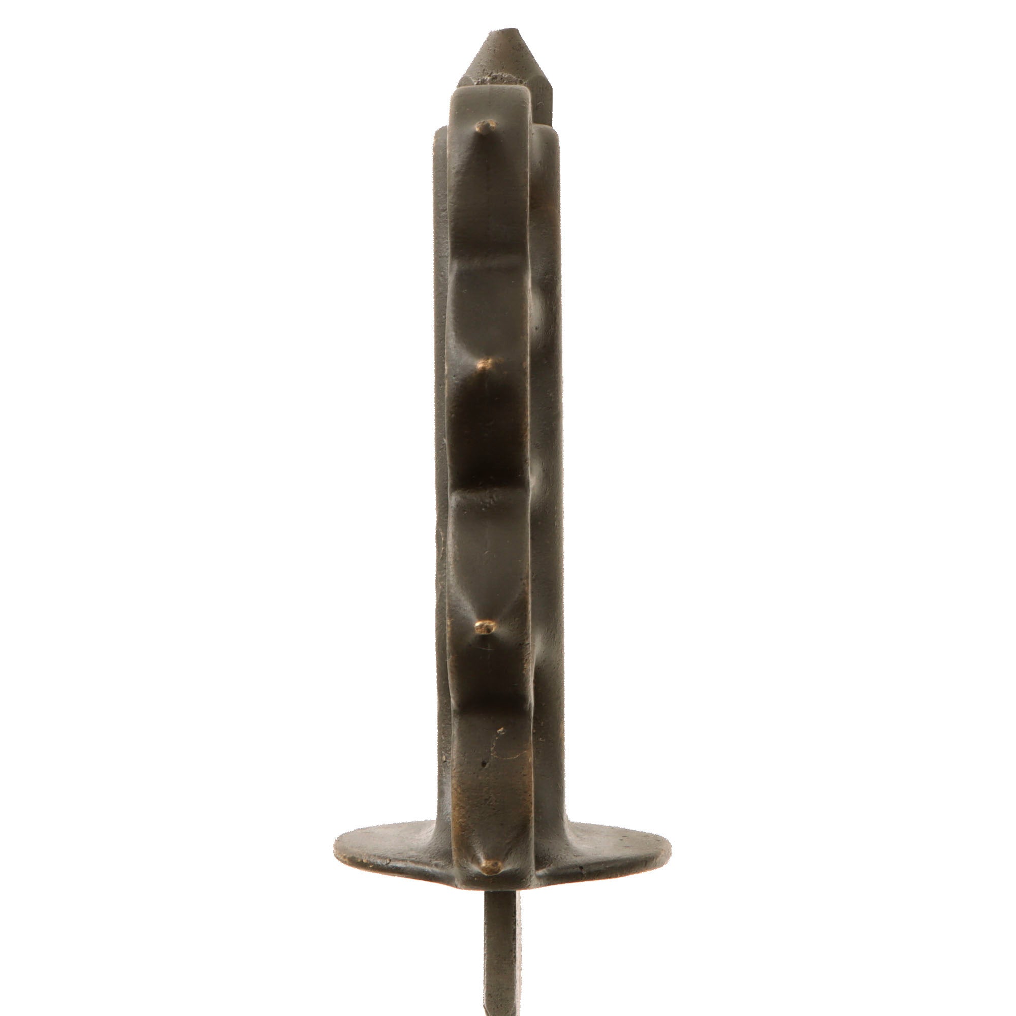 The U.S. M-1918 Mark I Trench Knife is easily identifiable due to its large "brass knuckle" style guard and grip. This knife is 11 ¾" in overall length, with a 6 ¾" dagger style blade. The overall length with scabbard is 12”. The brass grips are beautifully darkened and are marked U.S. 1918 L.F & C - 1918. The scabbard is marked LF&C 1918. The two hanging prongs are missing on this example, and there is heavy oxidation to the blade and scabbard, with the blade having been refinished over the oxidation.