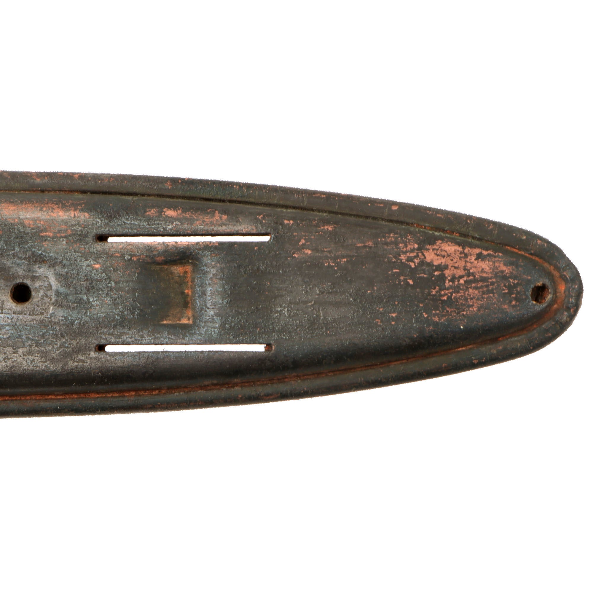 As originally issued, the knives were entirely blackened; both the blades and the brass knuckle hilts. These knives remained in use with the US military, classified as limited standard (secondary issue) through January of 1945, when the knives were officially classified as obsolete. As originally issued, the knives were carried in a blued sheet steel scabbard that was typically maker marked, and was equipped with a pair of wire tabs that were intended to engage the US pistol web belt in use at that time. Many of the knives issued during World War II ended up in substitute leather scabbards of various designs and styles, many of which were "theater made".