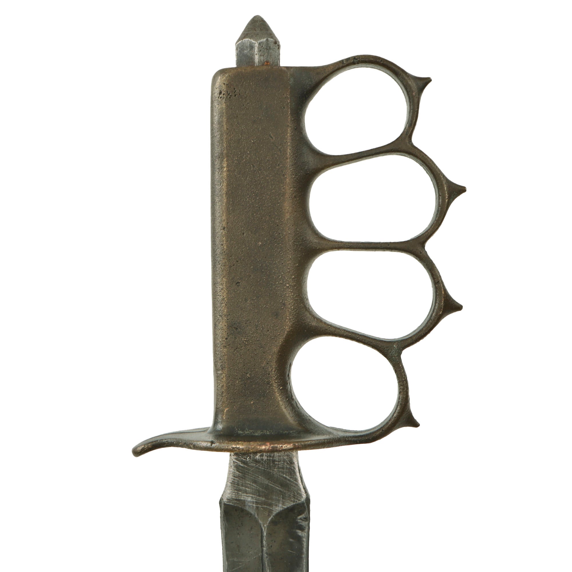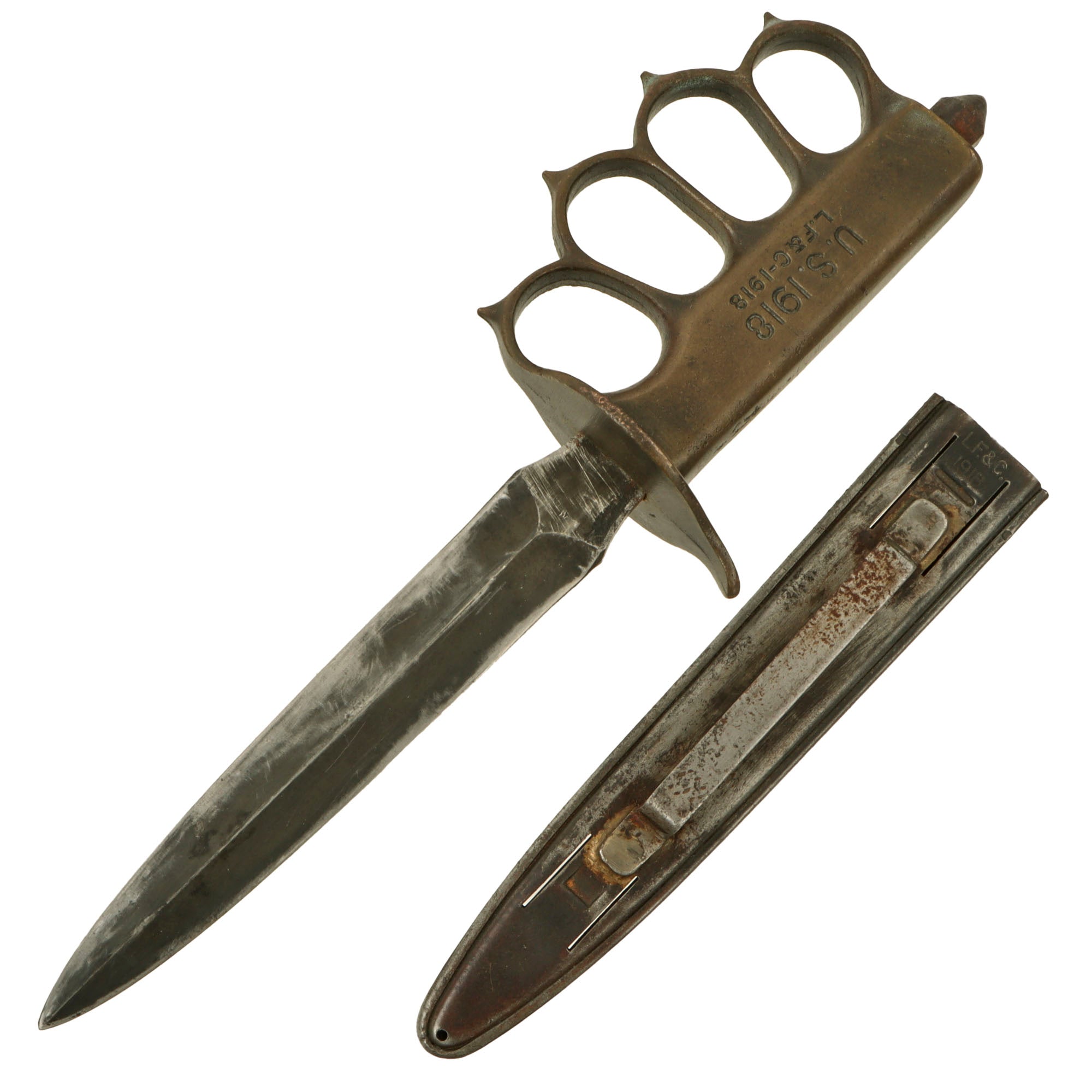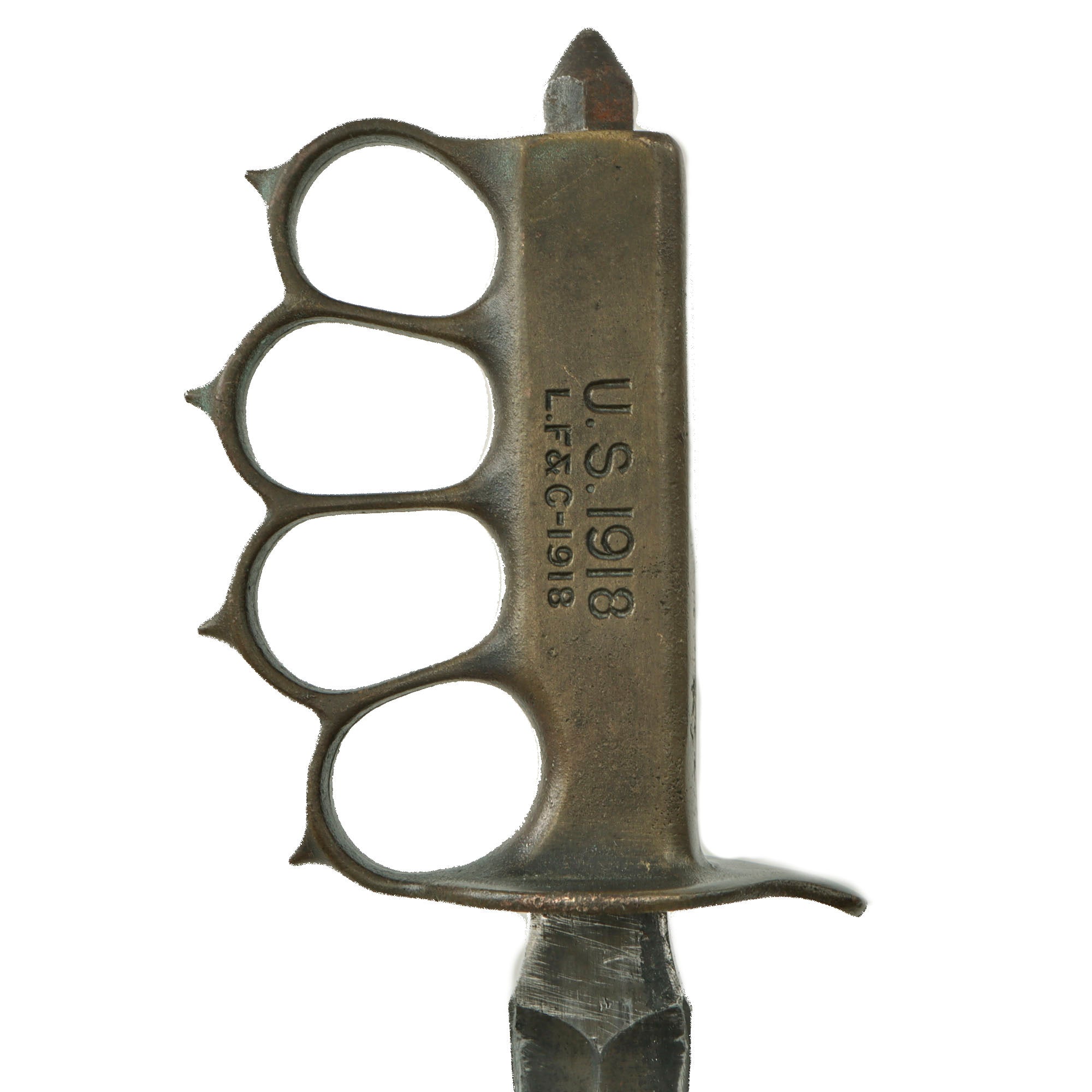 Original Item: Only One Available. The U.S. Model 1918 Mark I Trench Knife was the second major "Knuckle Knife" to be officially adopted and issued to the US military. It was developed for use in the horrific trench warfare that typified the stalemate on the Western Front during the latter part of World War One and saw use not only there, but during World War Two as well. The knife was manufactured in the United States by Henry Disston & Sons (H.D. & S.) as well as Landers, Frary & Clark (L.F. & C.) and Oneida Community Ltd (O.C.L.). The knives were also produced in France and are marked with the usual 1918 and US marks, as well as Au Lion on the blade. Whether this mark was a maker's mark or simply a motto is not known.