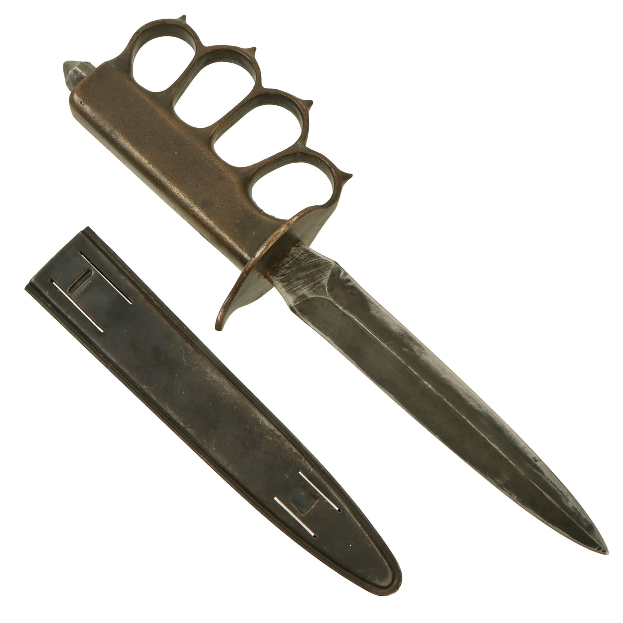 As originally issued, the knives were entirely blackened; both the blades and the brass knuckle hilts. These knives remained in use with the US military, classified as limited standard (secondary issue) through January of 1945, when the knives were officially classified as obsolete. As originally issued, the knives were carried in a blued sheet steel scabbard that was typically maker marked, and was equipped with a pair of wire tabs that were intended to engage the US pistol web belt in use at that time. Many of the knives issued during World War II ended up in substitute leather scabbards of various designs and styles, many of which were "theater made".