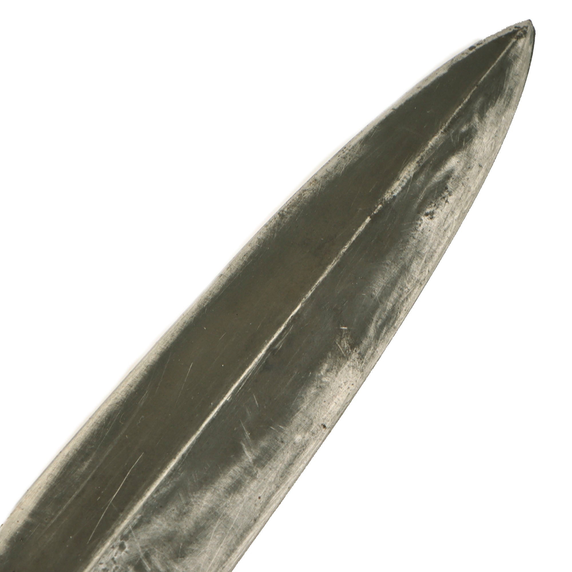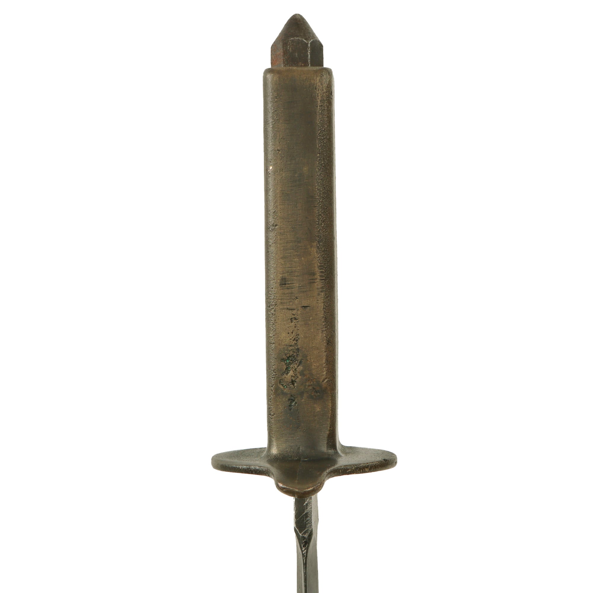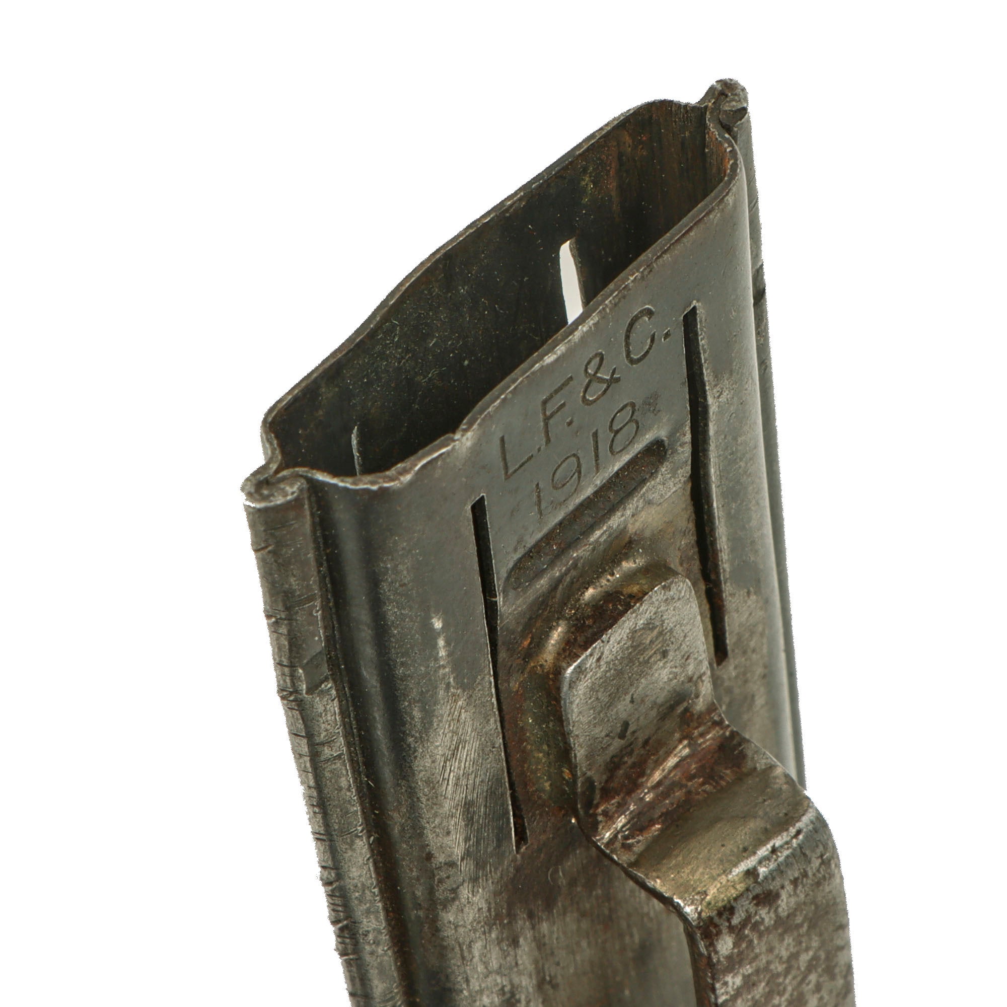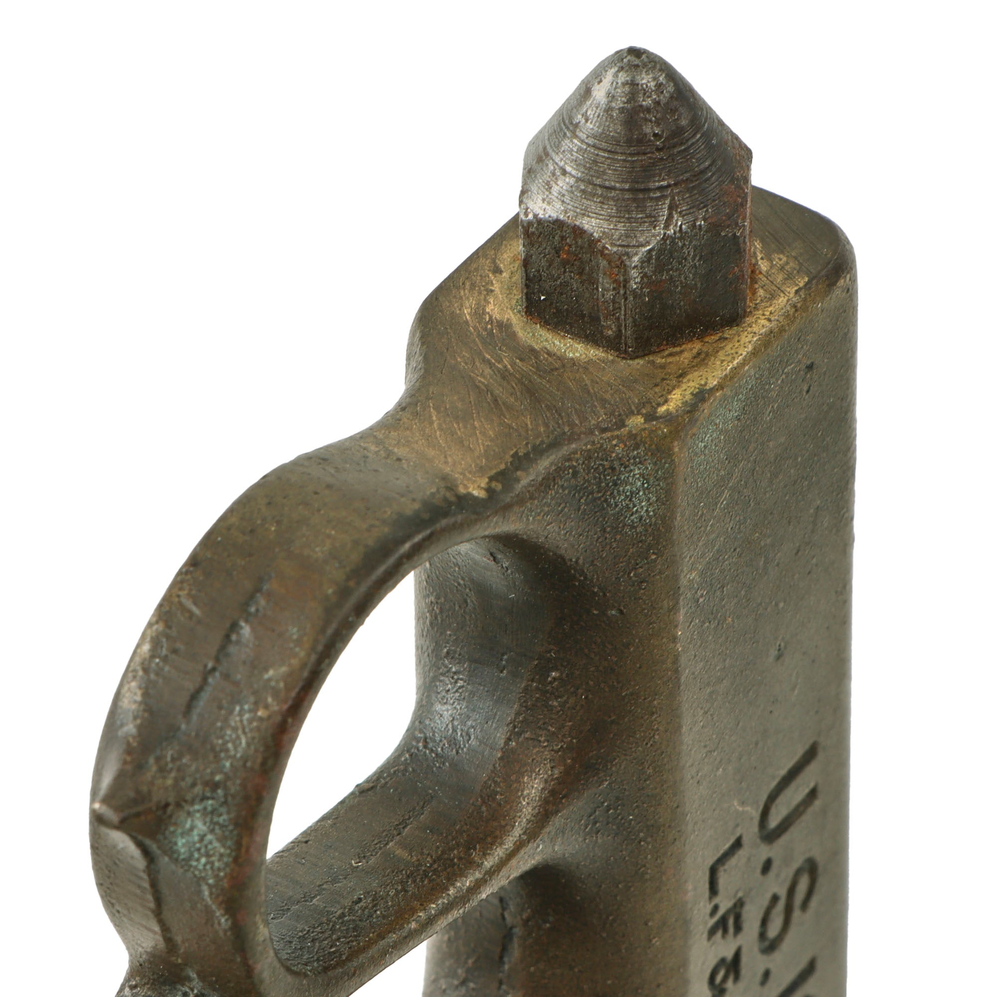 The U.S. M-1918 Mark I Trench Knife is easily identifiable due to its large "brass knuckle" style guard and grip. This knife is 11 ¾" in overall length, with a 6 ¾" dagger style blade. The overall length with scabbard is 12”. The brass grips are beautifully darkened and are marked U.S. 1918 / L.F & C - 1918. The scabbard is marked LF&C 1918. The scabbard has been modified, likely during the World War II period, for wear on a standard belt. It does not fit on an M1912 Pistol belt, so we aren’t sure what belt it was meant to fit. Perhaps it was captured by a German who modified the scabbard to fit on his belt.