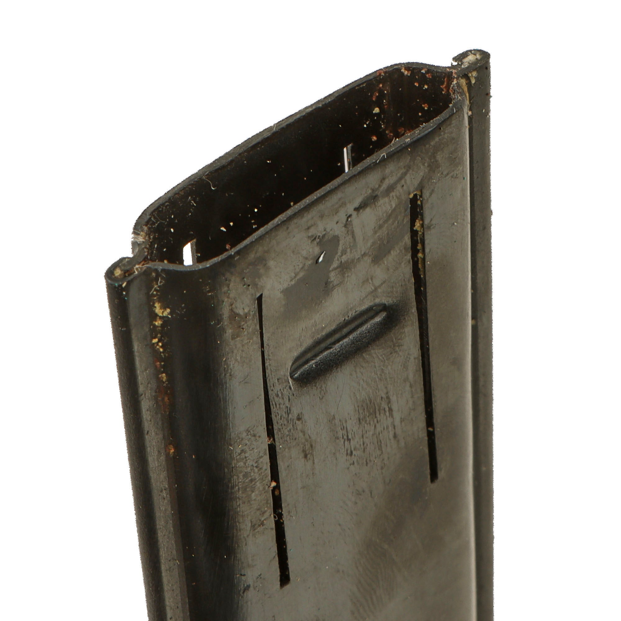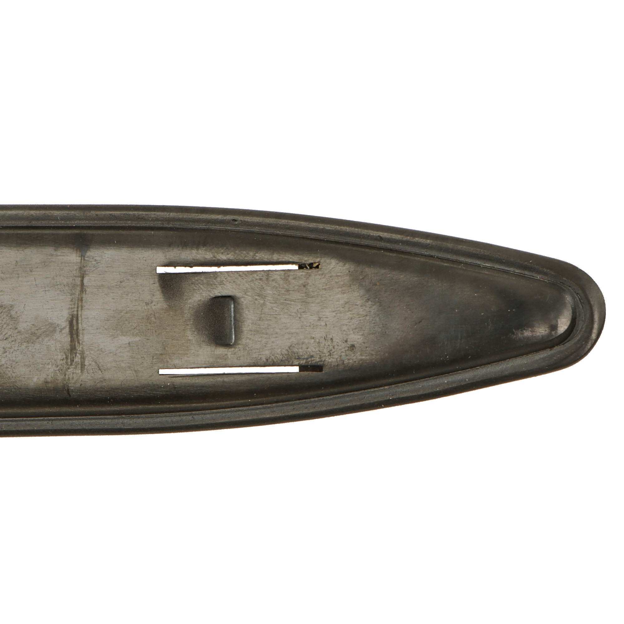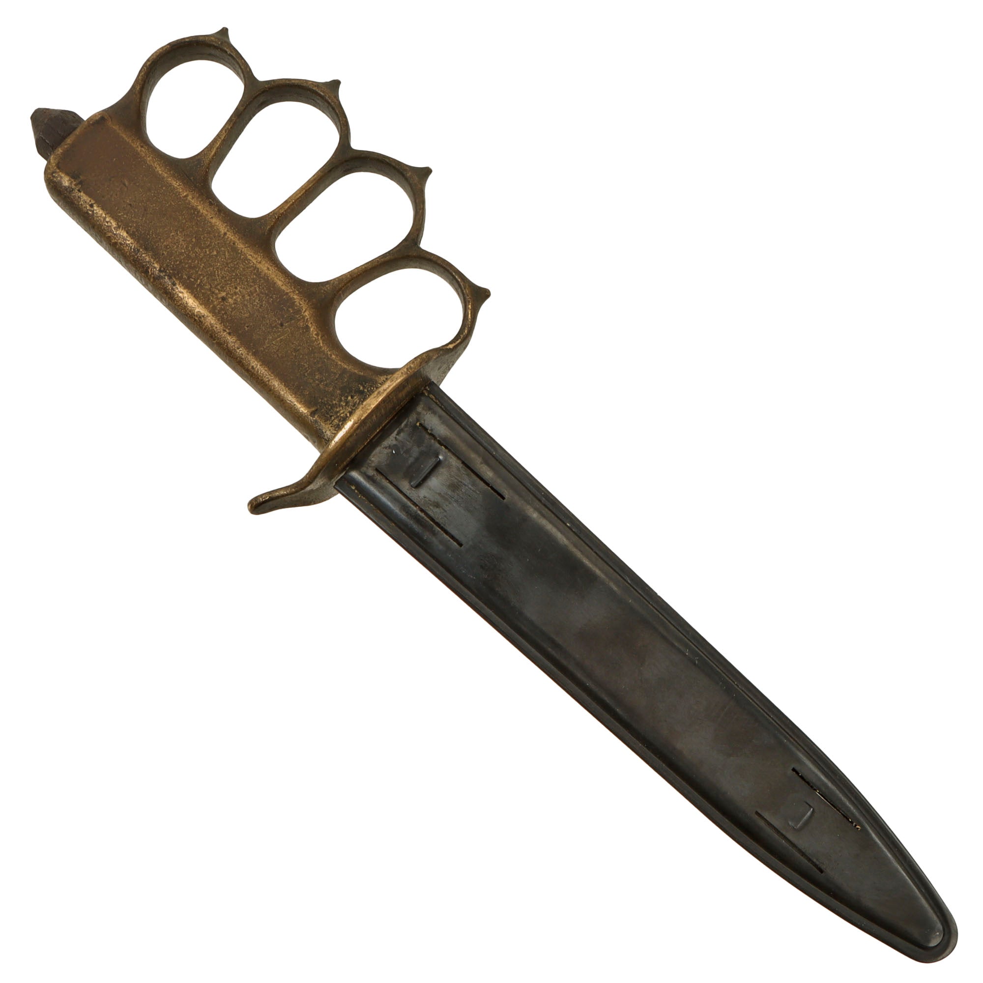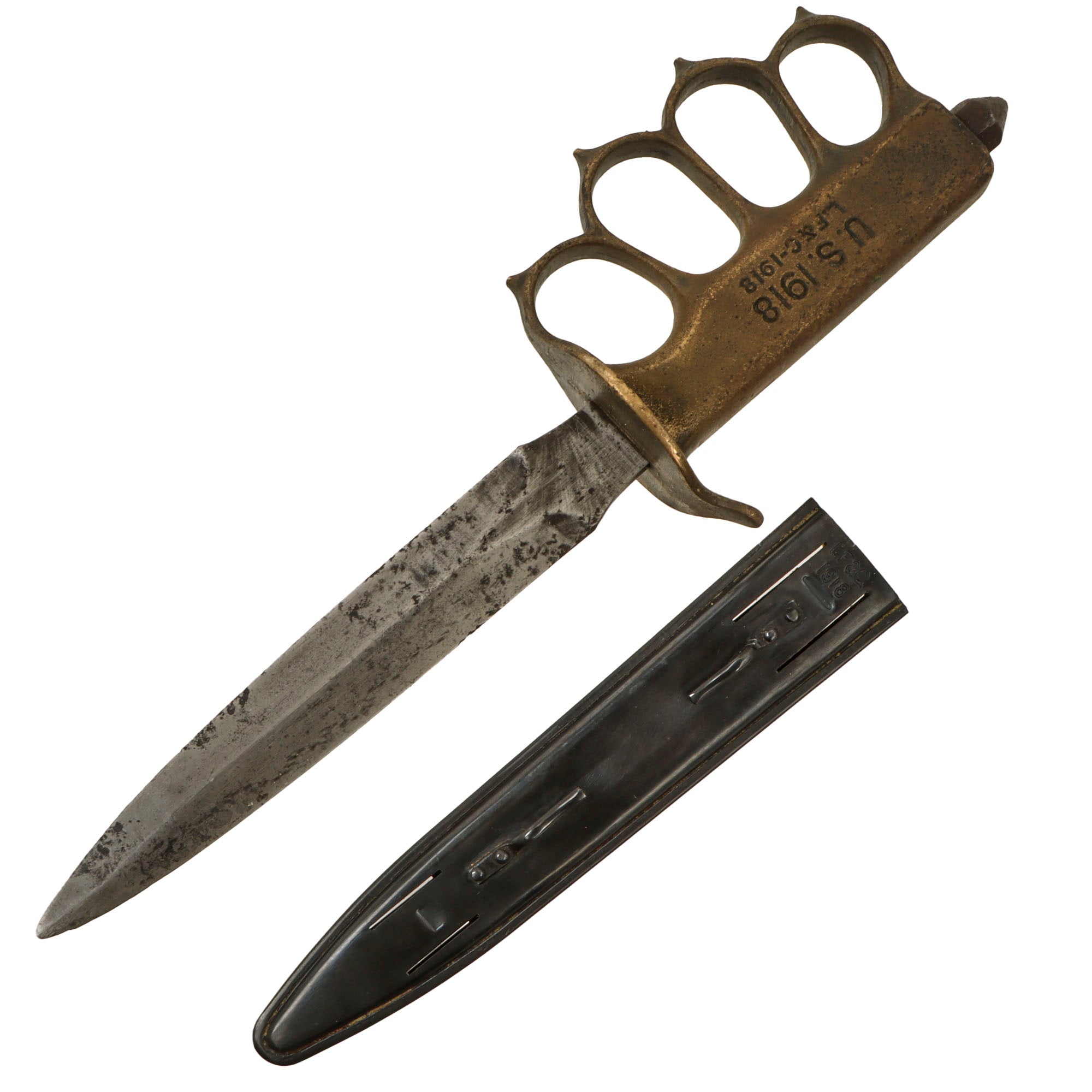 As originally issued, the knives were entirely blackened; both the blades and the brass knuckle hilts. These knives remained in use with the US military, classified as limited standard (secondary issue) through January of 1945, when the knives were officially classified as obsolete. As originally issued, the knives were carried in a blued sheet steel scabbard that was typically maker marked, and was equipped with a pair of wire tabs that were intended to engage the US pistol web belt in use at that time. Many of the knives issued during World War II ended up in substitute leather scabbards of various designs and styles, many of which were "theater made".