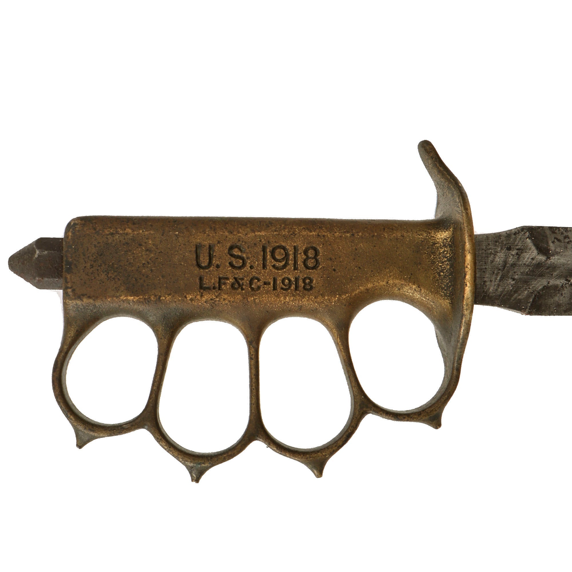 Original Item: Only One Available. The U.S. Model 1918 Mark I Trench Knife was the second major "Knuckle Knife" to be officially adopted and issued to the US military. It was developed for use in the horrific trench warfare that typified the stalemate on the Western Front during the latter part of World War One and saw use not only there, but during World War Two as well. The knife was manufactured in the United States by Henry Disston & Sons (H.D. & S.) as well as Landers, Frary & Clark (L.F. & C.) and Oneida Community Ltd (O.C.L.). The knives were also produced in France and are marked with the usual 1918 and US marks, as well as Au Lion on the blade. Whether this mark was a maker's mark or simply a motto is not known.