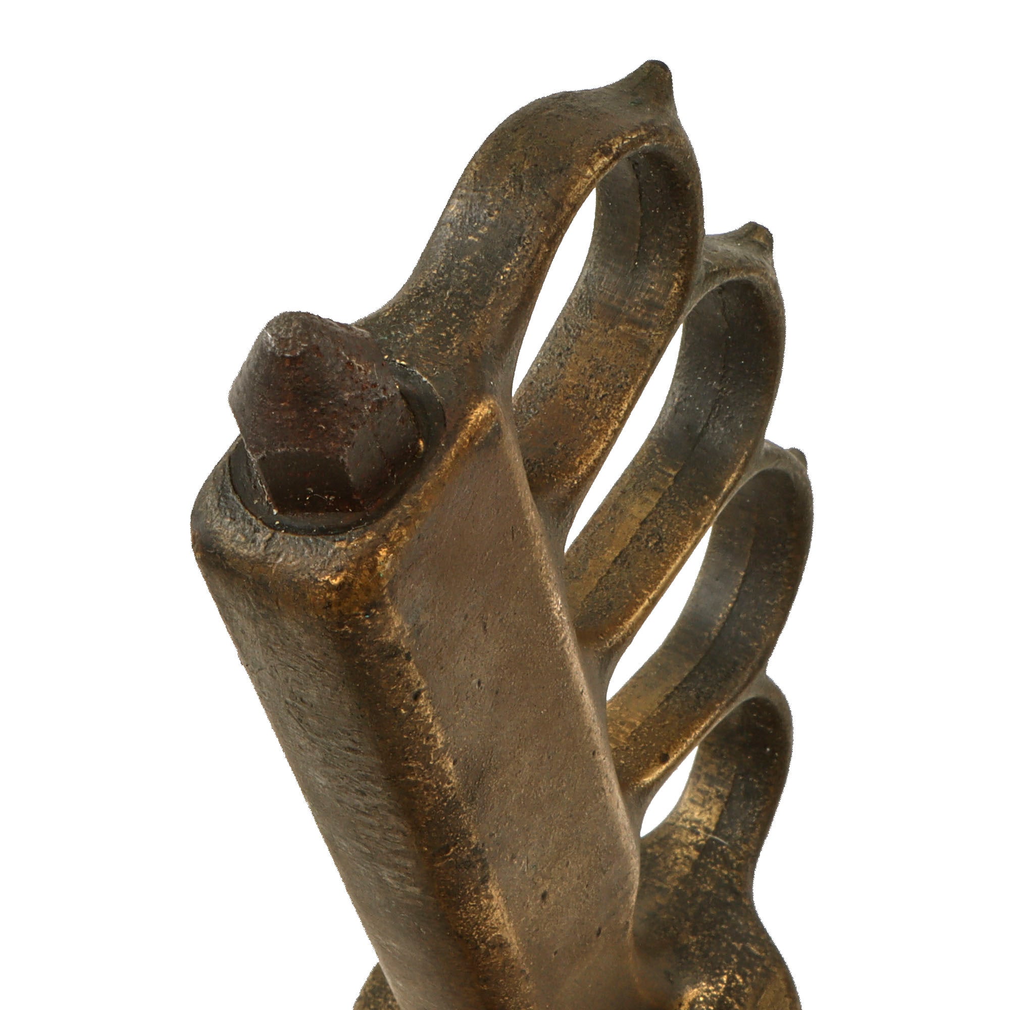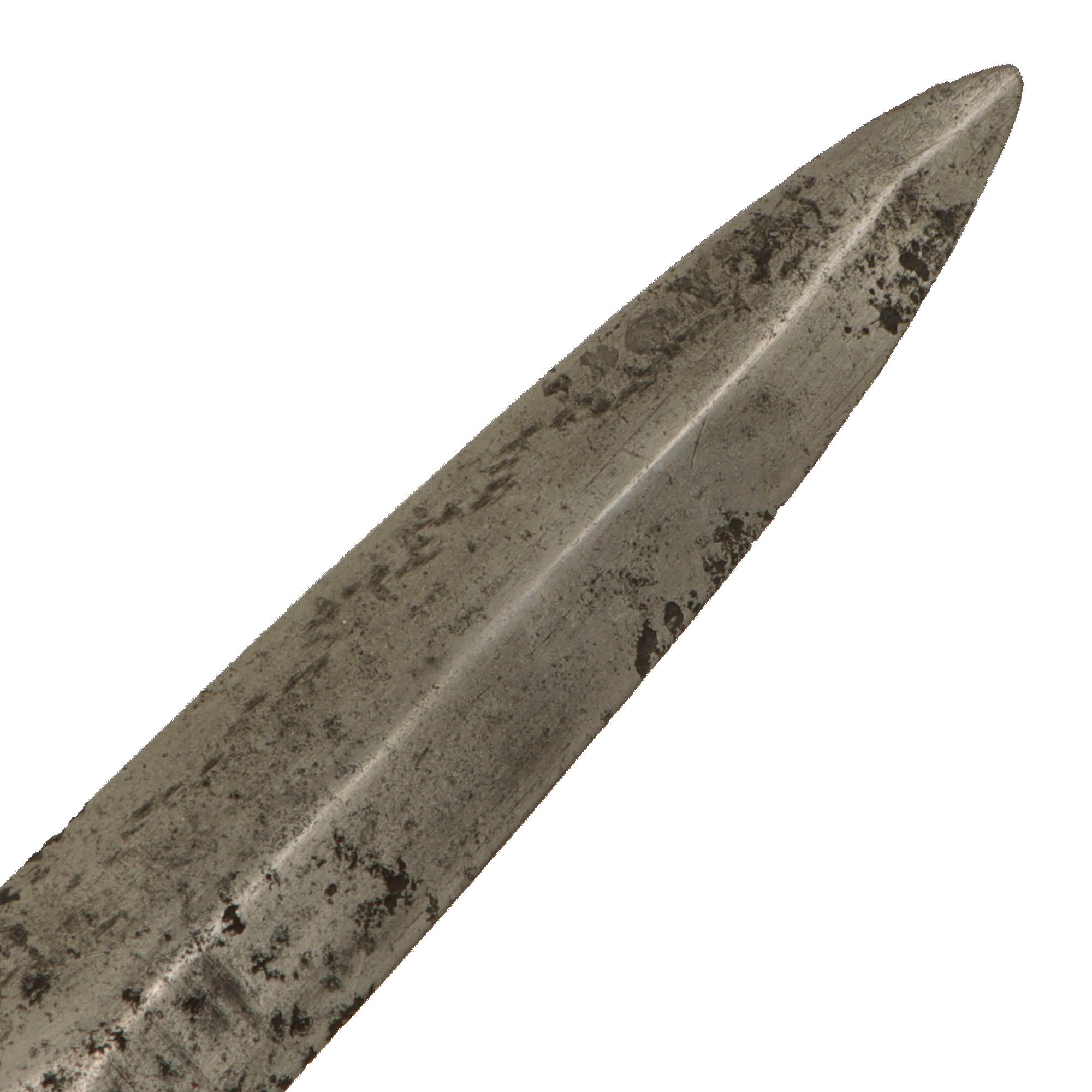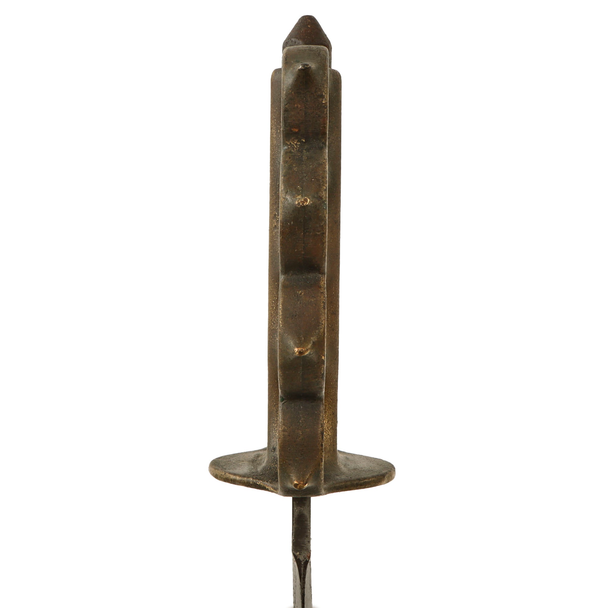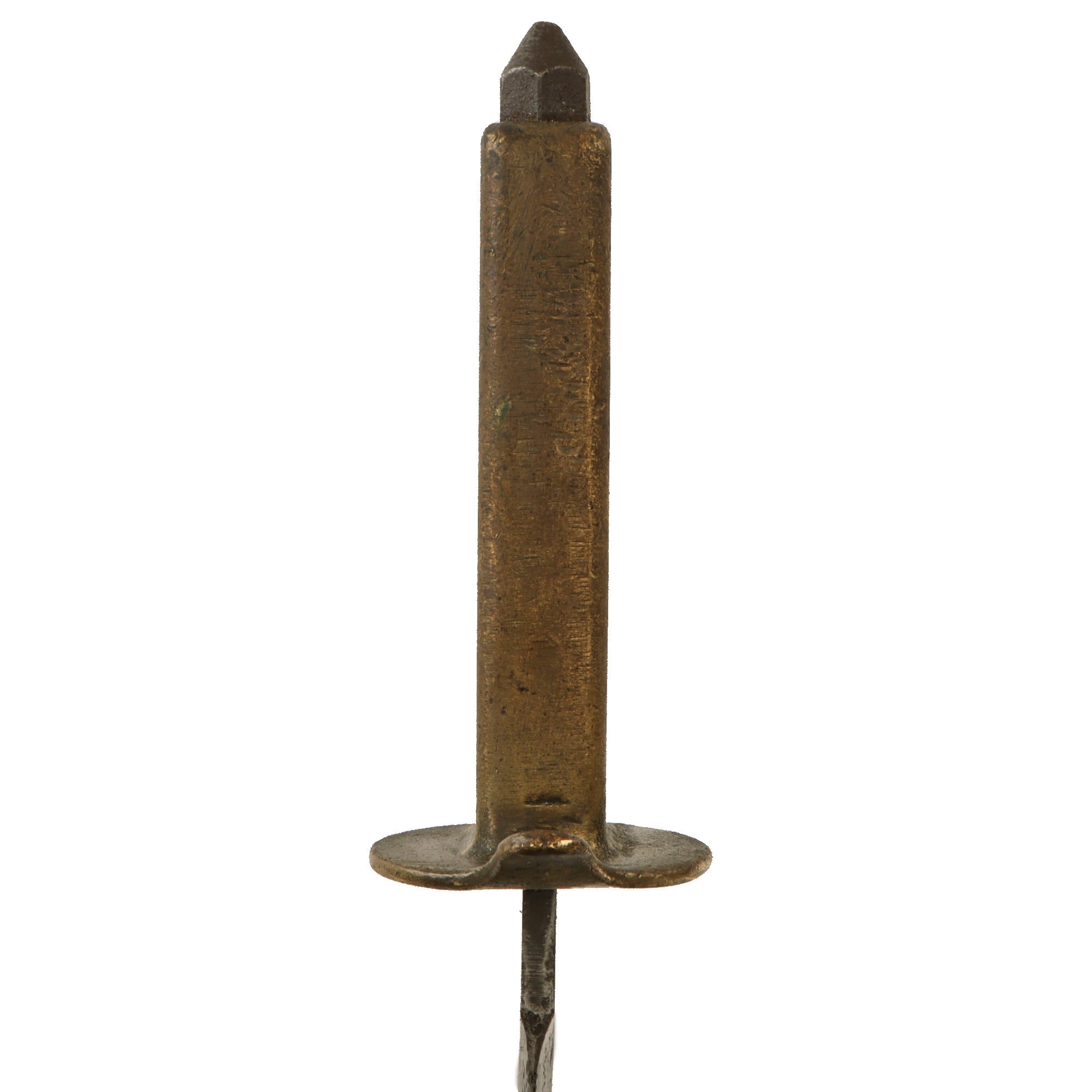 As with most we see, the blackening on the handle has been heavily worn away, with a fair amount retained in the recessed areas such as between the knuckle spikes. It is about 50% retained overall. The blade has some heavy oxidation in spots, but this gives the knife a good “field-worn” patina overall. The end of the crossguard has been bent downwards as shown.