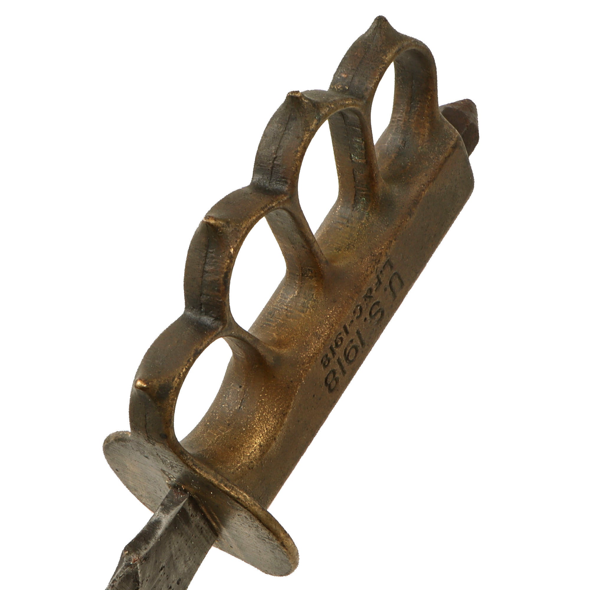 This Mark I Trench Knife is clearly marked in two lines in the brass grip: