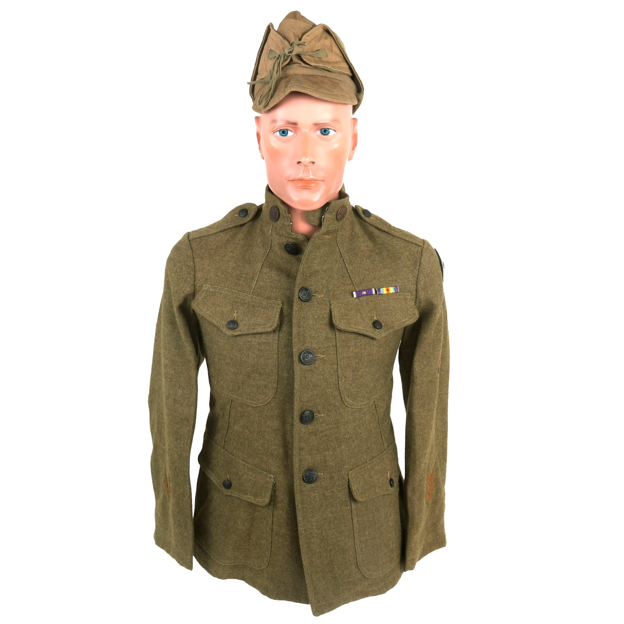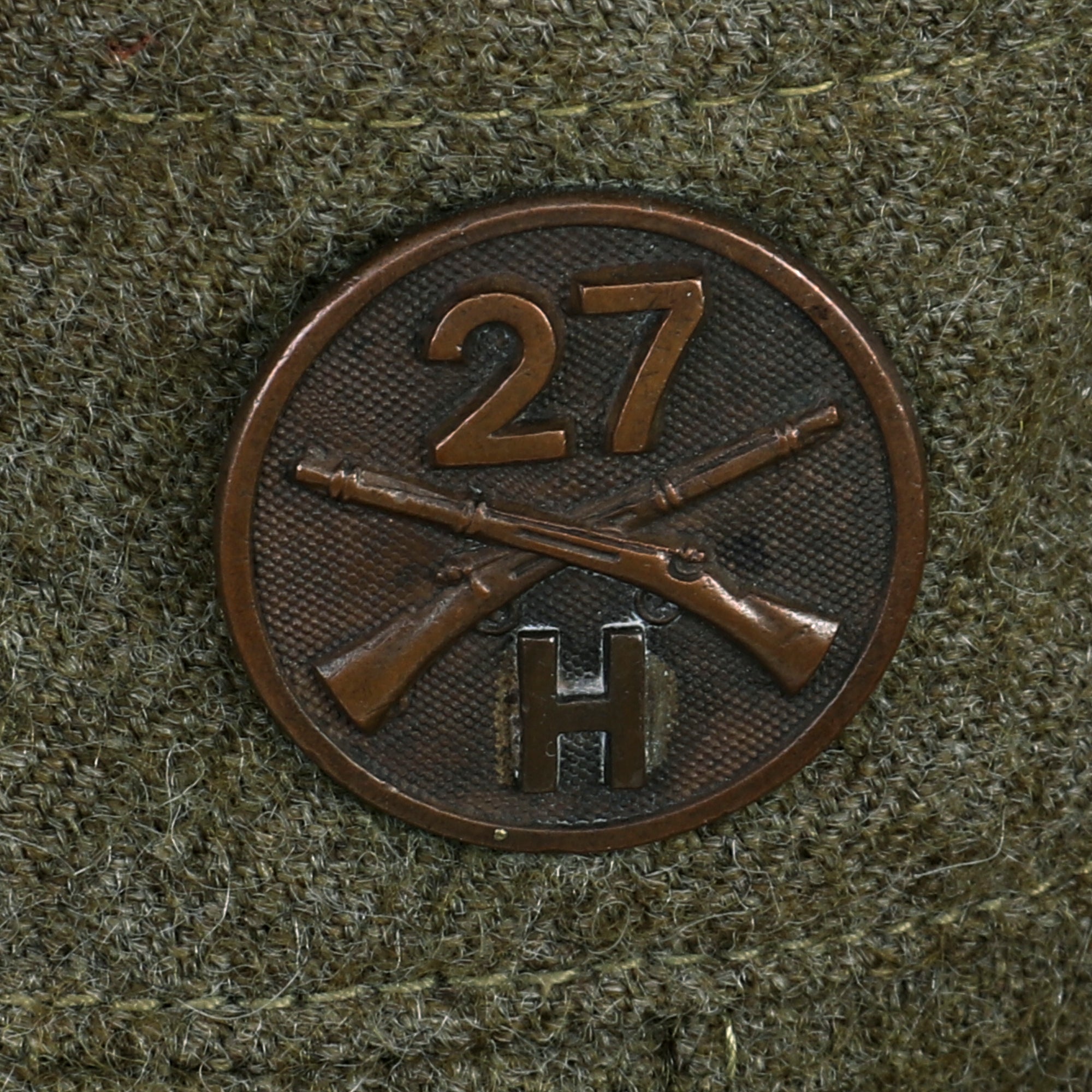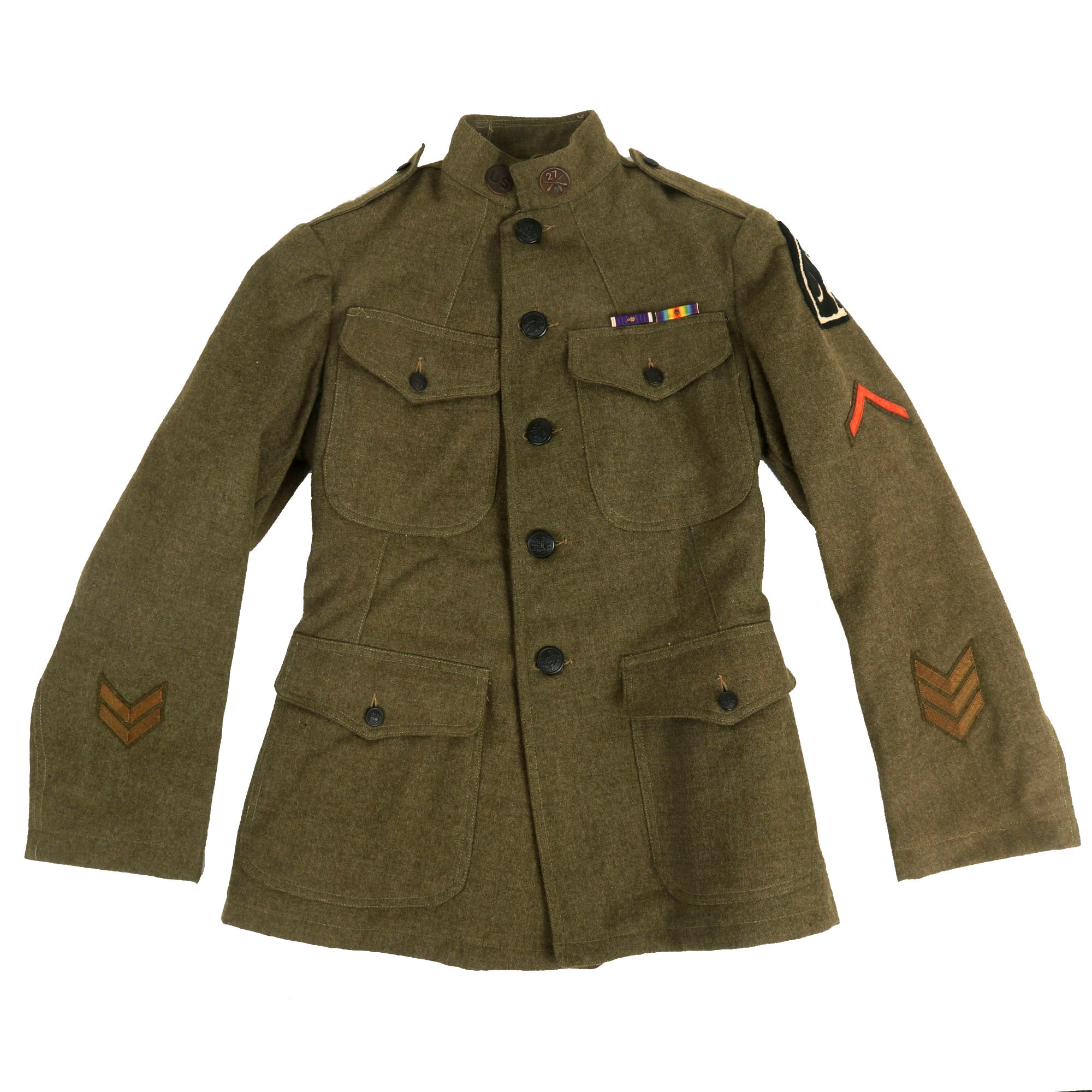 The uniform has an incredibly attractive “wolfhounds” patch on the left shoulder. This is the SSI for the 27th Infantry Regiment. During the Russian Civil War, the 27th Infantry served in the American Expeditionary Force sent to Siberia in 1918. The troops embarked on the Army transports Crook, Merritt and Warren departing Manila on 7 August 1918 and arriving Vladivostok on 15 and 16 August. This campaign has become an integral part of the regiment's history. The tenacious pursuit tactics of the regiment won the respect of the Bolsheviks, who gave them the name "Wolfhounds." This emblem continues to serve as the symbol of the 27th Infantry Regiment. During their time in Siberia, the unit was part of the Evgenevka incident, a face-off between the Wolfhounds and the Japanese Military.