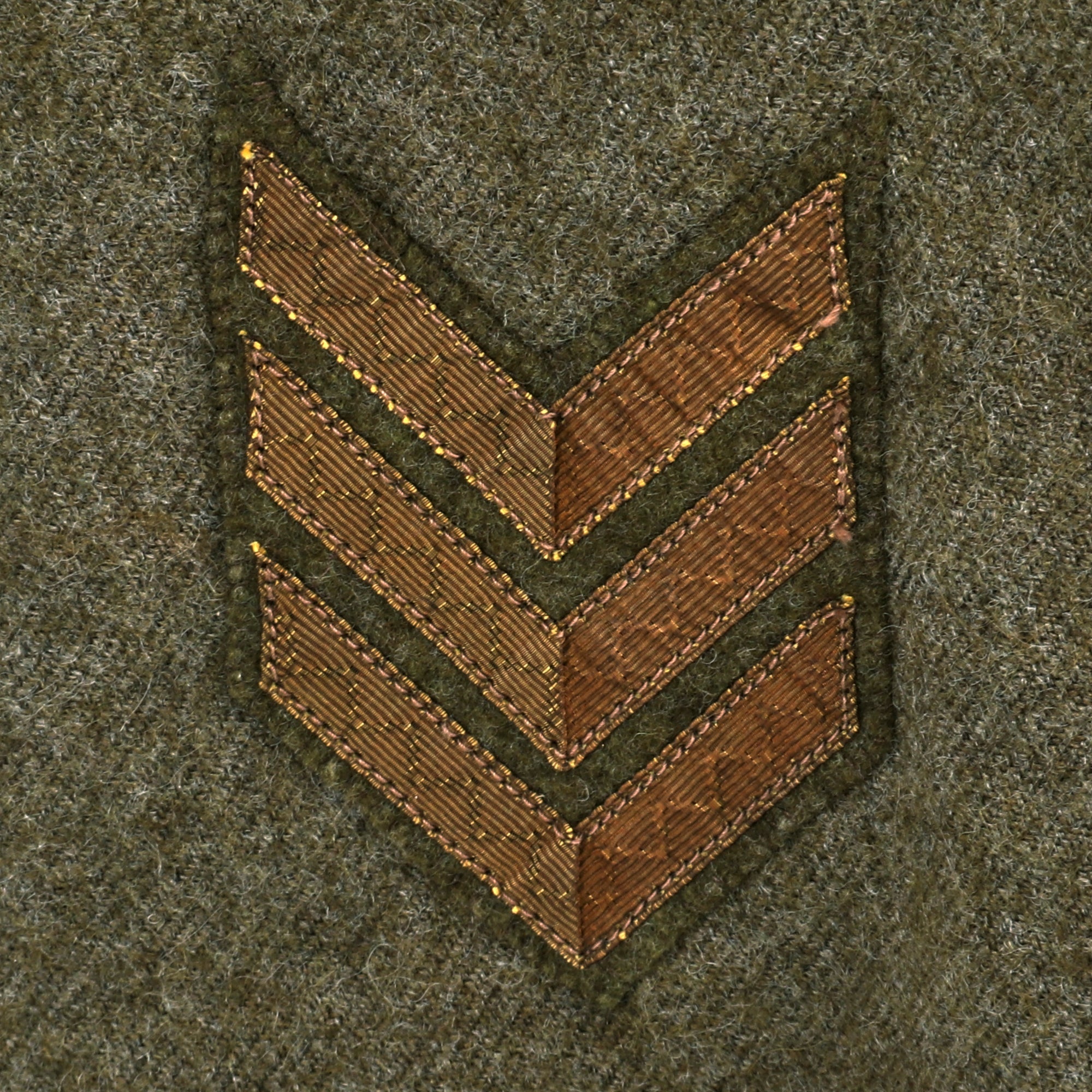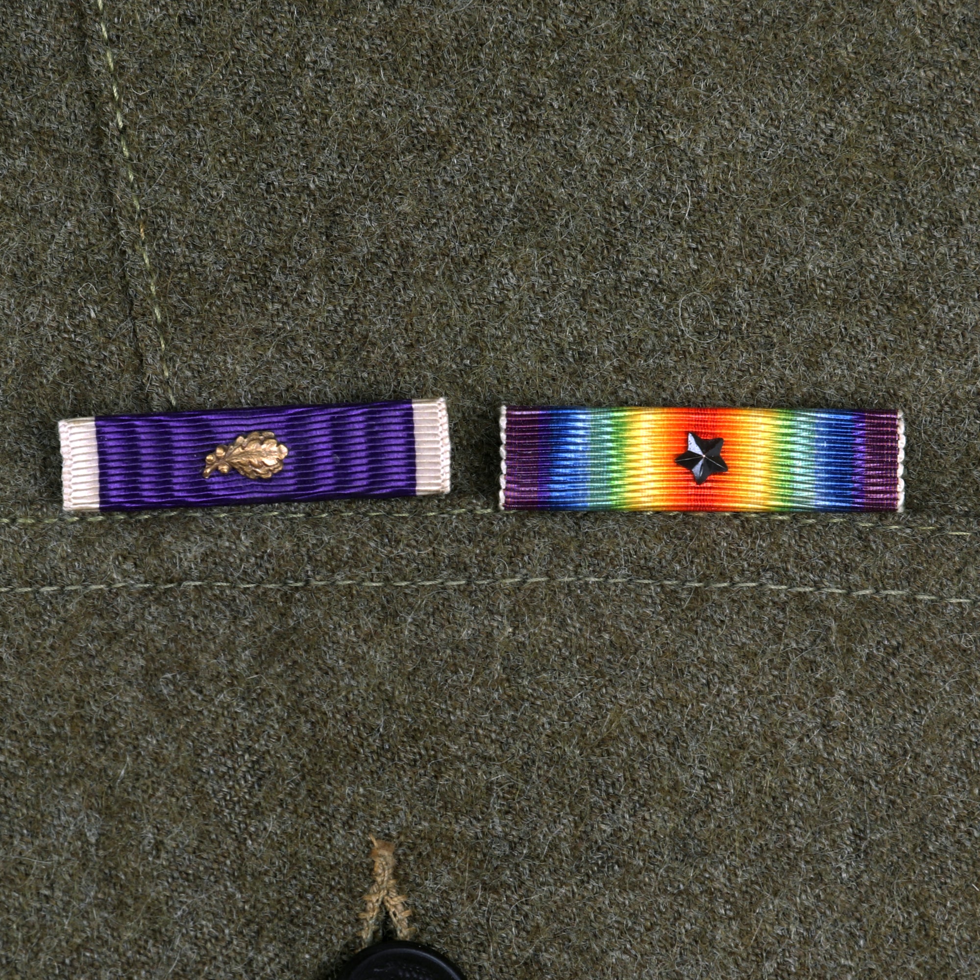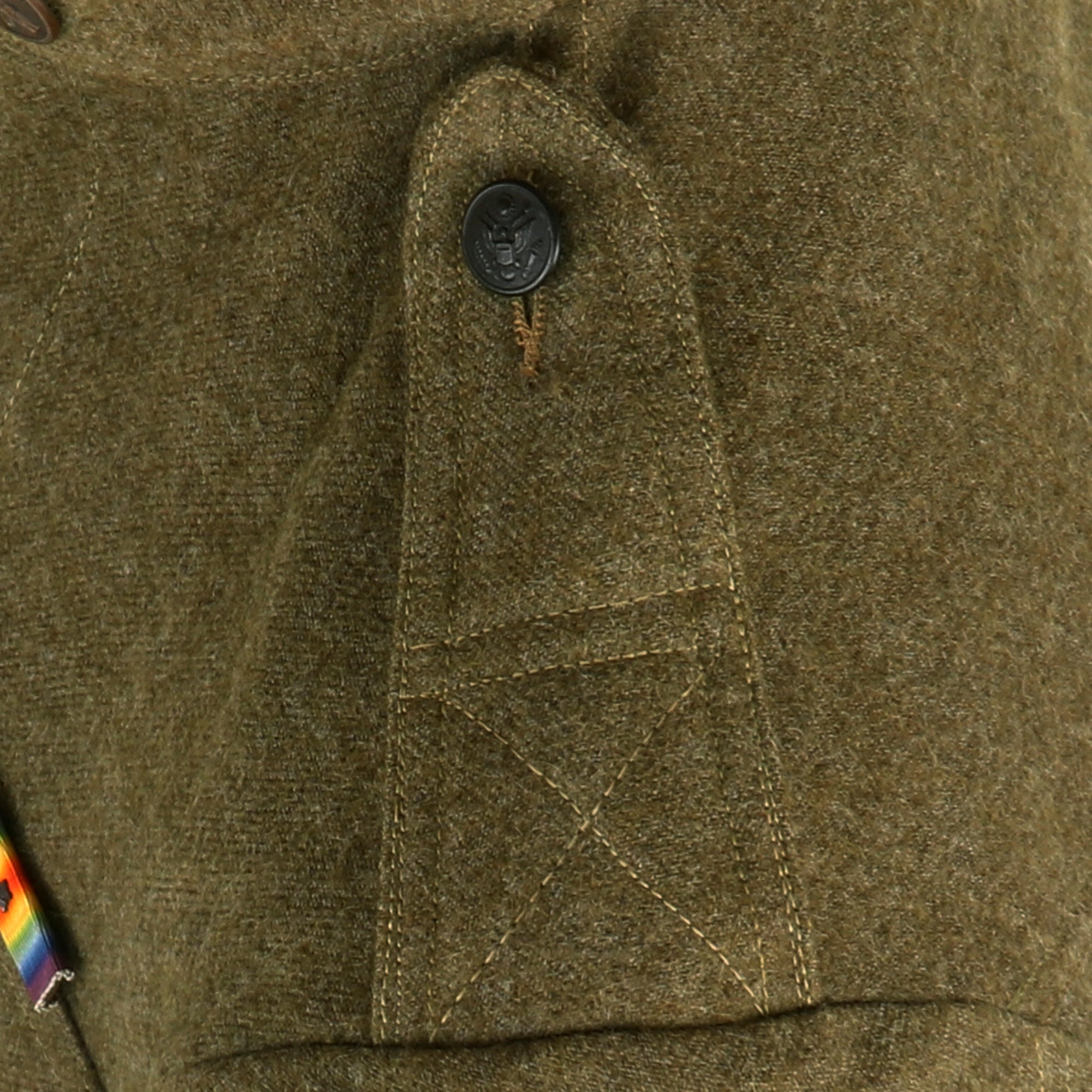 The tunic itself is in fantastic condition with signs of moderate wear, light moth nips and overall an excellent appearance. The lower left sleeve has 3 inverted overseas chevrons denoting 18 months overseas while the lower right sleeve has two wound stripes, reflecting the Purple Heart ribbon on the chest. The ribbons do appear to have been added for display purposes.