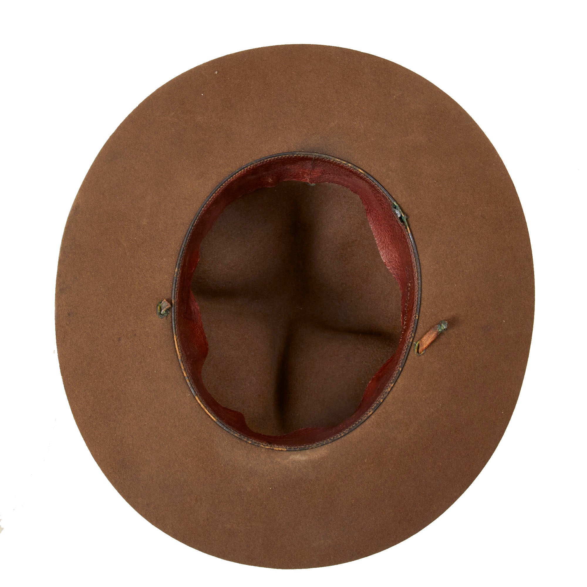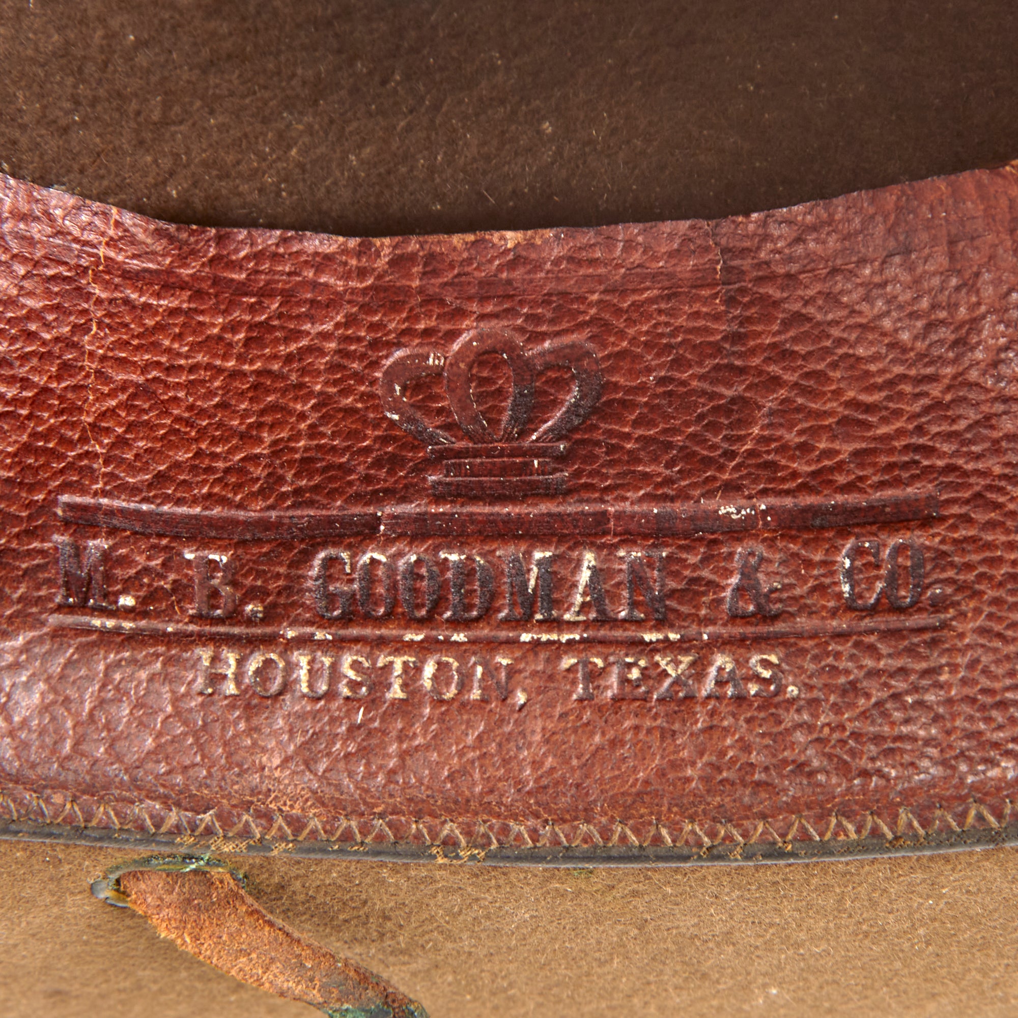 This M1911 Campaign hat has definitely seen a lot of service, with a cracked sweatband showing the maker’s logo of John B. Stetson and the logo of the retailer, M.B. Goodman & Co. of Houston, Texas. There is a black and gold officer’s hat cord around the helmet, indicating this soldier to be an officer, likely a Lieutenant or Captain. This example is missing nearly all of its chinstrap. It is roughly Size 7 ⅛.