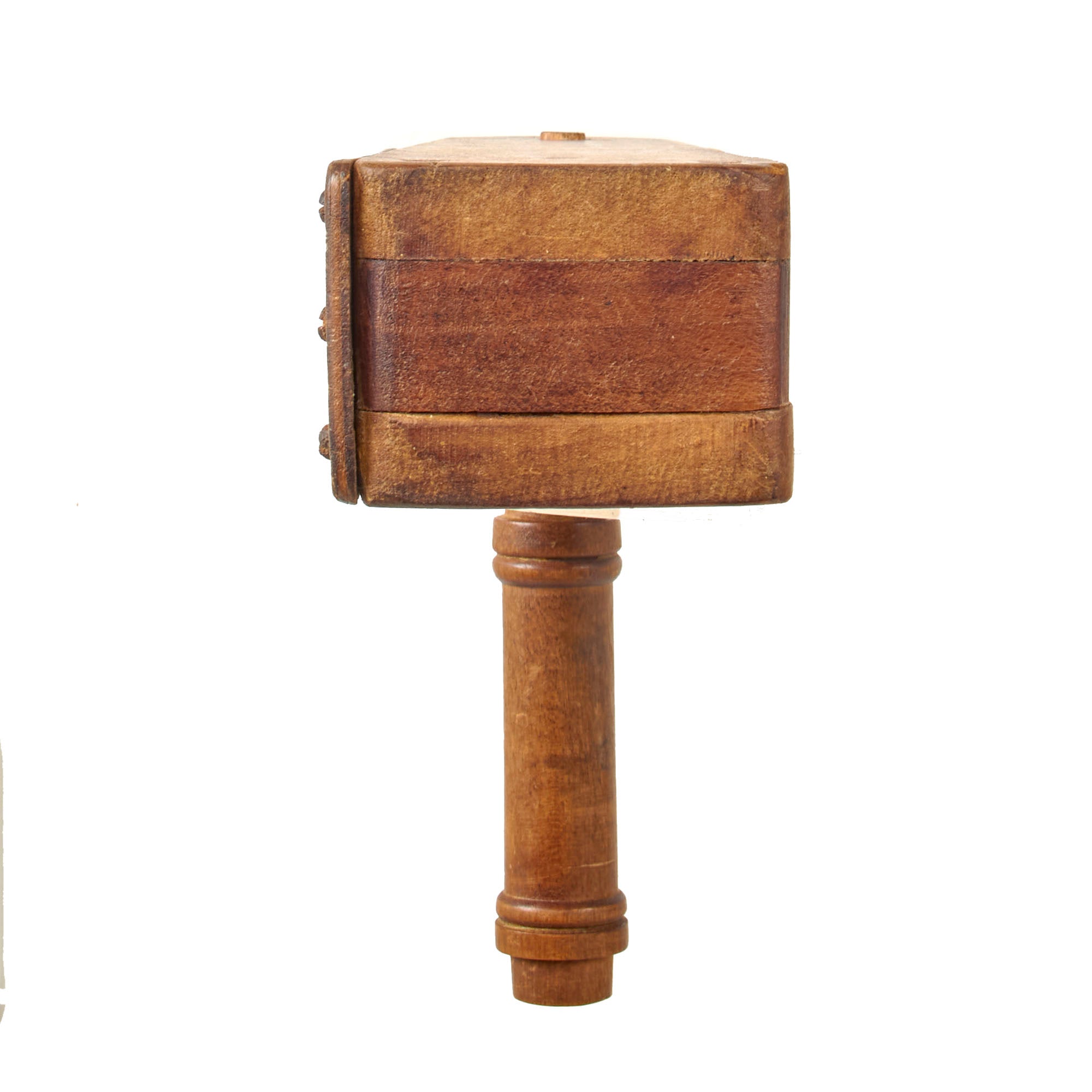 This example is somewhat simple, and looks to have been made with parts on hand. The rattle works fine but there is some minor cracking. There are no markings we could find anywhere on the rattle.