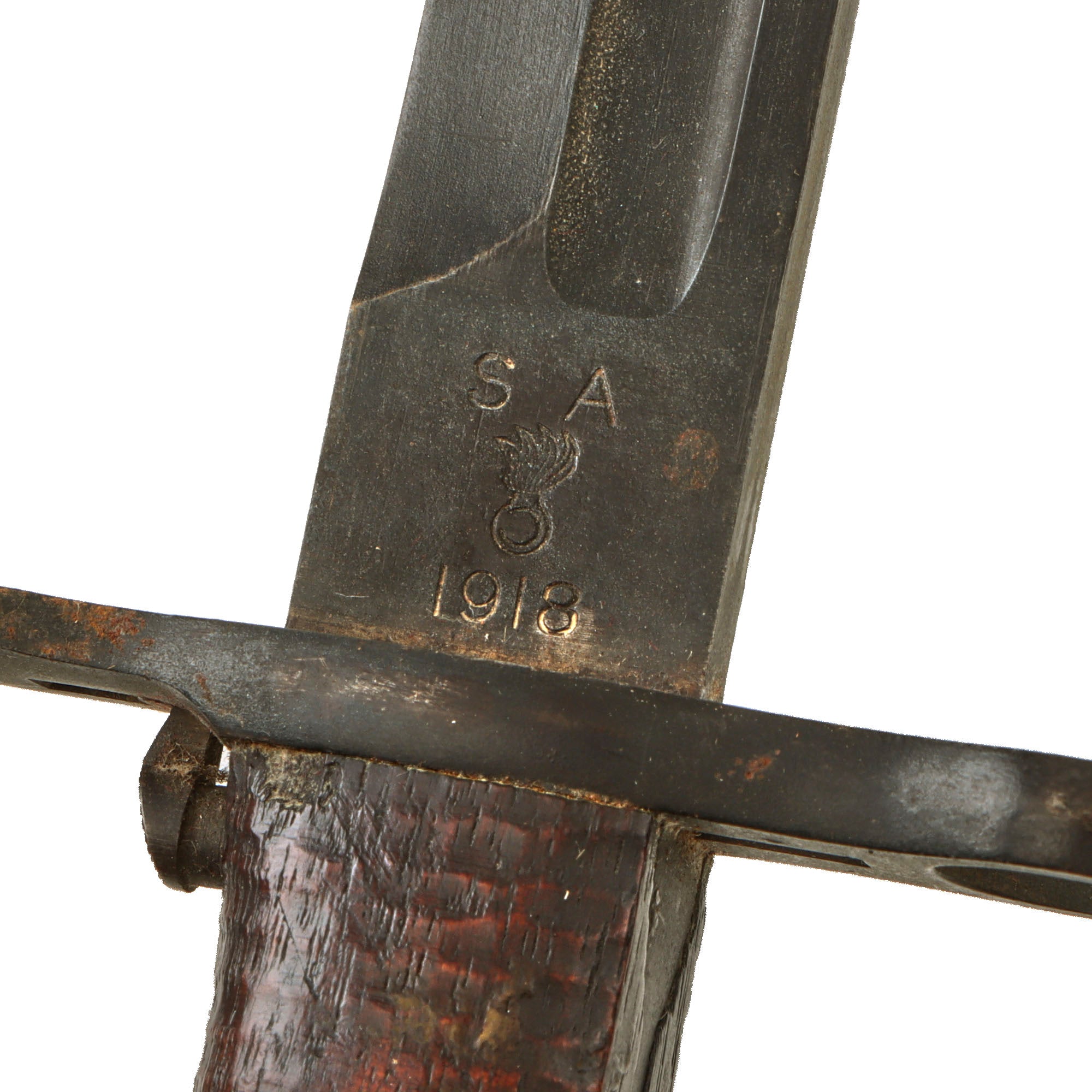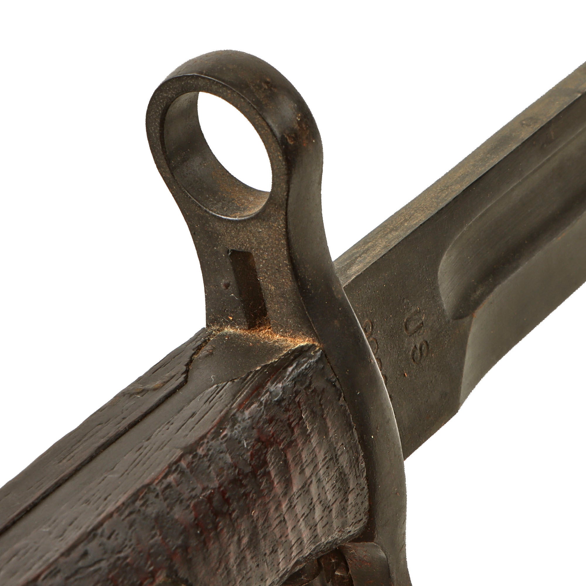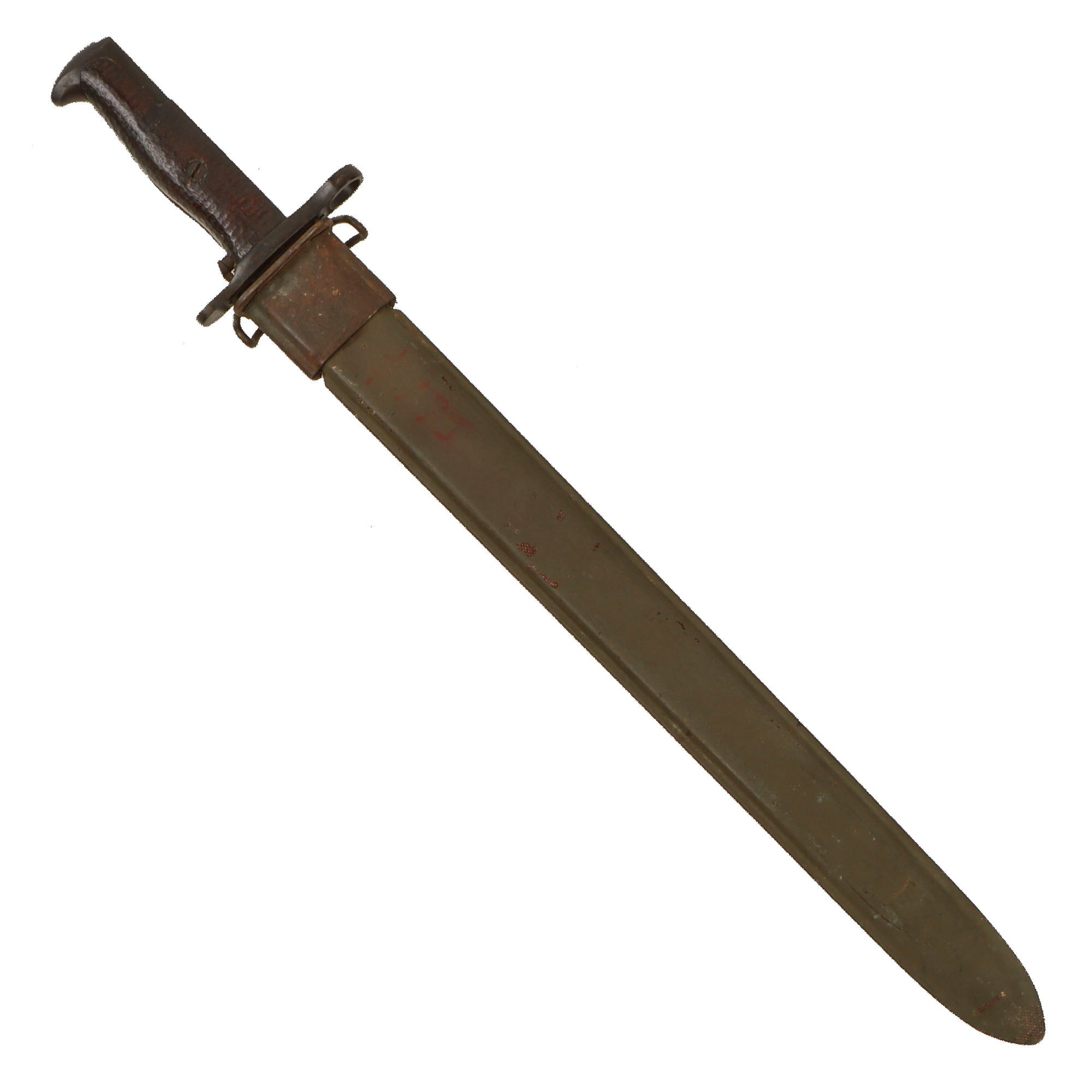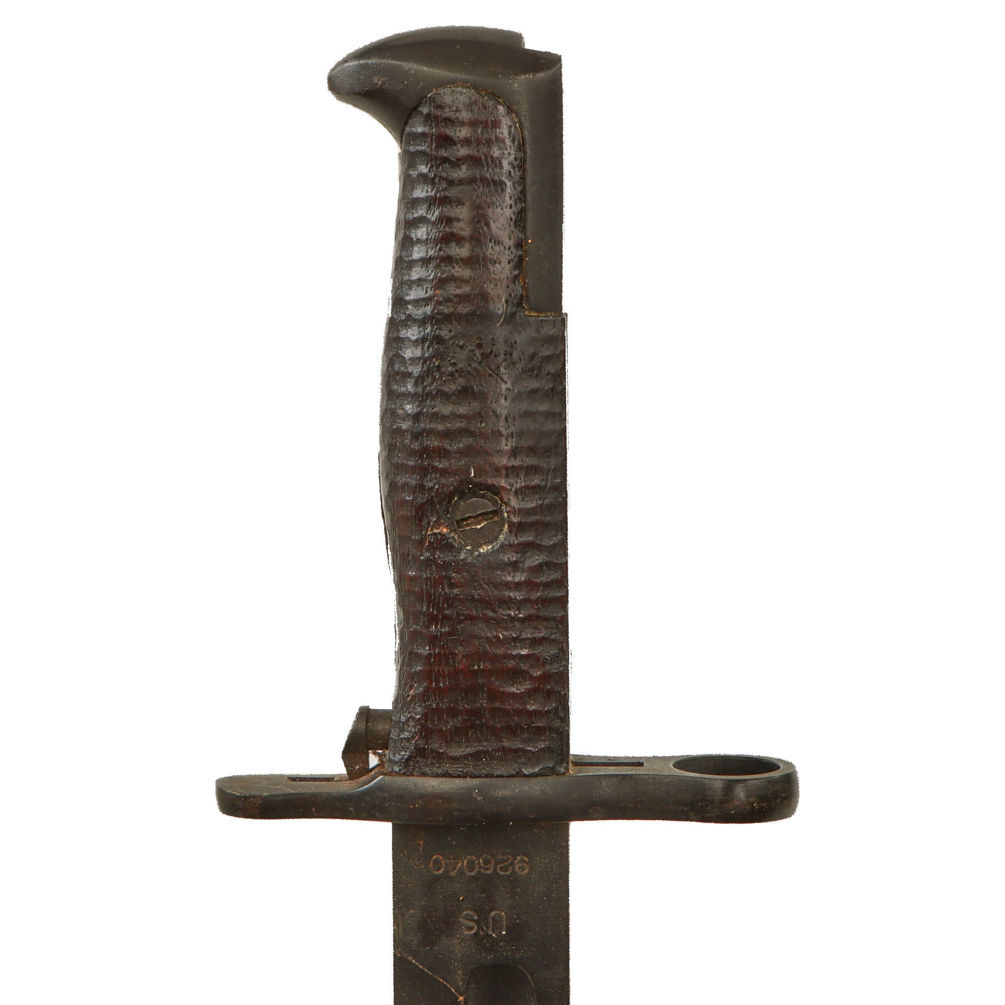 Original Item: Only One Available. This is a nice U.S. M1905 bayonet dated 1918, originally made during the late WWI period for the M1903 Springfield Rifle, which was then reissued in WWII for the M1 Garand Rifle. It is fitted with a WWII Issue M3 scabbard. The Garand was designed to take the same blade bayonet as the M1903 Springfield rifle, so at the beginning of the war they were issued with bayonets originally made for those rifles. Later in 1942 to keep up with wartime production, new orders for M1905 bayonets with plastic grips were sent out, which had plastic ribbed grips. This example thankfully has kept its original wooden grips which are in very good condition.