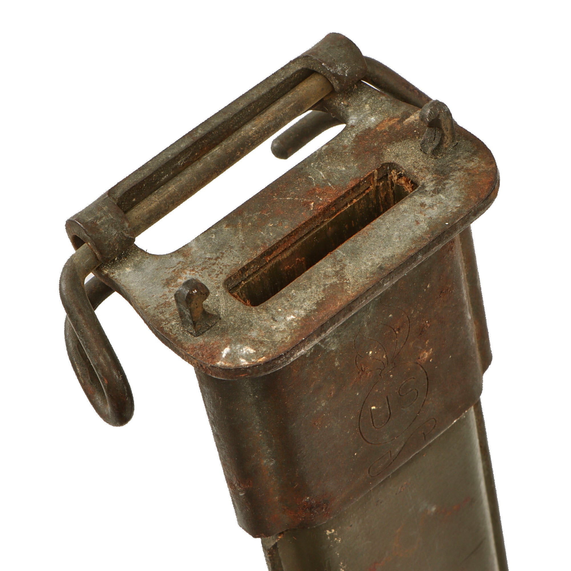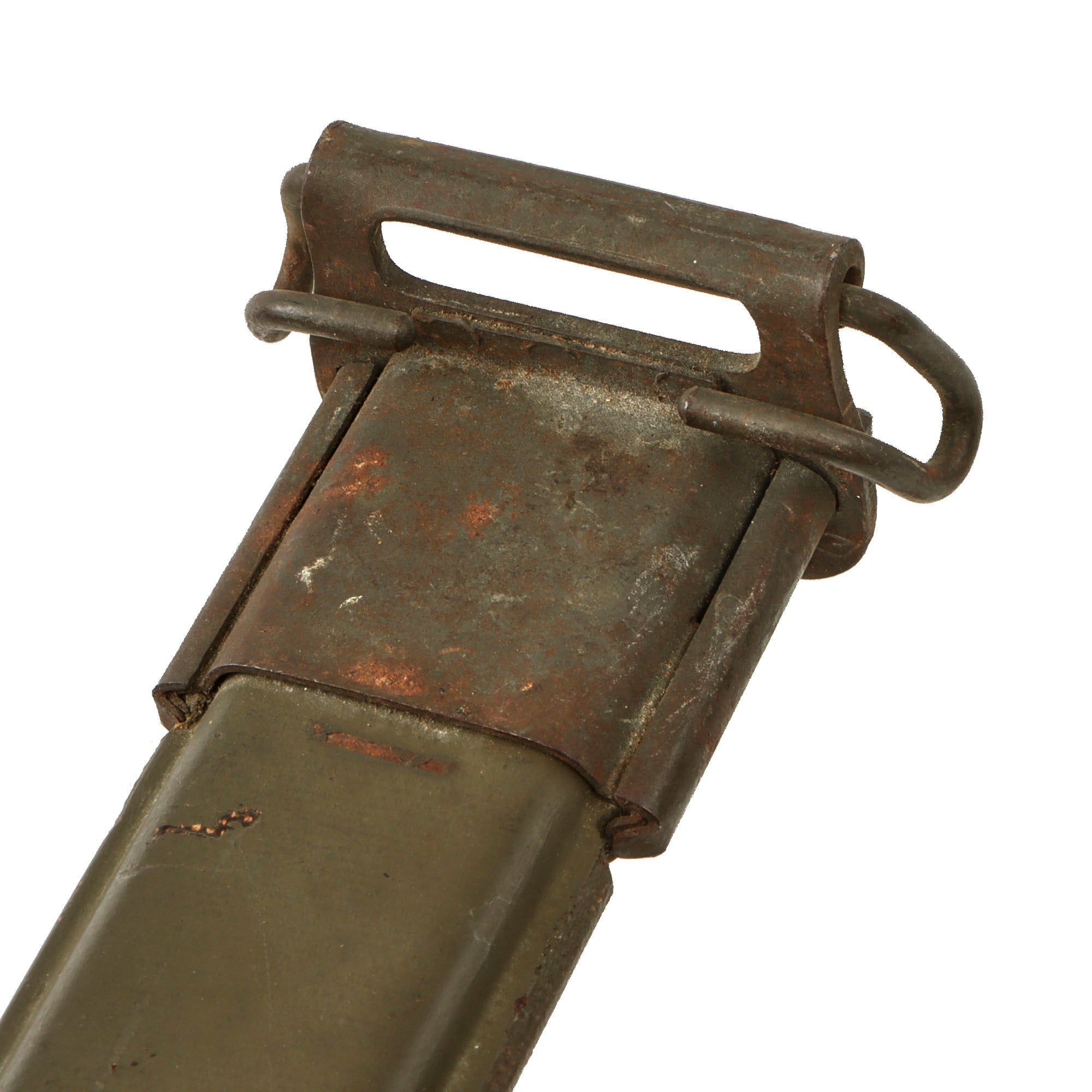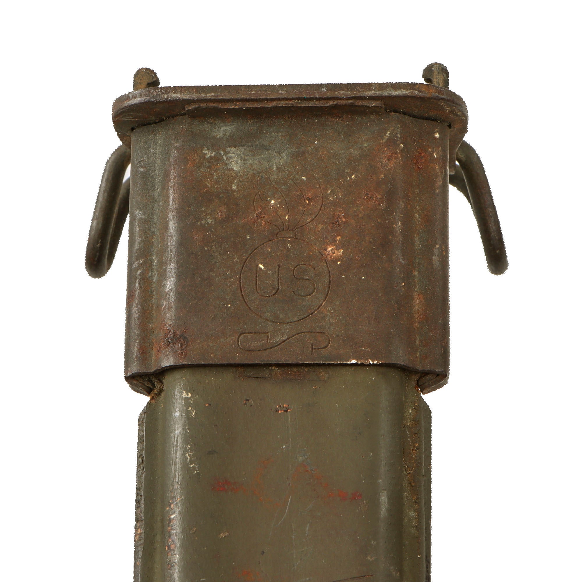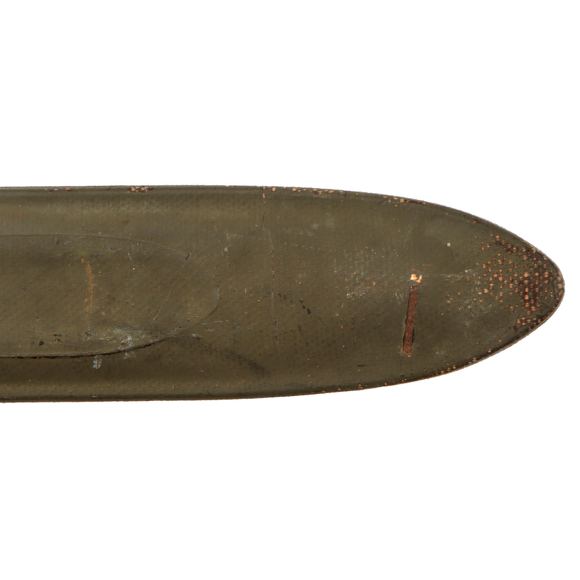 The original M3 scabbard is marked U.S. on the steel throat over the "Flaming Bomb", and is in very good condition. The throat of the scabbard is missing most of the original finish, with a bit of past oxidation showing. The scabbard body has no cracks or major chips, but the paint does show heavy wear.