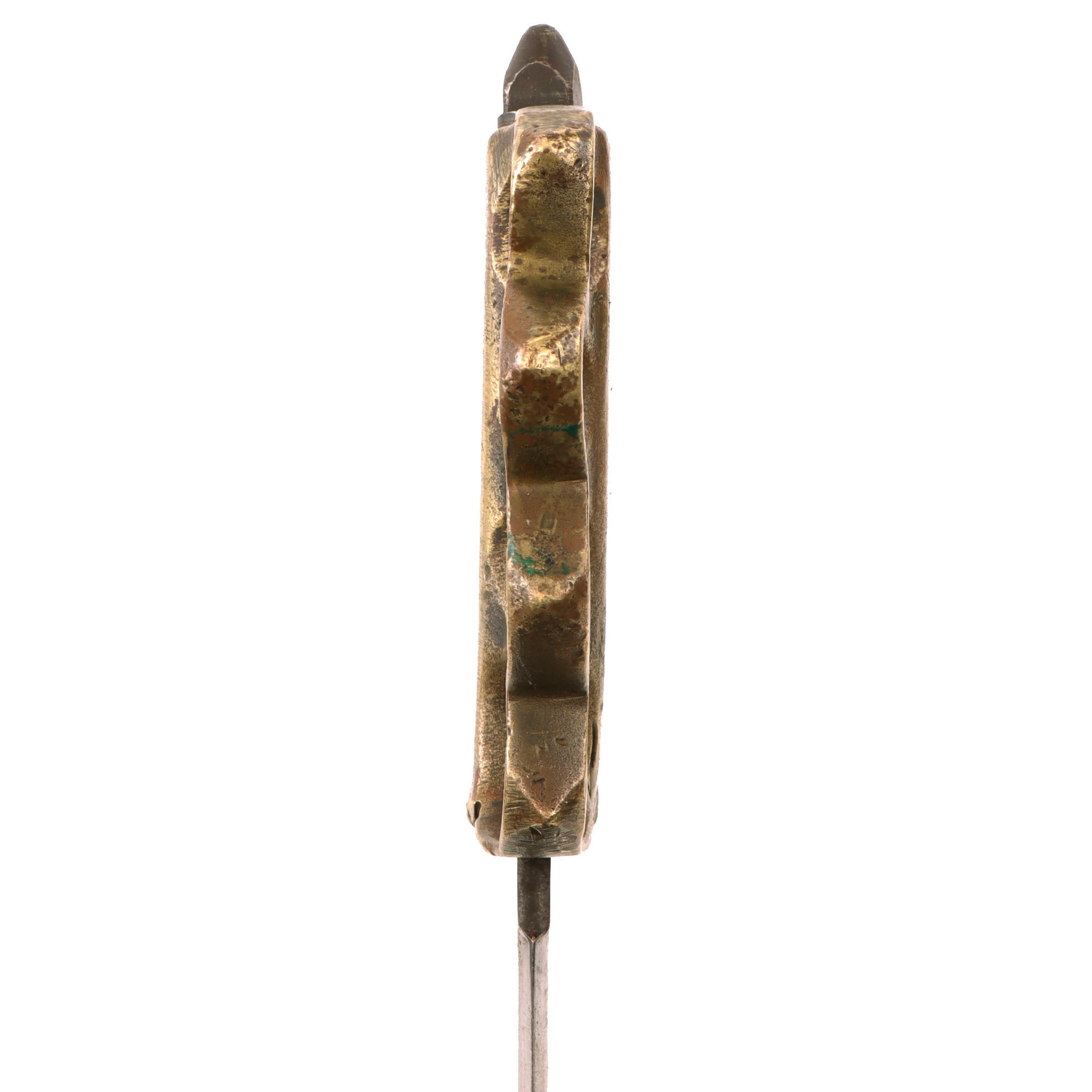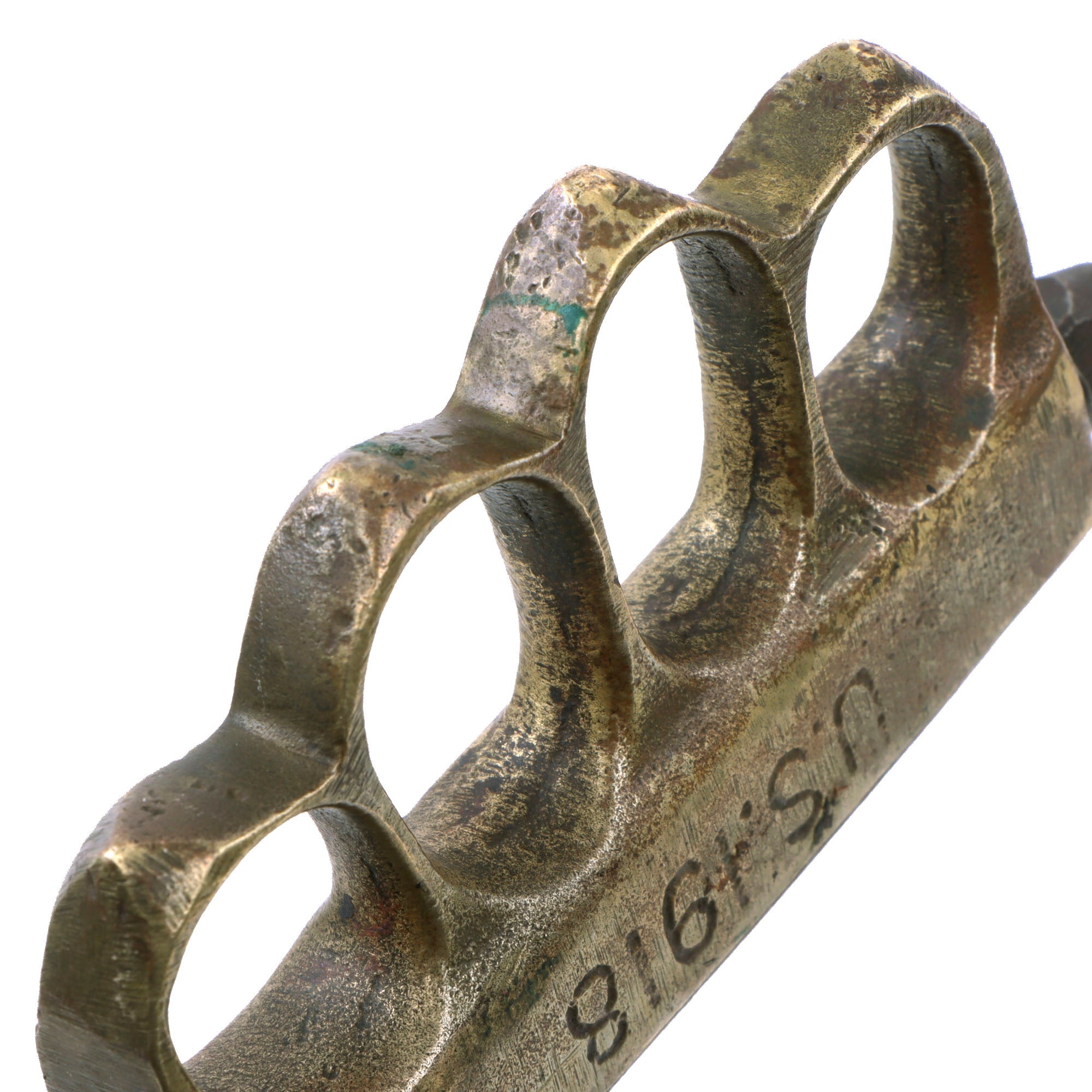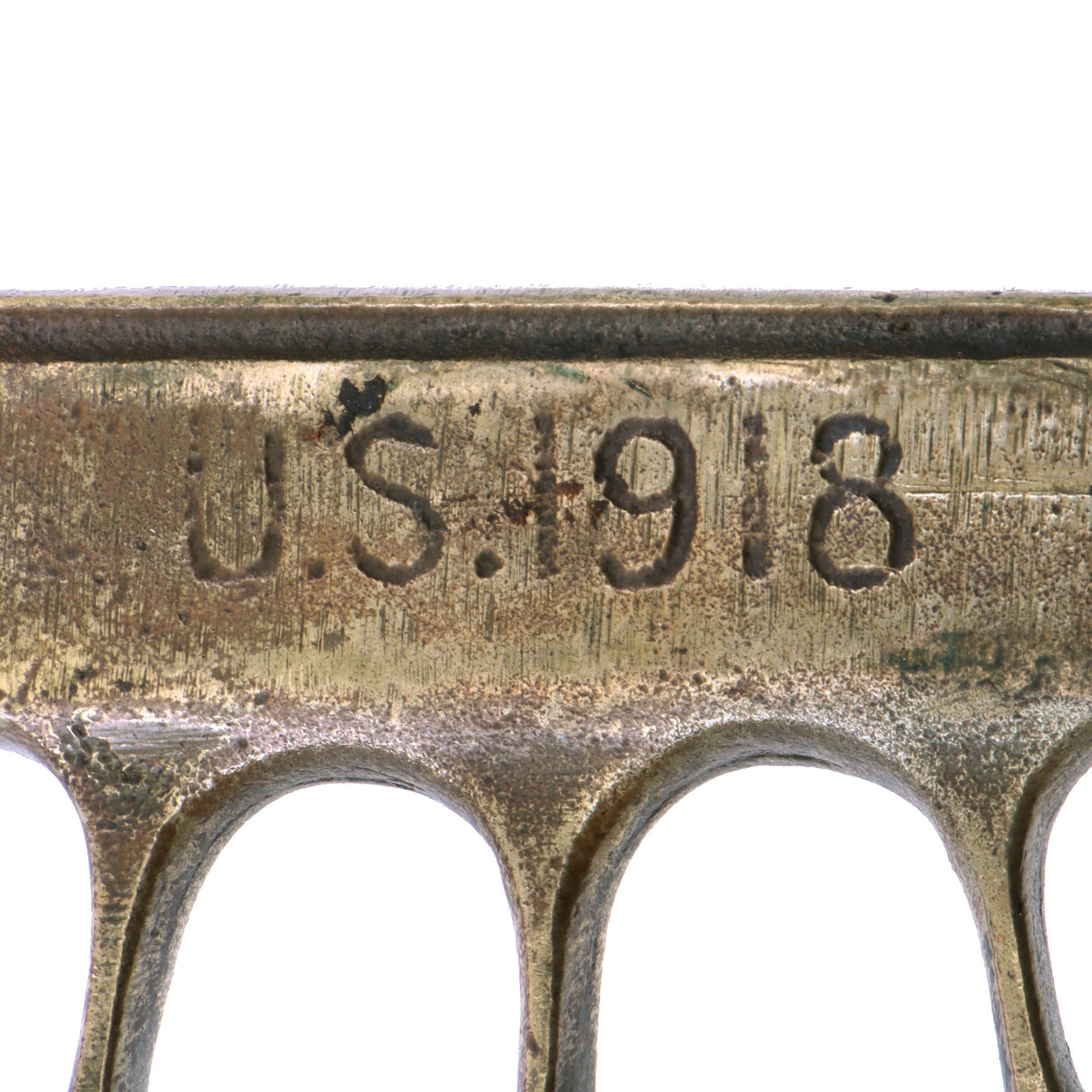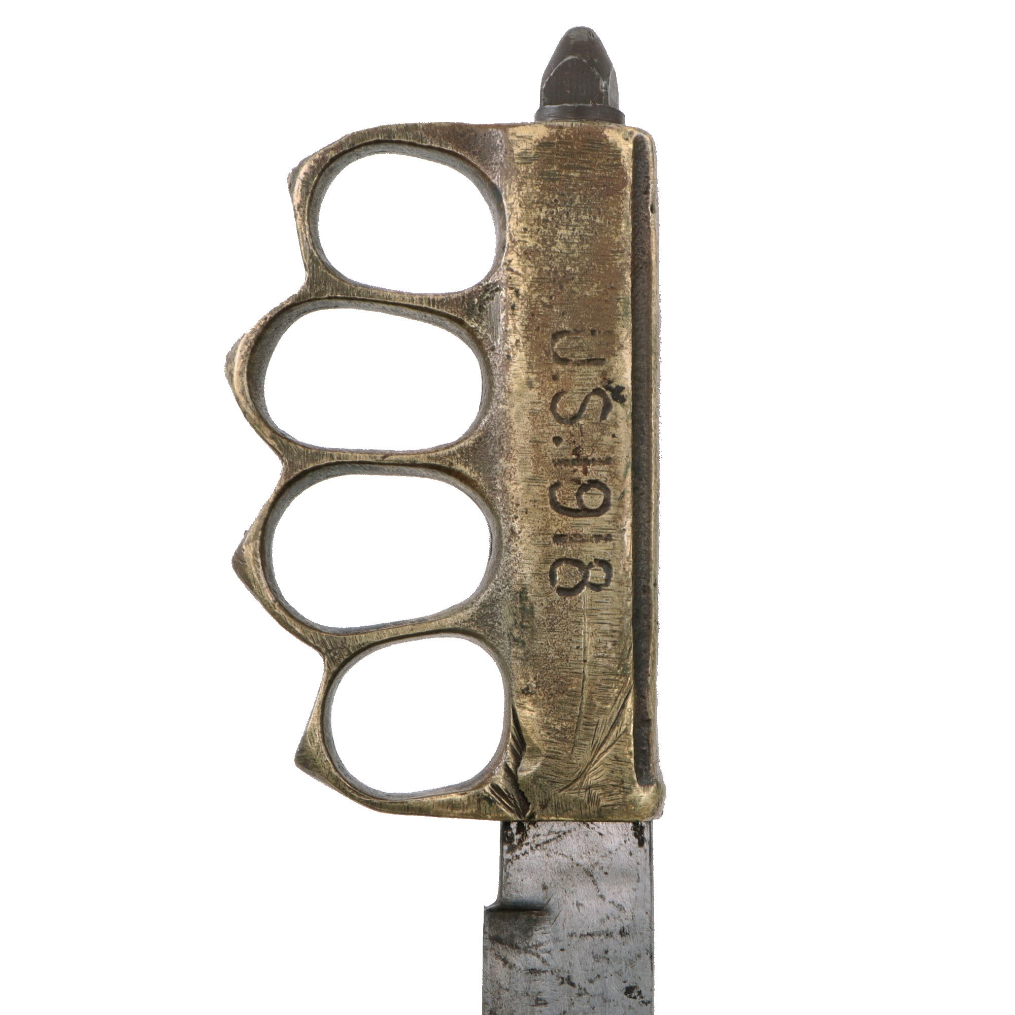 The brass grips are no longer darkened as it has been ground down on all sides when the crossguard was removed. They are still marked U.S. 1918. The blade shows moderate oxidation and scratching from when it was finished. The blade is very sharp and the pommel cap “skullcrusher” still holds the blade tight to the hilt. The overall length is 13” and the knuckles retain their original shape.