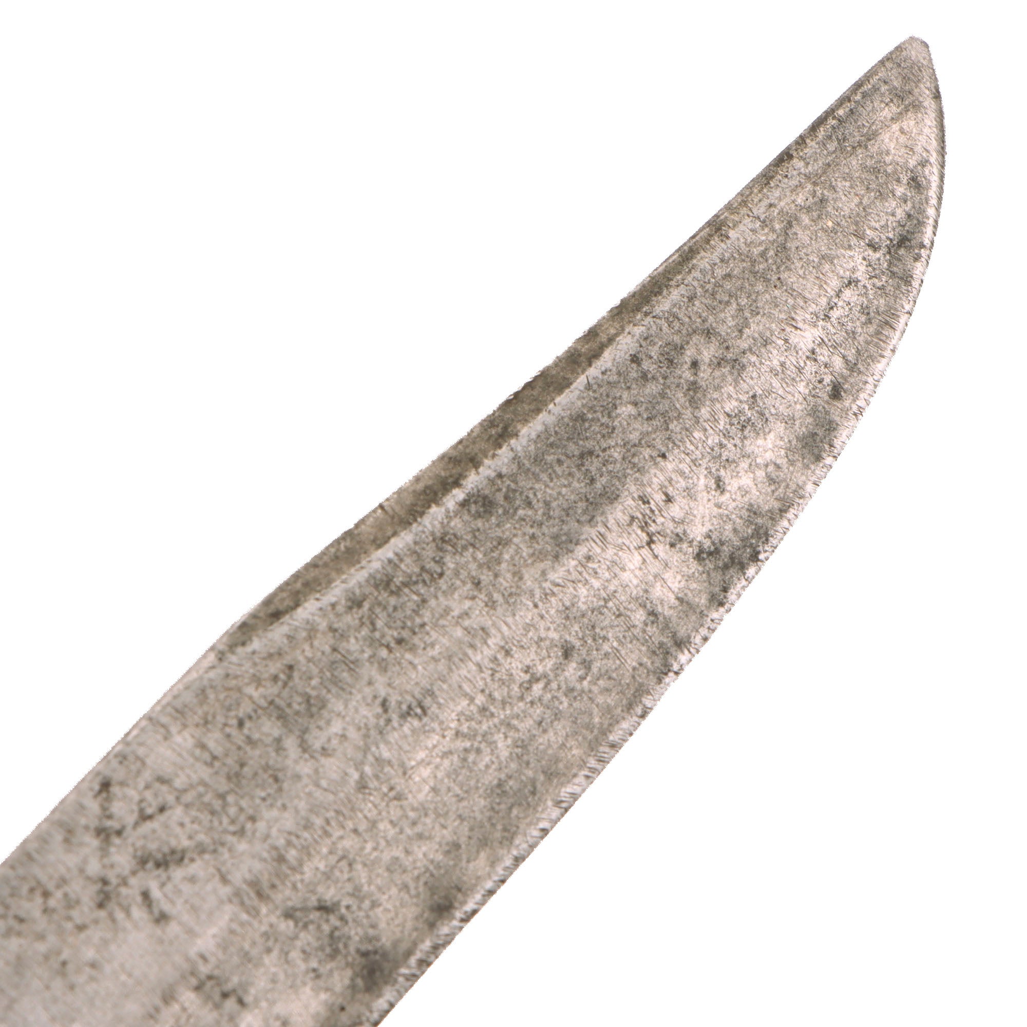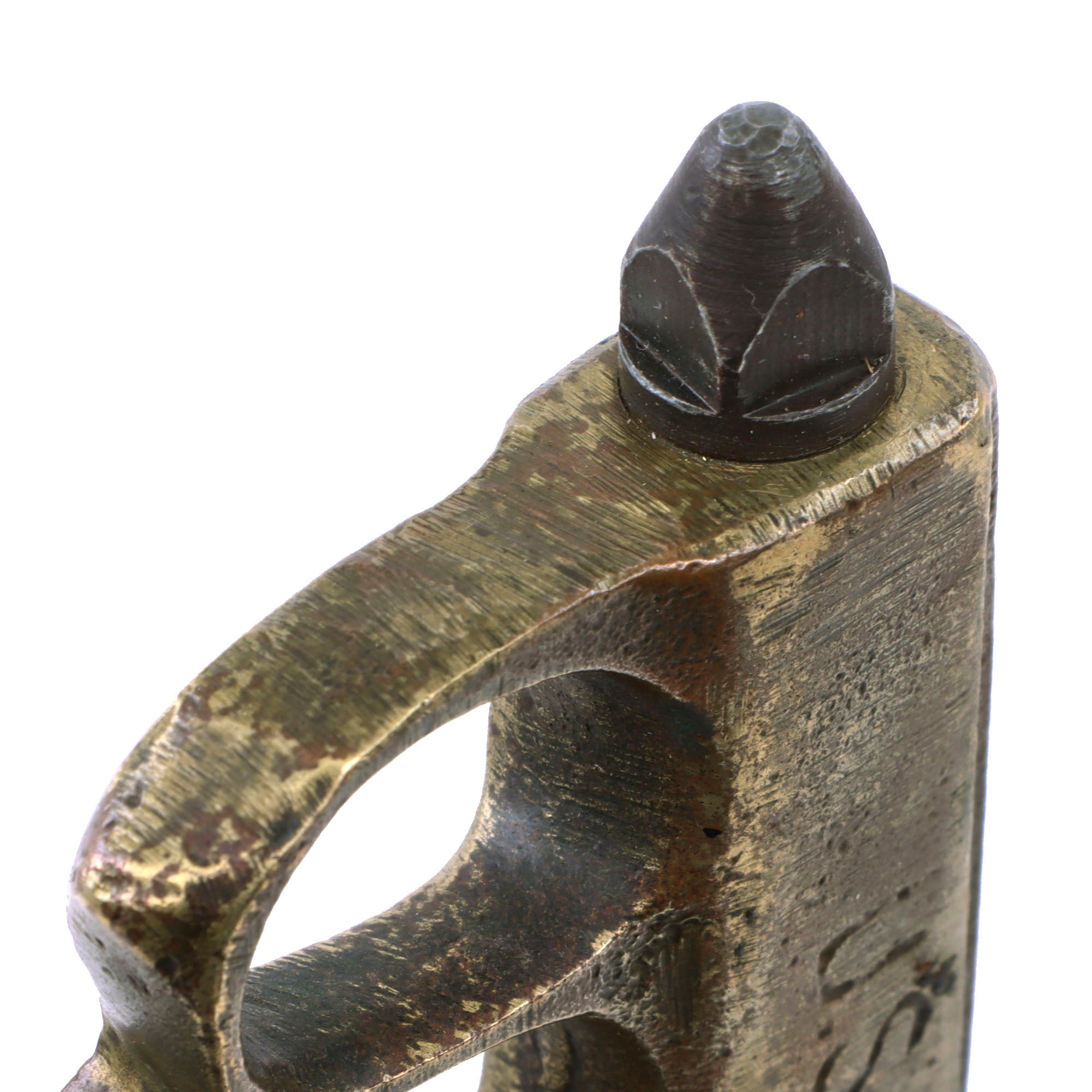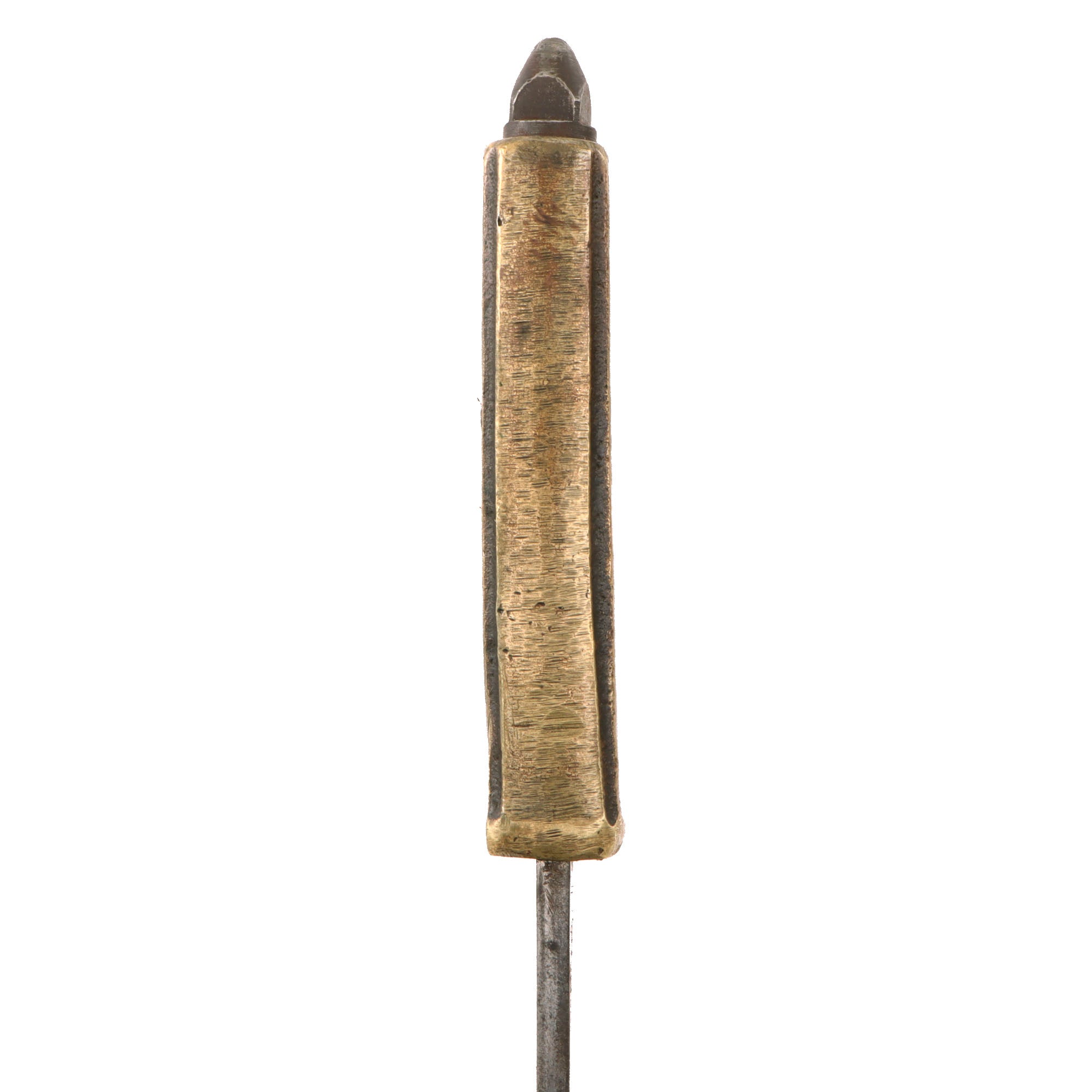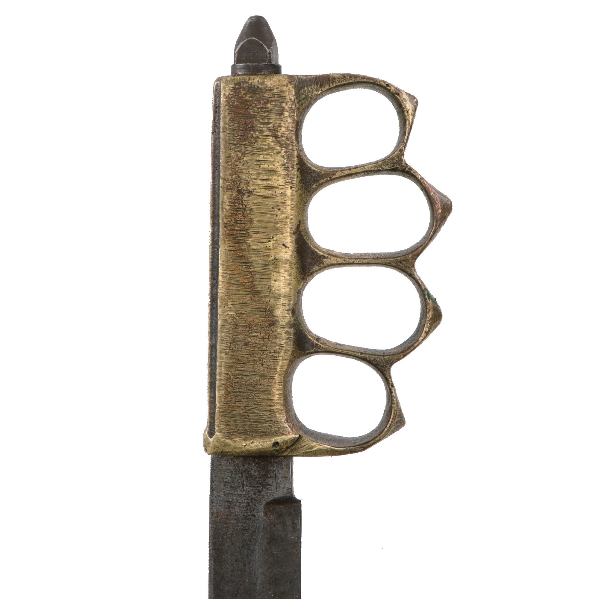 The brass grips are no longer darkened as it has been ground down on all sides when the crossguard was removed. They are still marked U.S. 1918. The blade shows moderate oxidation and scratching from when it was finished. The blade is very sharp and the pommel cap “skullcrusher” still holds the blade tight to the hilt. The overall length is 13” and the knuckles retain their original shape.