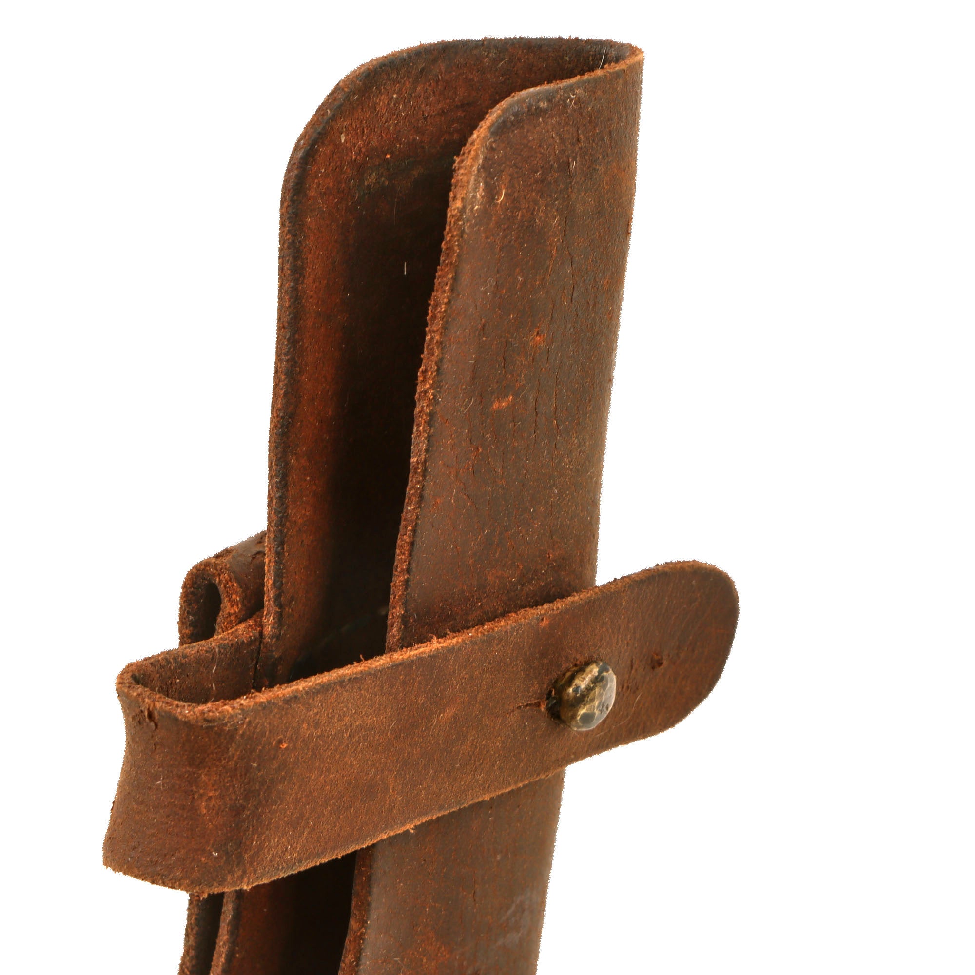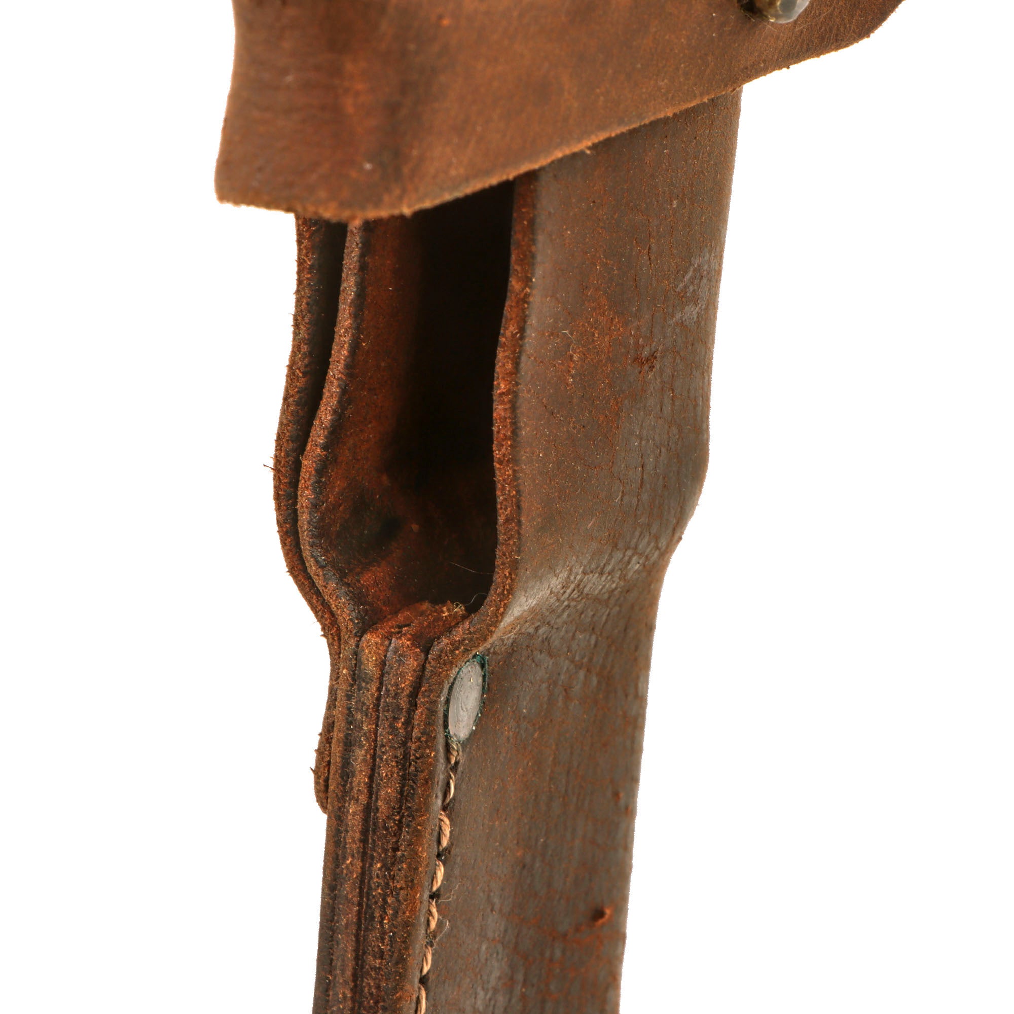 The 13 ⅝” custom scabbard covers the entire grip leaving the knuckles exposed, with a securing strap and knob to keep it in place. There is a belt loop riveted to the back. The entire scabbard has been applied with a heavy leather cleaner which has made the grip a bit slippery.